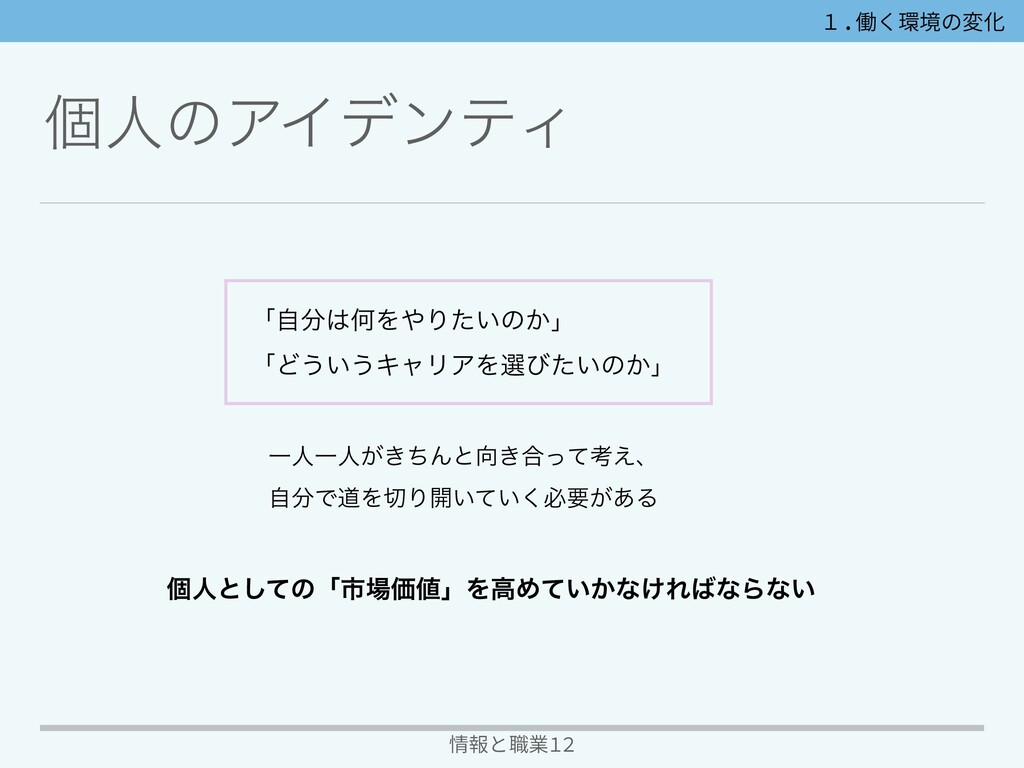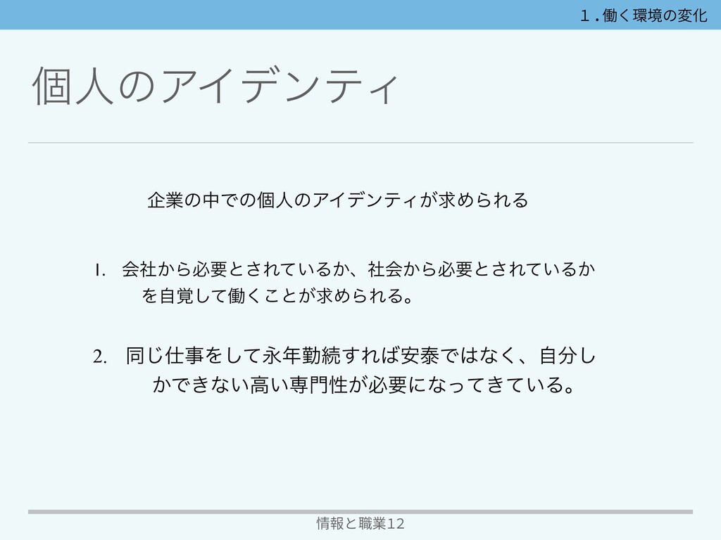 1.働く環境の変化 ݸਓͷΞΠσϯςΟ 情報と職業12 اۀͷதͰͷݸਓͷΞΠσϯςΟ͕ٻΊΒΕΔ 1. ձ͔ࣾΒඞཁͱ͞Ε͍ͯΔ͔ɺࣾձ͔Βඞཁͱ͞Ε͍ͯΔ͔ Λ֮ࣗͯ͠ಇ͘͜ͱ͕ٻΊΒΕΔɻ 2. ಉ͡ࣄΛͯ͠Ӭۈଓ͢Ε҆ହͰͳ͘ɺࣗ͠ ͔Ͱ͖ͳ͍ߴ͍ઐੑ͕ඞཁʹͳ͖͍ͬͯͯΔɻ