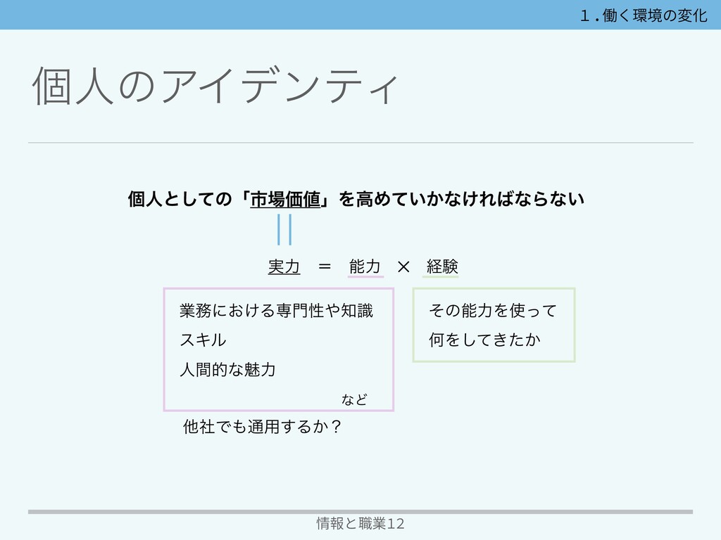 1.働く環境の変化 ݸਓͷΞΠσϯςΟ 情報と職業12 ݸਓͱͯ͠ͷʮࢢՁʯΛߴΊ͍͔ͯͳ͚ΕͳΒͳ͍ ࣮ྗɹʹɹೳྗɹ✕ɹܦݧ ۀʹ͓͚Δઐੑࣝ εΩϧ ਓؒతͳັྗ ɹɹɹɹɹɹɹɹɹɹͳͲ ଞࣾͰ௨༻͢Δ͔ʁ