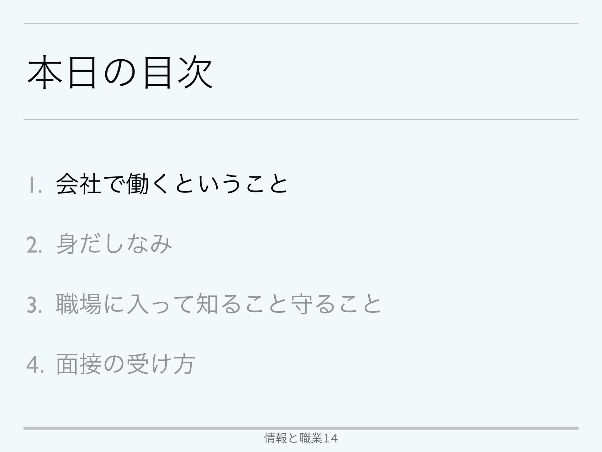 ຊͷ࣍ 1. ձࣾͰಇ͘ͱ͍͏͜ͱ 2. ͩ͠ͳΈ 3. ৬ʹೖͬͯΔ͜ͱकΔ͜ͱ 4. ໘ͷड͚ํ 情報と職業14