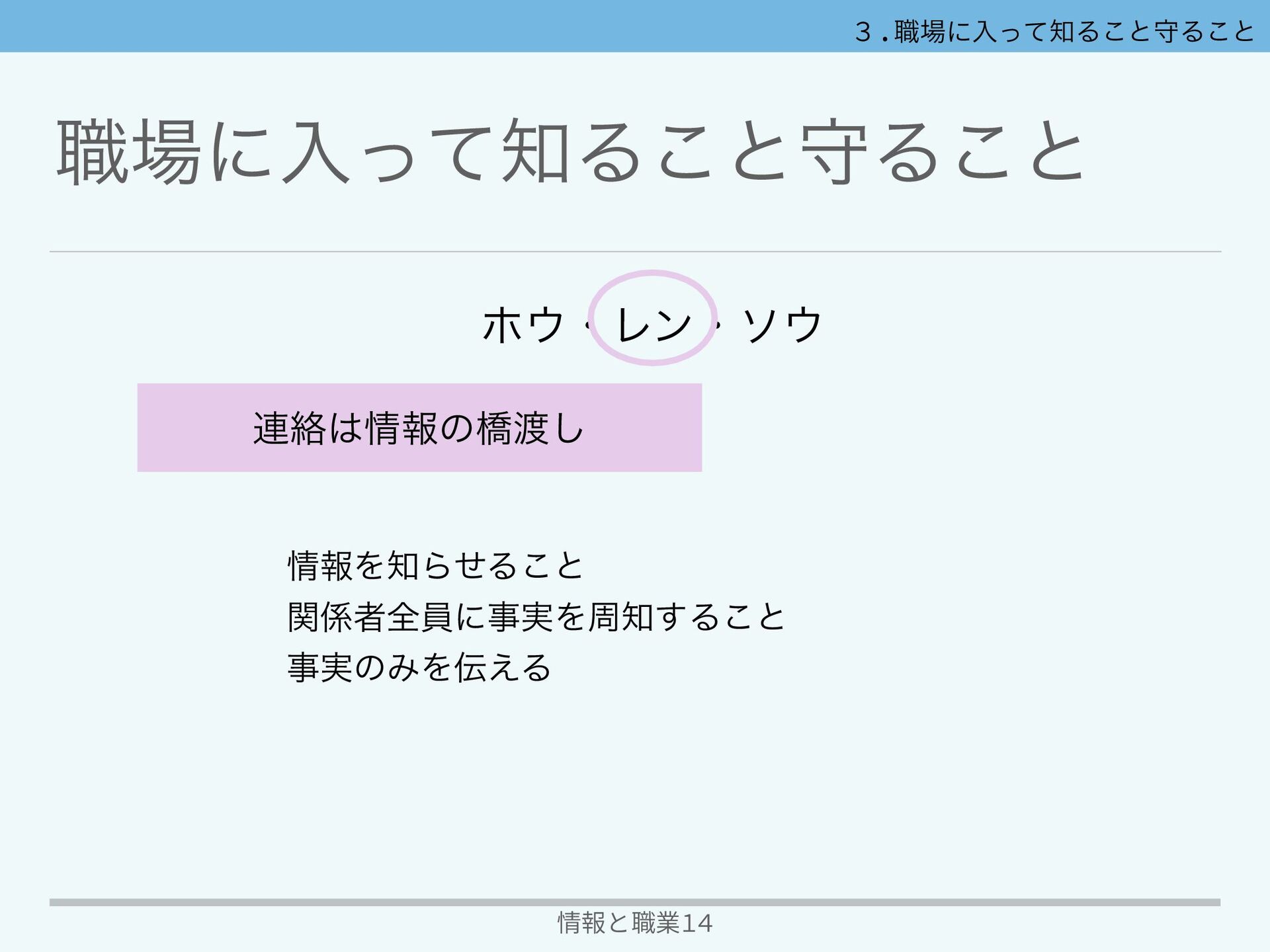 ৬ʹೖͬͯΔ͜ͱकΔ͜ͱ 情報と職業14 ϗɾϨϯɾι ใΛΒͤΔ͜ͱ ؔऀશһʹࣄ࣮Λप͢Δ͜ͱ ࣄ࣮ͷΈΛ͑Δ ࿈བྷใͷڮ͠ 3.職場にೖͬͯΔ͜ͱकΔ͜ͱ