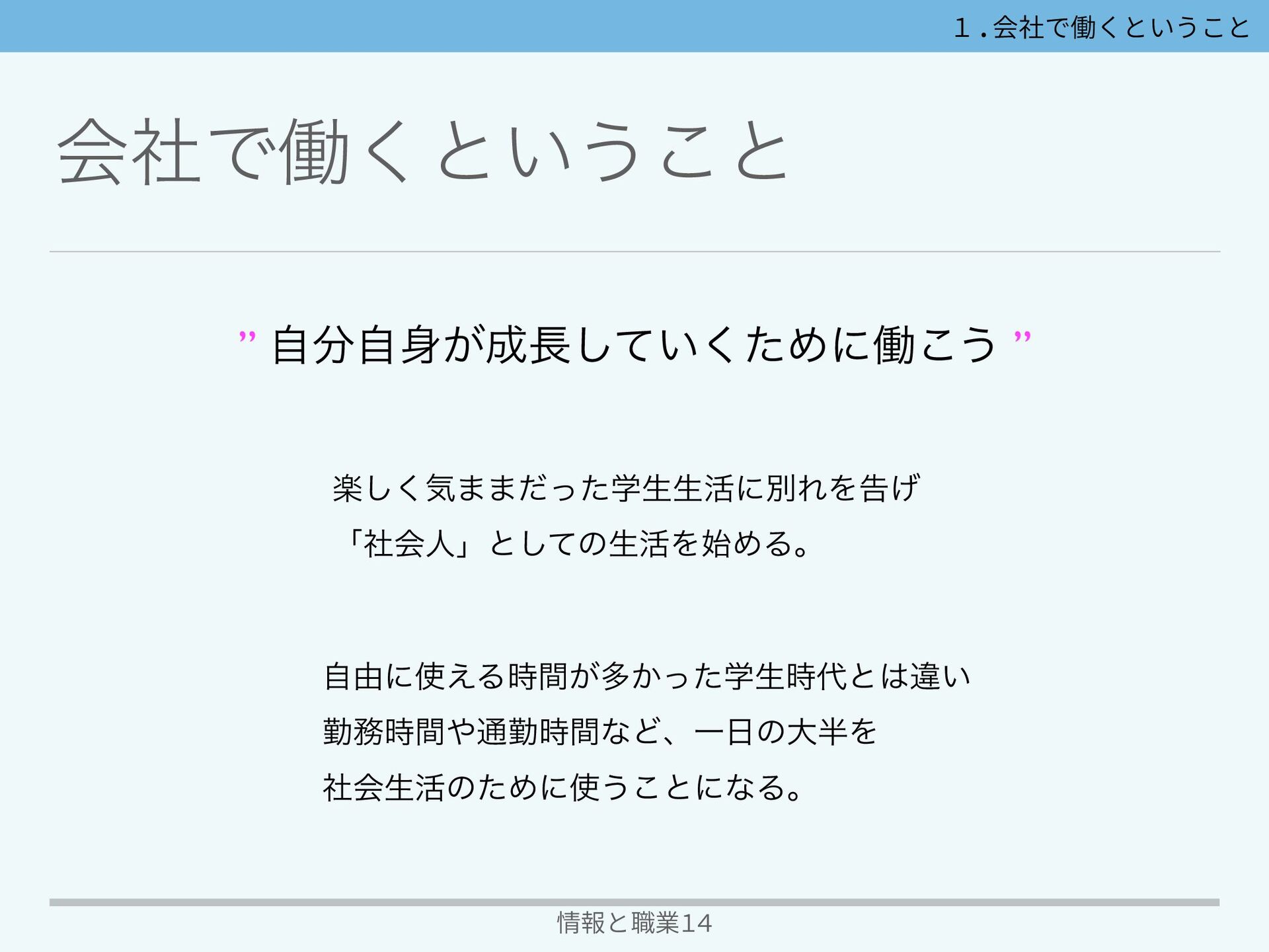 1.会社で働くということ ձࣾͰಇ͘ͱ͍͏͜ͱ 情報と職業14 ָ͘͠ؾ··ֶͩͬͨੜੜ׆ʹผΕΛࠂ͛ ʮࣾձਓʯͱͯ͠ͷੜ׆Λ࢝ΊΔɻ ࣗ༝ʹ͑Δ͕࣌ؒଟֶ͔ͬͨੜ࣌ͱҧ͍ ۈ࣌ؒ௨ۈ࣌ؒͳͲɺҰͷେΛ ࣾձੜ׆ͷͨΊʹ͏͜ͱʹͳΔɻ ” ͕͍ࣗࣗͯͨ͘͠Ίʹಇ͜͏