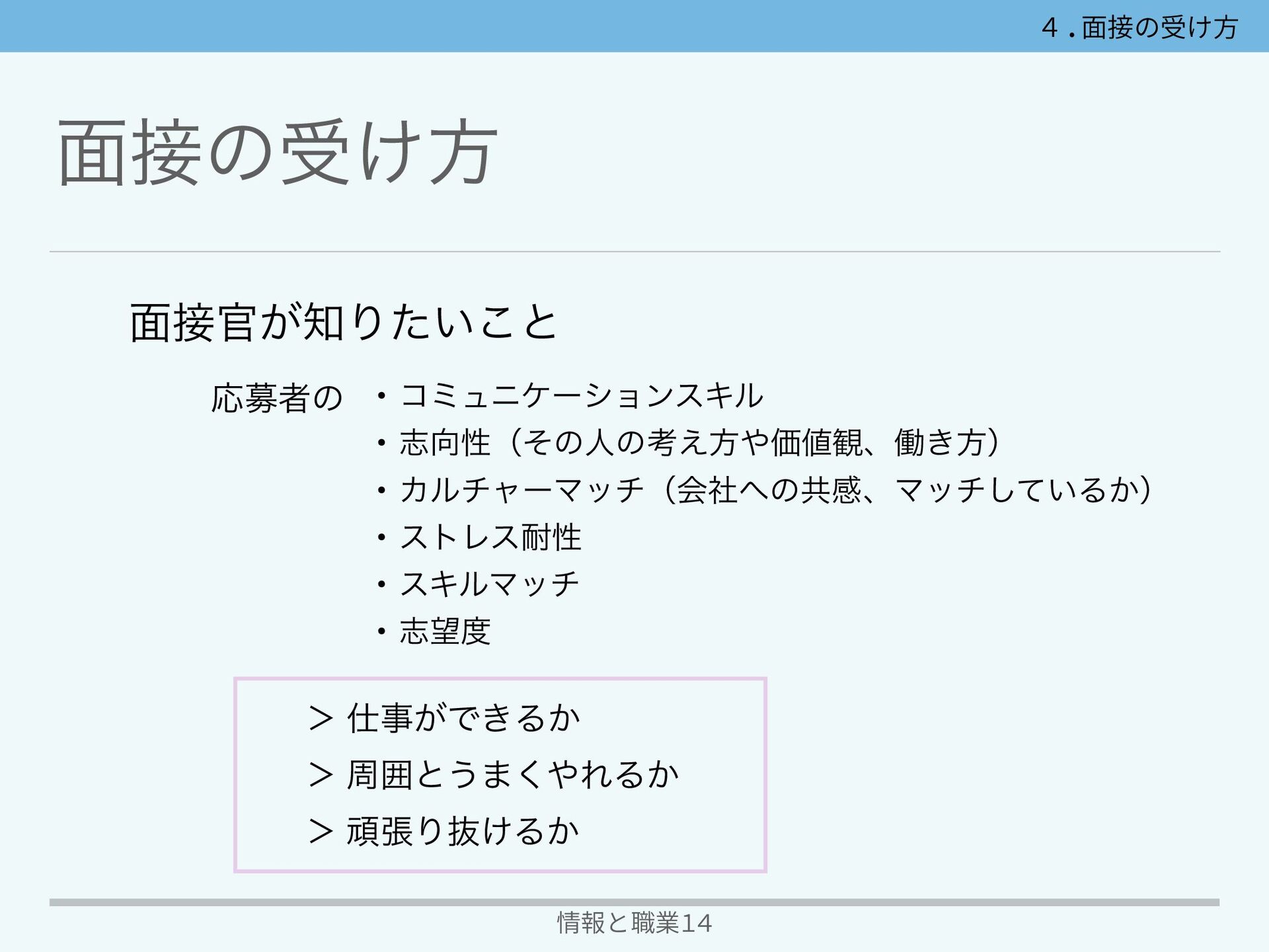 ໘ͷड͚ํ 情報と職業14 ѹഭ໘ Ͳ͏Ͱ͍͍Α͏ͳਓͷ߹ɺͨΓোΓͷͳ͍࣭ͰૣΊʹ Γ্͛Α͏ͱ͢Δͱͷ͜ͱͳͷͰɺ͋͑ͯ࣌ؒΛ͔͚ͯ·Ͱѹഭ ٕ๏Λֻ͚ͯ͘ΔΑ͏ͳΒɺࣗͷ͜ͱΛͬͱਂ͘Γͨ ͕͍ͬͯΔΜͩͱɺϙδςΟϒʹߟ͑·͠ΐ͏ 4.⾯接の受け⽅