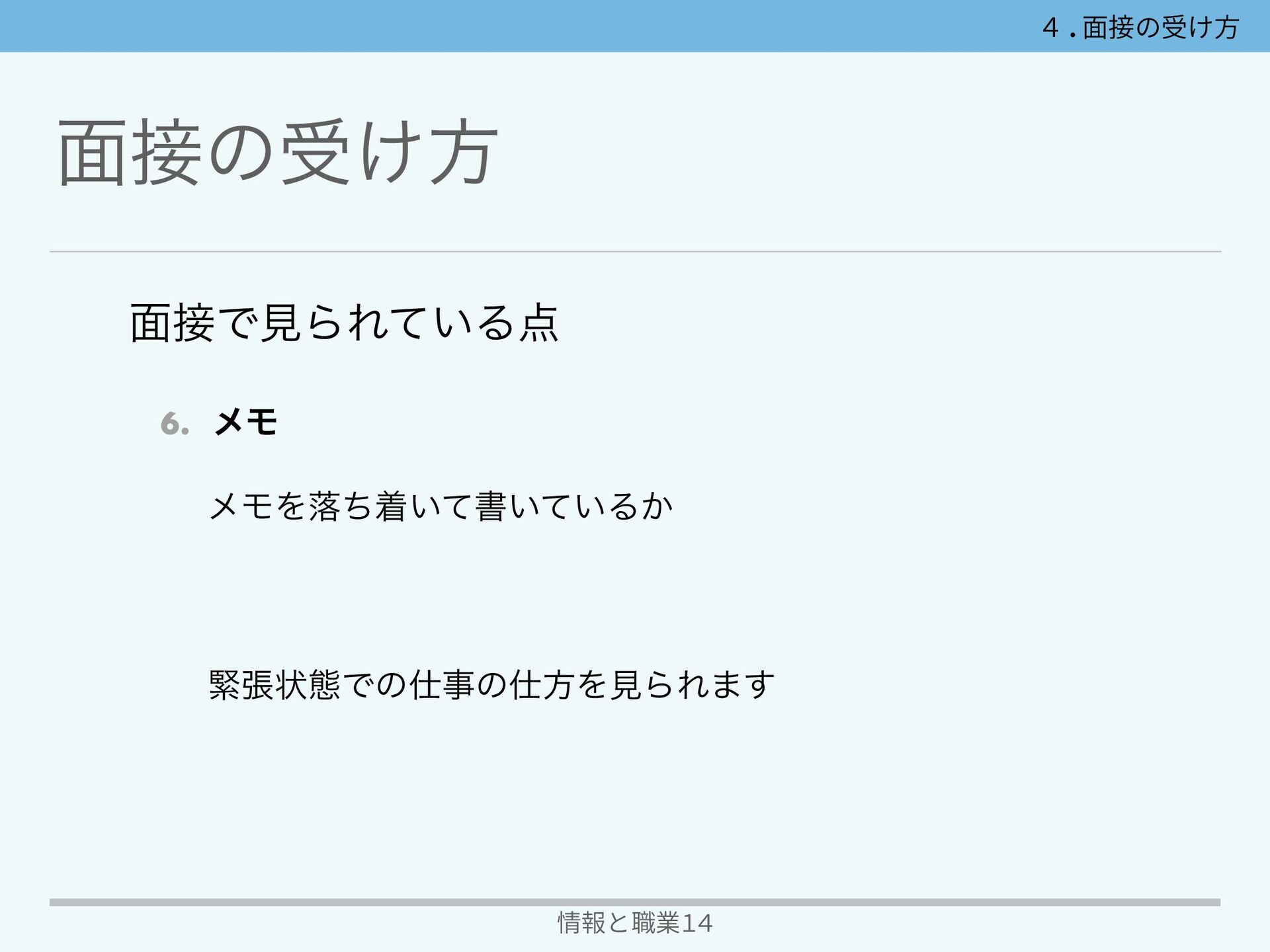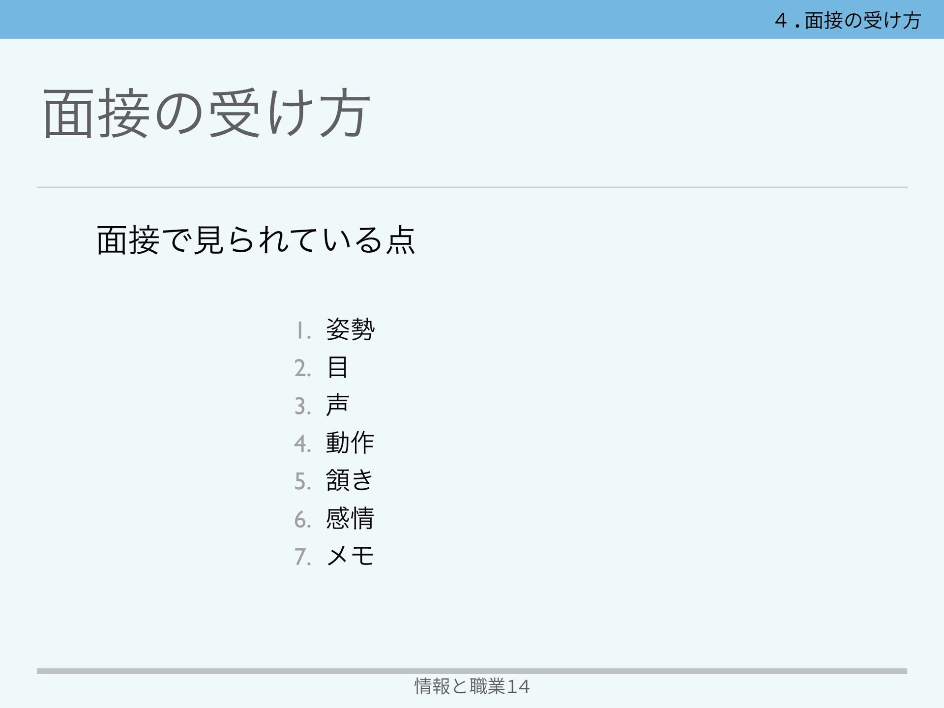 ໘ͷड͚ํ 情報と職業14 ໘ͰݟΒΕ͍ͯΔ 1. ࢟ ೖࣨͷํɺา͖ํɺҜࢠͷ࠲Γํɺ࢟ ۃʹ͓Ͳ͓Ͳ͠ͳ͍Α͏ʹҙ͠·͠ΐ͏ 4.⾯接の受け⽅