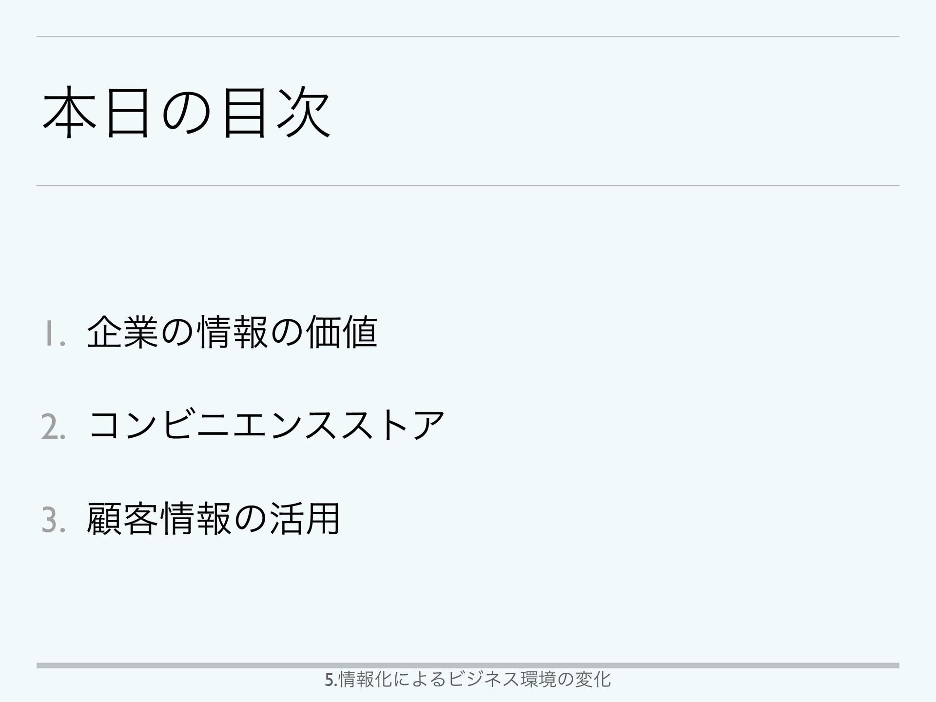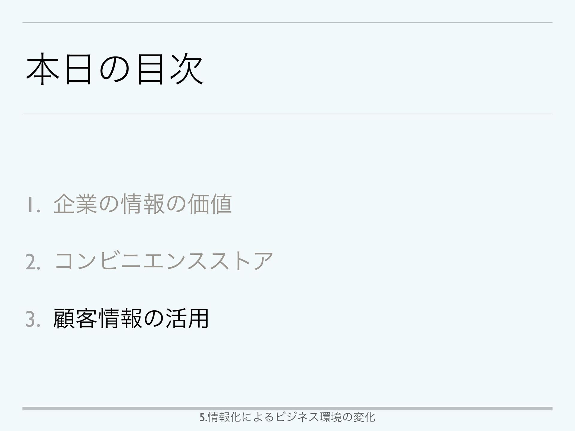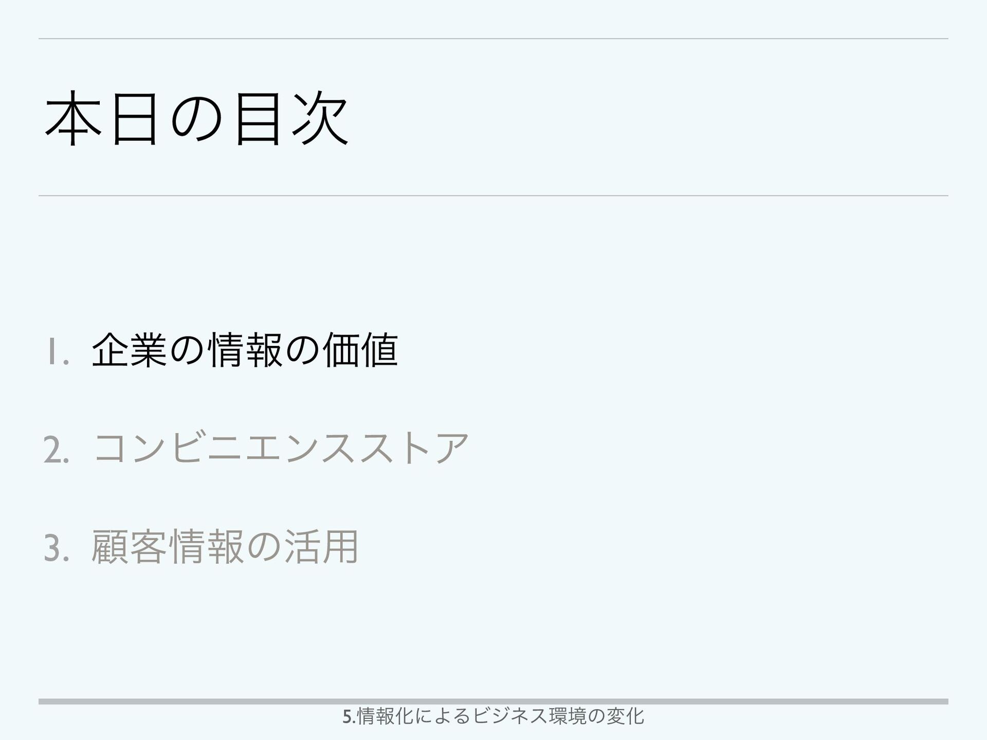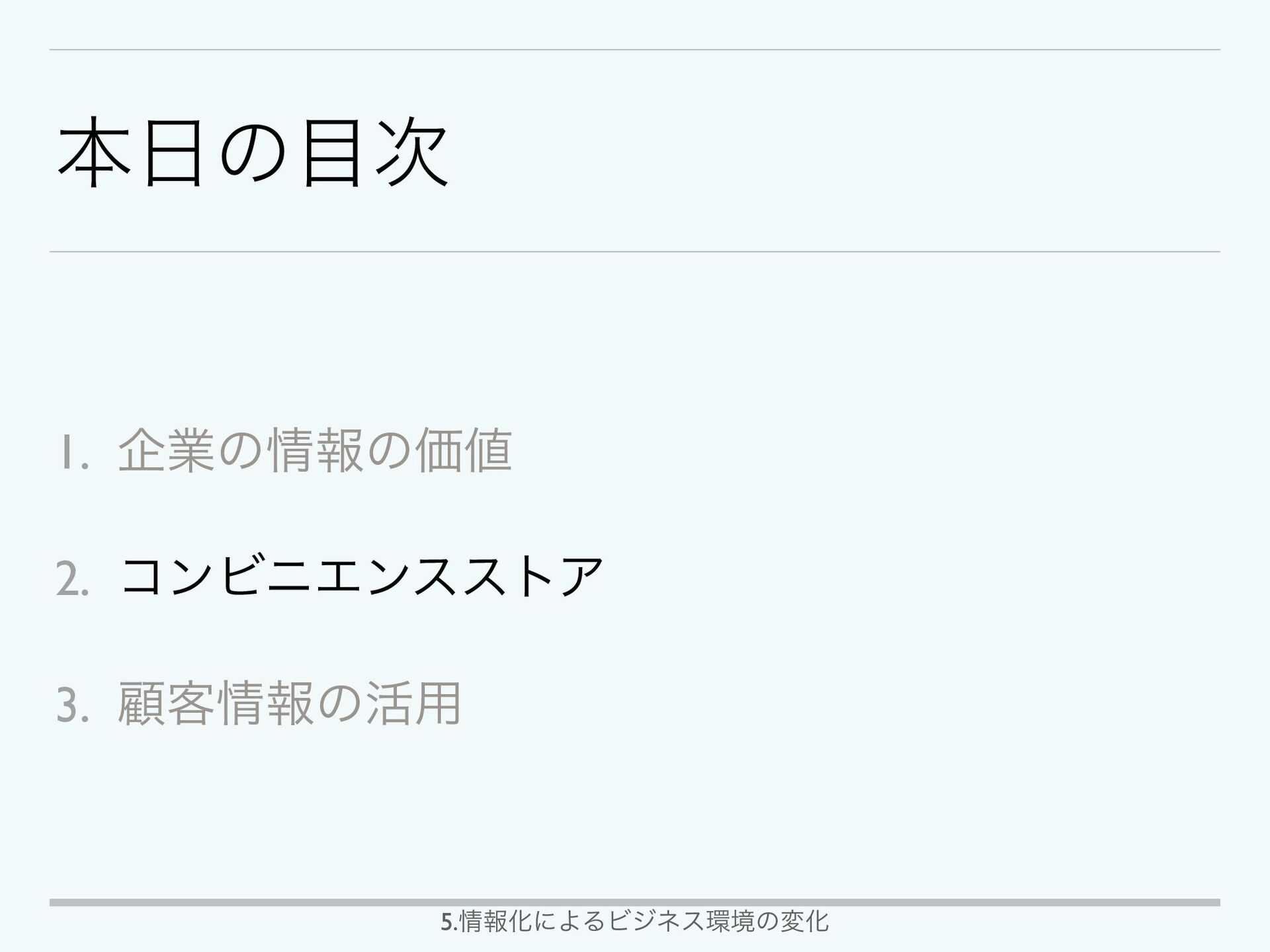 ຊͷ࣍ 1. اۀͷใͷՁ 2. ίϯϏχΤϯεετΞ 3. ސ٬ใͷ׆༻ 5.ใԽʹΑΔϏδωεڥͷมԽ