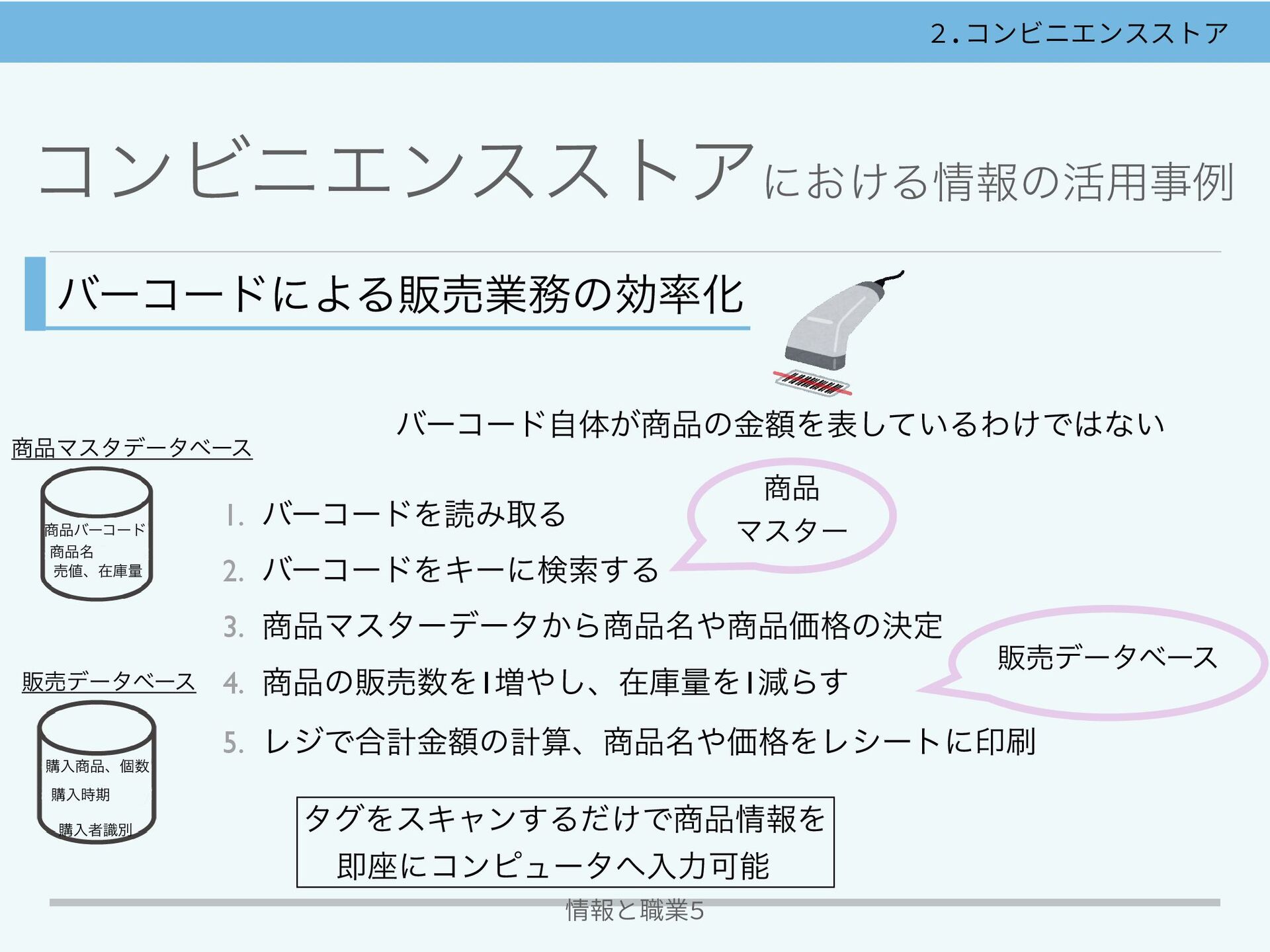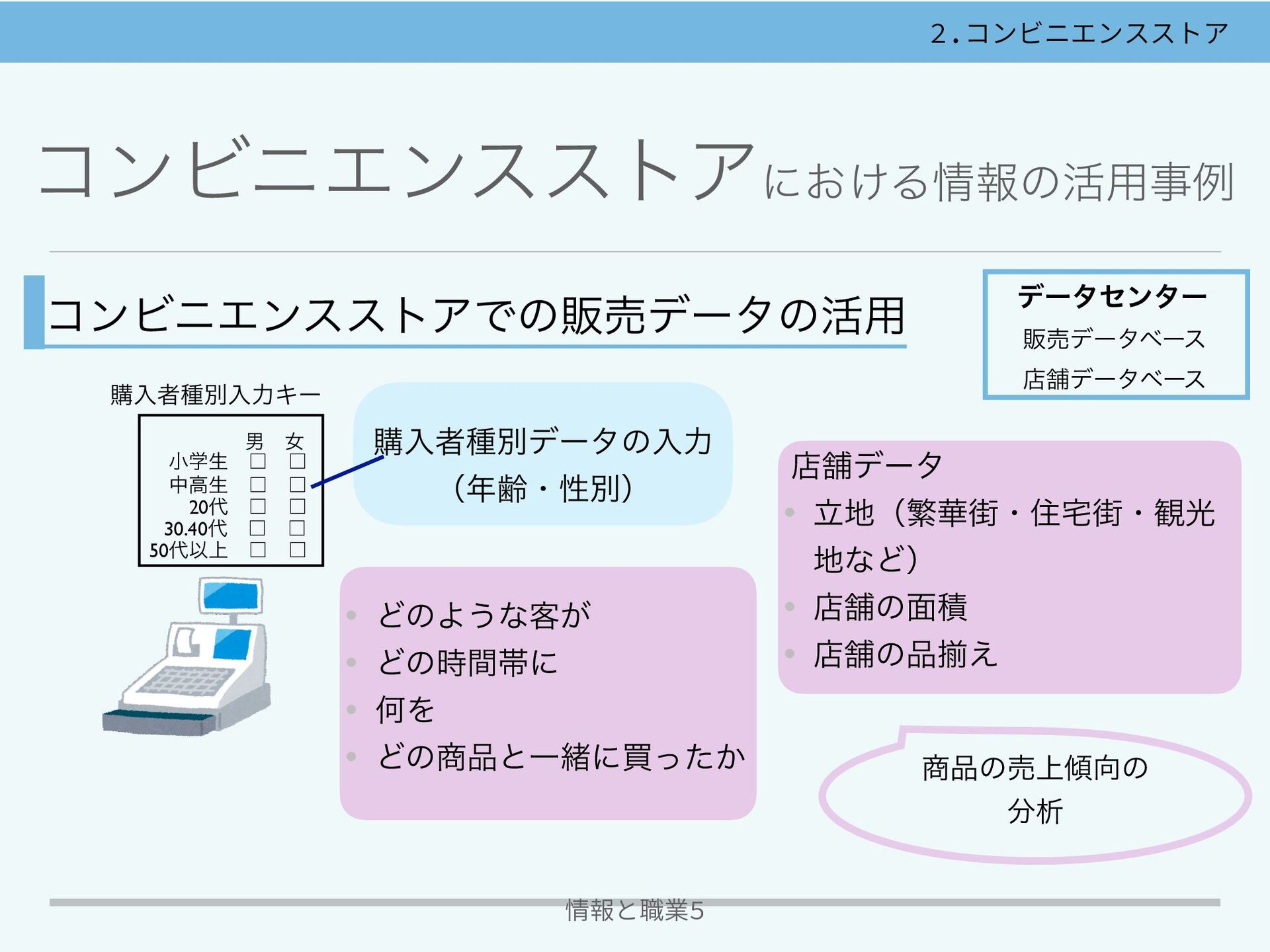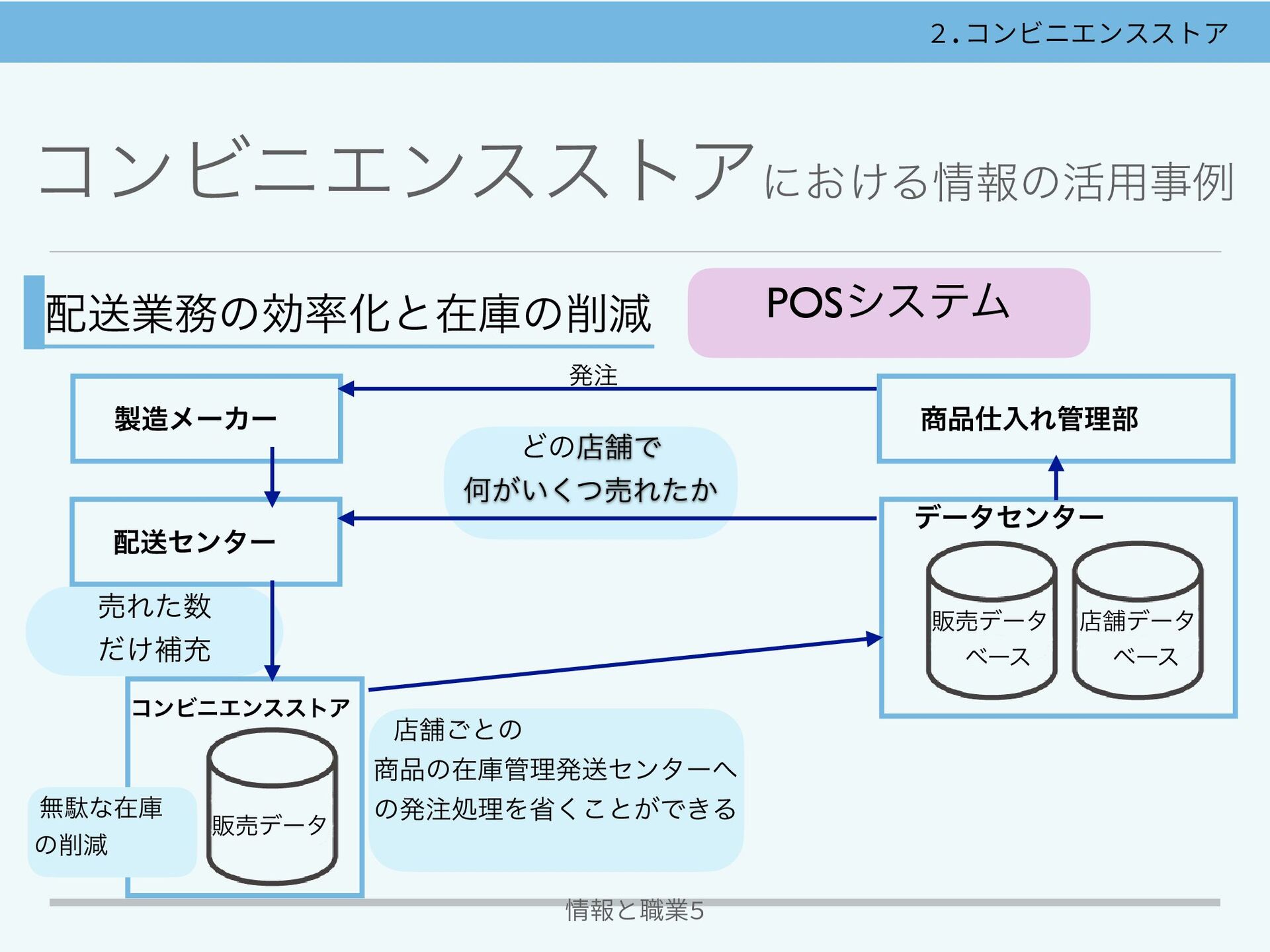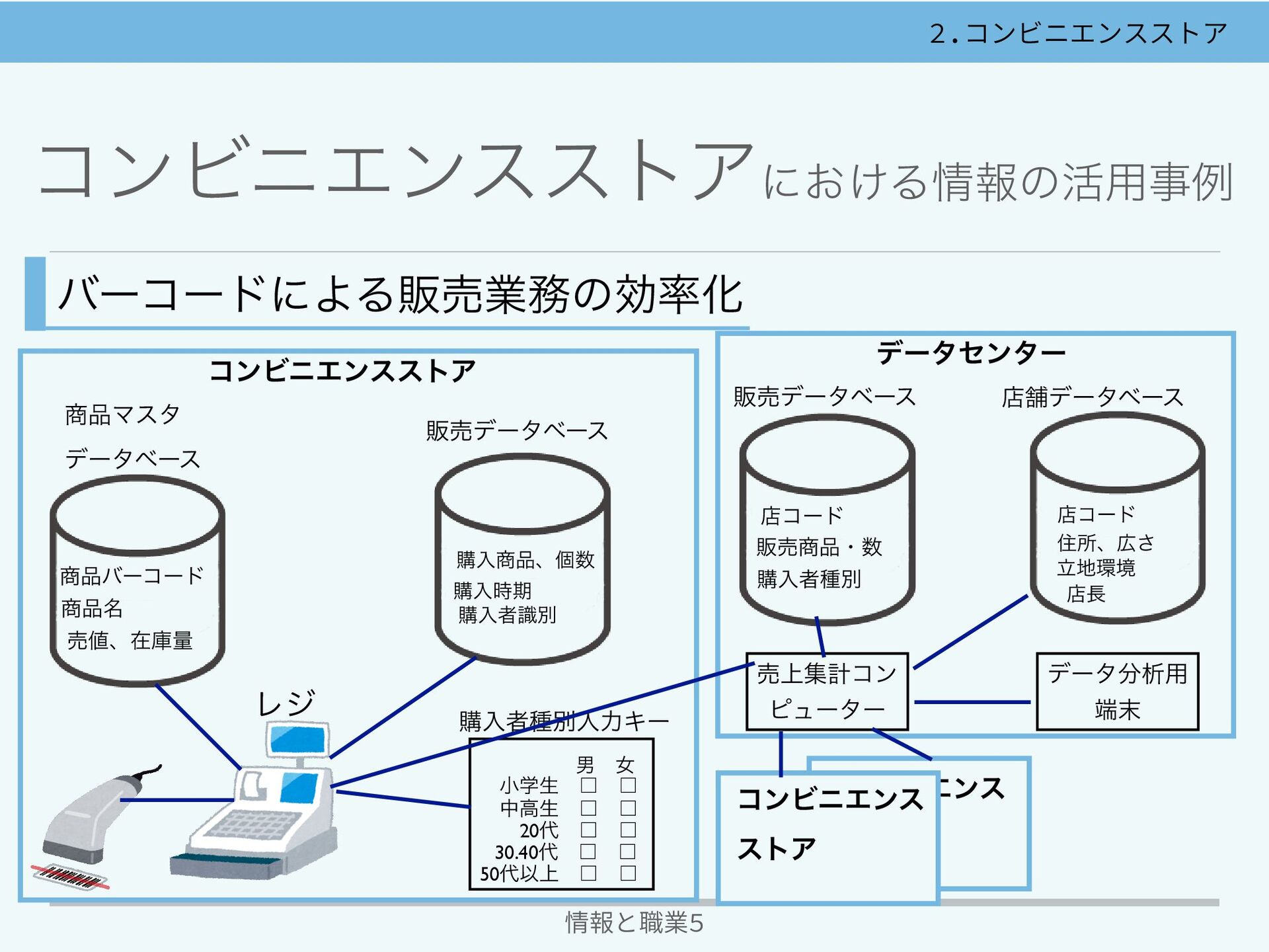 ίϯϏχΤϯε ετΞ 情報と職業5 ίϯϏχΤϯεετΞʹ͓͚Δใͷ׆༻ࣄྫ 2.コンビニエンスストア ൢചσʔλϕʔε Ϛελ σʔλϕʔε όʔίʔυ ໊