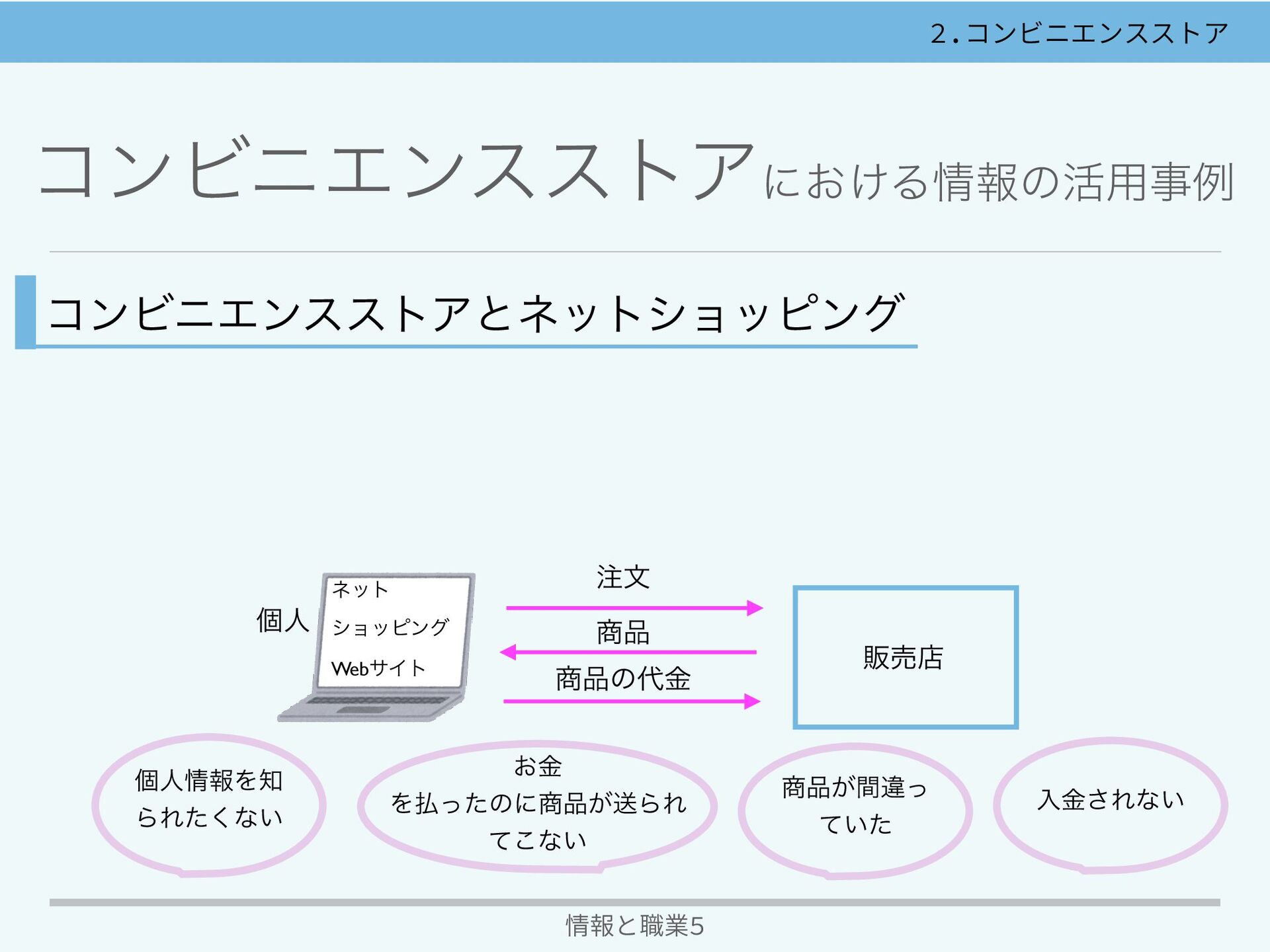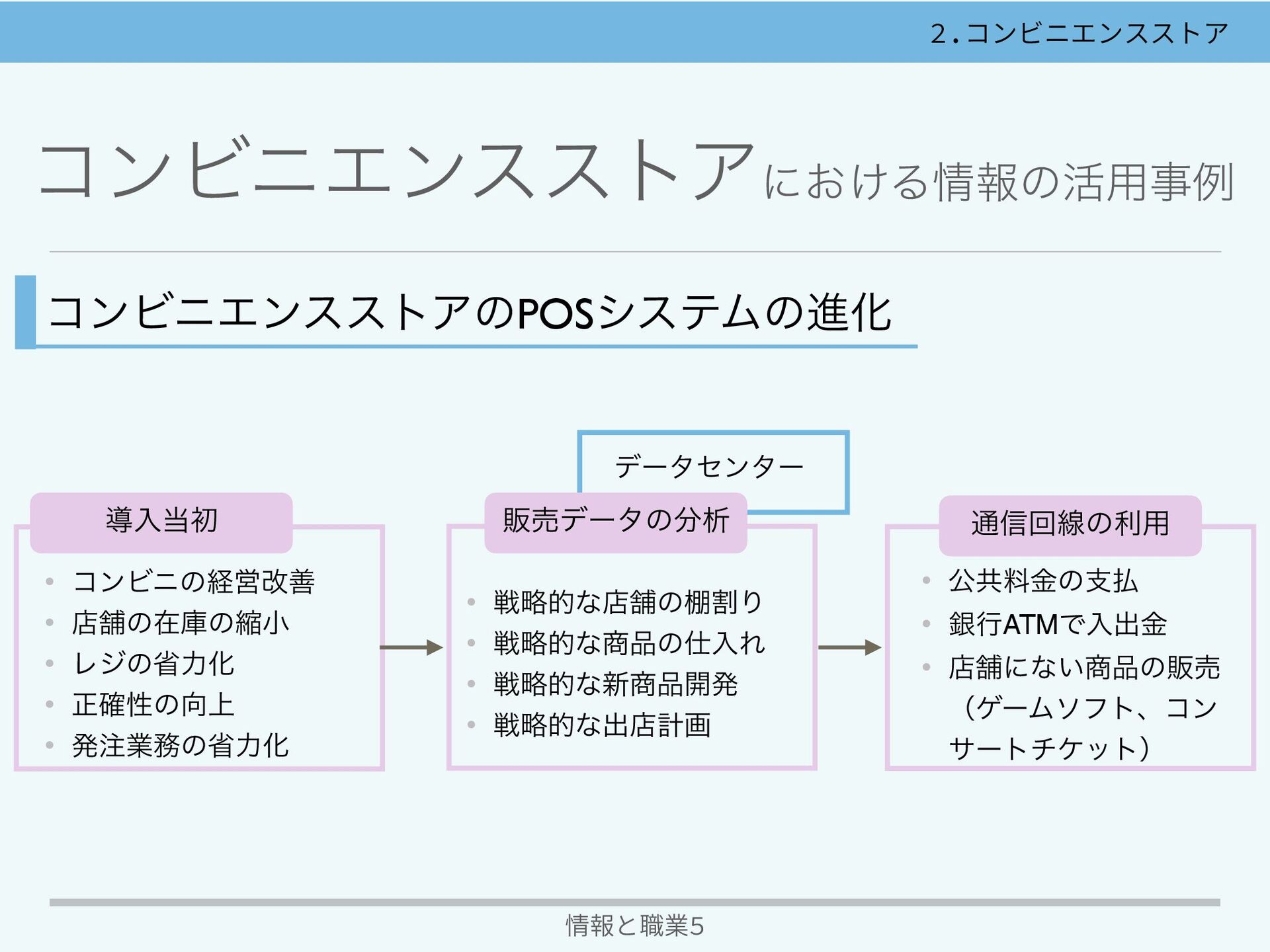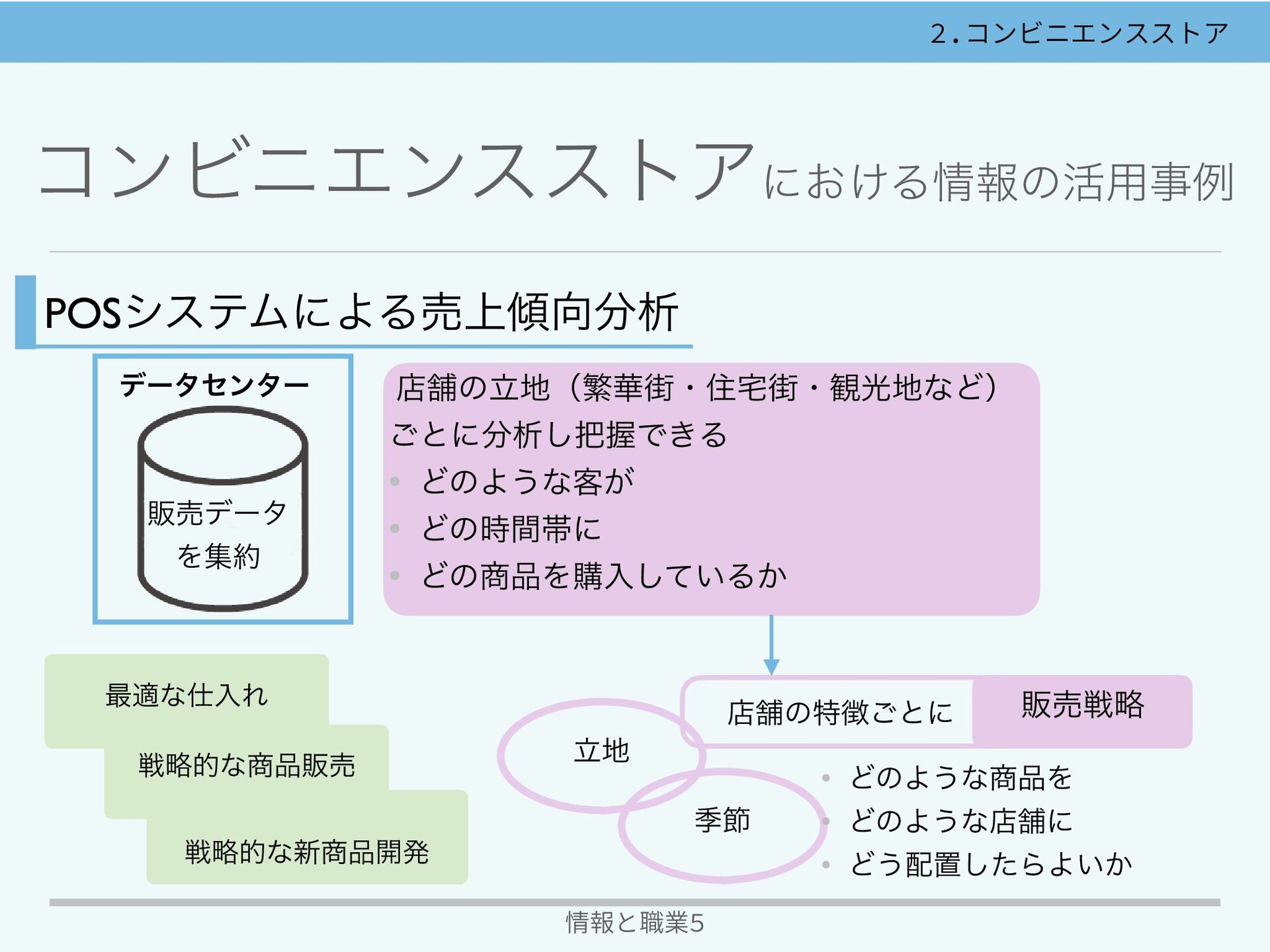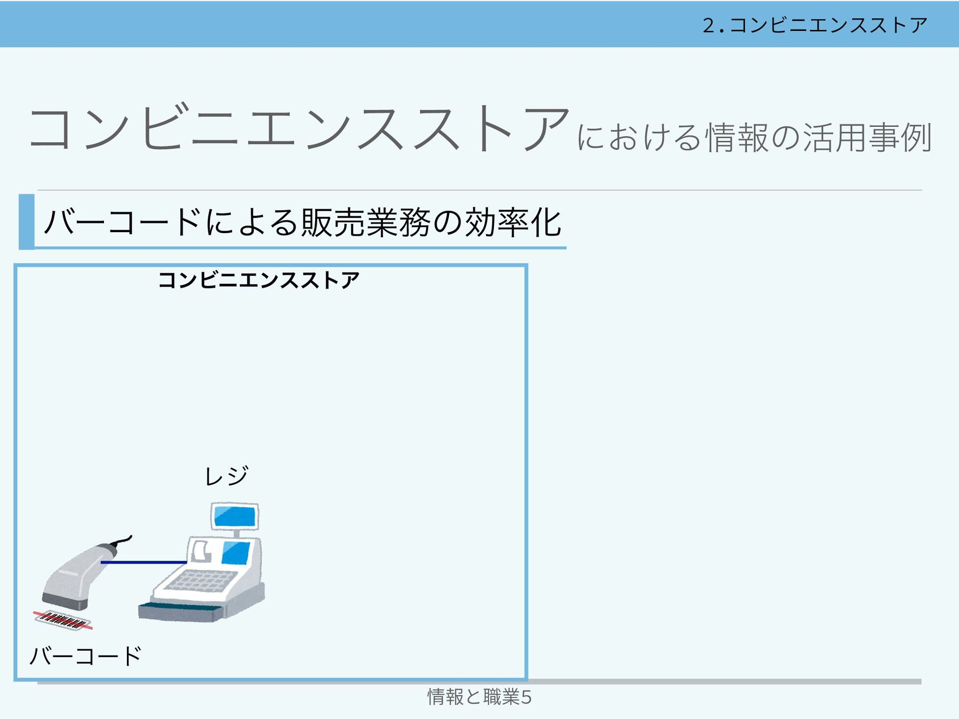 ίϯϏχΤϯε ετΞ 情報と職業5 ίϯϏχΤϯεετΞʹ͓͚Δใͷ׆༻ࣄྫ 2.コンビニエンスストア ൢചσʔλϕʔε Ϛελ σʔλϕʔε όʔίʔυ ໊