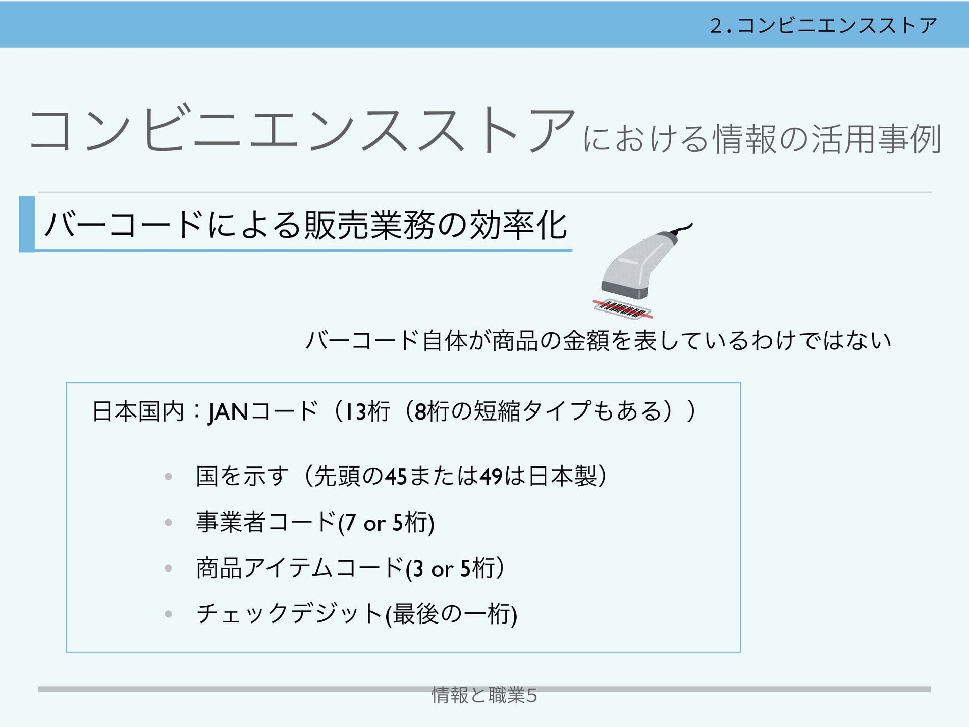 情報と職業5 ίϯϏχΤϯεετΞʹ͓͚Δใͷ׆༻ࣄྫ 2.コンビニエンスストア ຊࠃɿJANίʔυʢ13ܻʢ8ܻͷॖλΠϓ͋Δʣʣ • ࠃΛࣔ͢ʢઌ಄ͷ45·ͨ49ຊʣ • ࣄۀऀίʔυ(7 or 5ܻ)