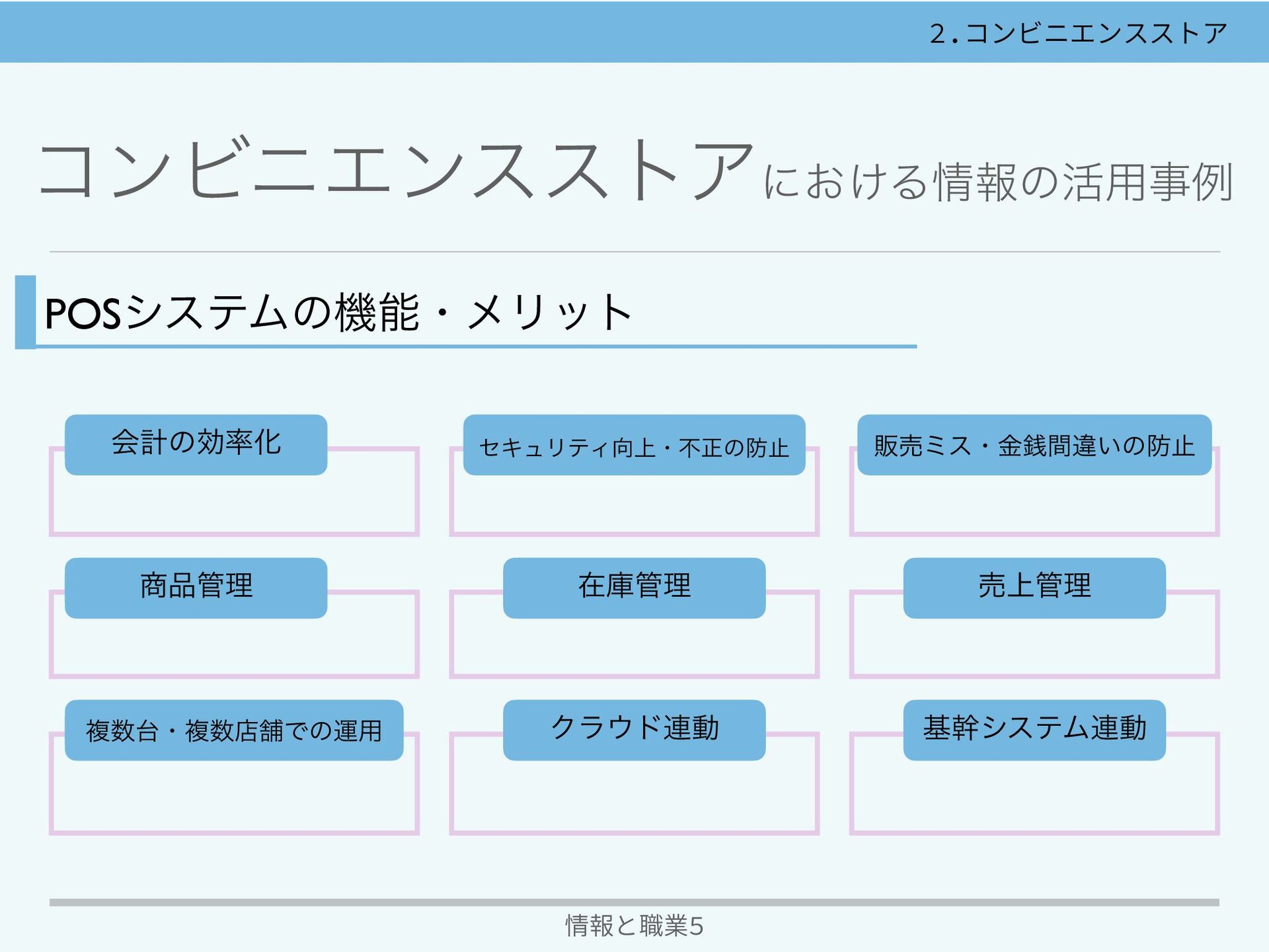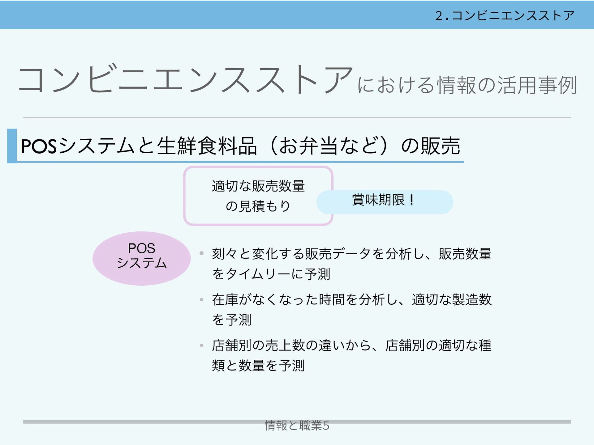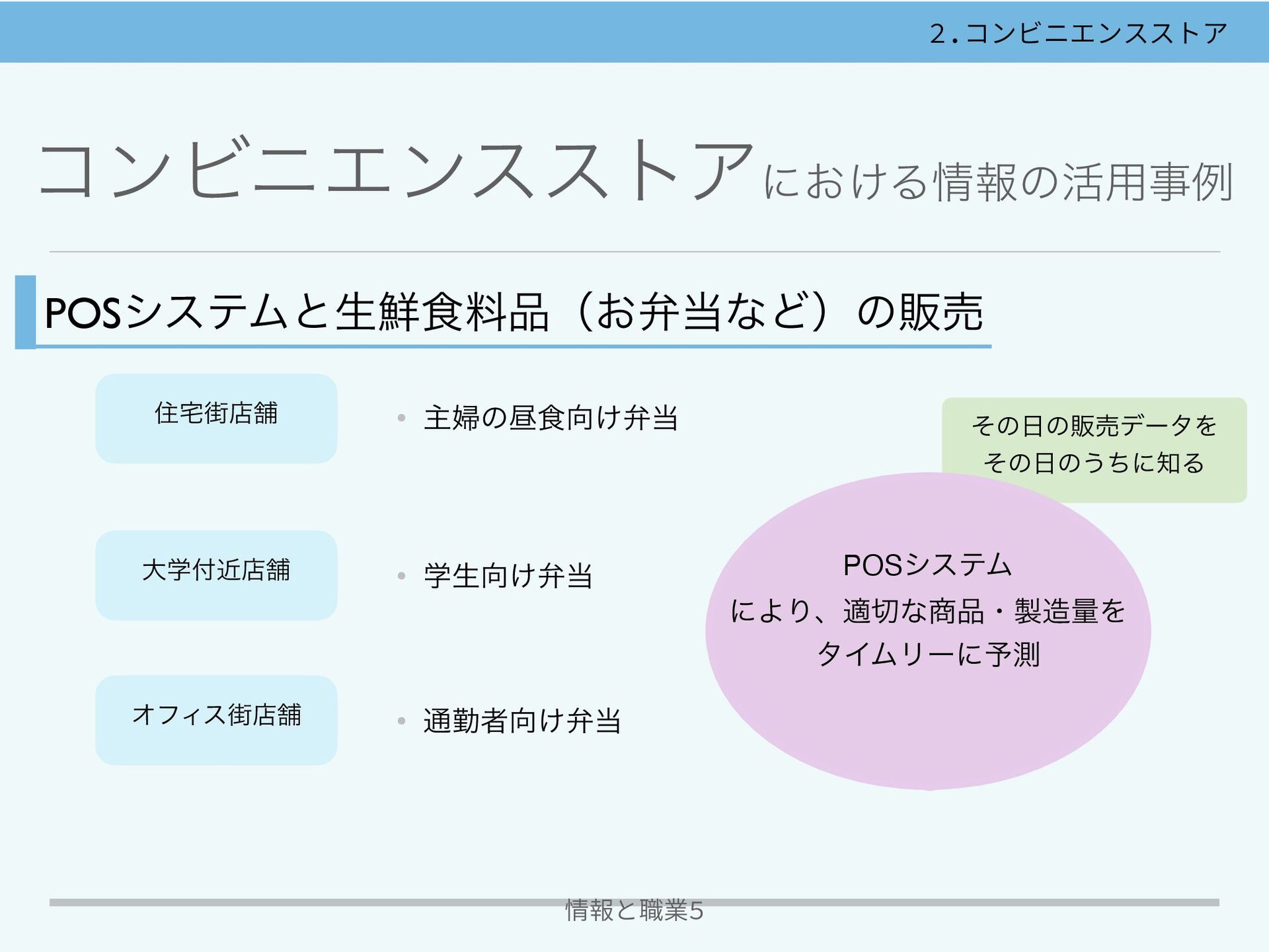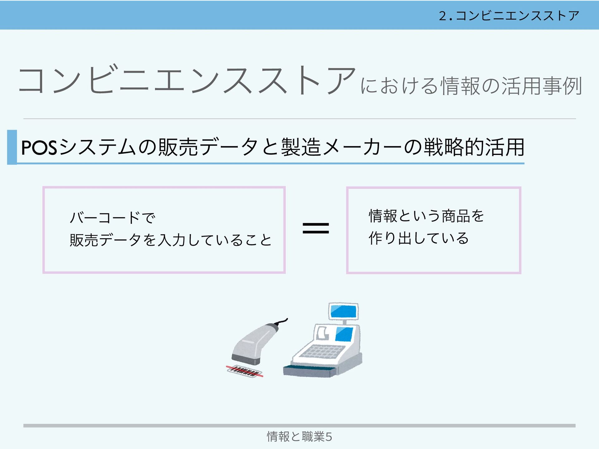 σʔληϯλʔ 情報と職業5 ίϯϏχΤϯεετΞʹ͓͚Δใͷ׆༻ࣄྫ 2.コンビニエンスストア ίϯϏχΤϯεετΞͷPOSγεςϜͷਐԽ • ίϯϏχͷܦӦվળ • ళฮͷࡏݿͷॖখ •