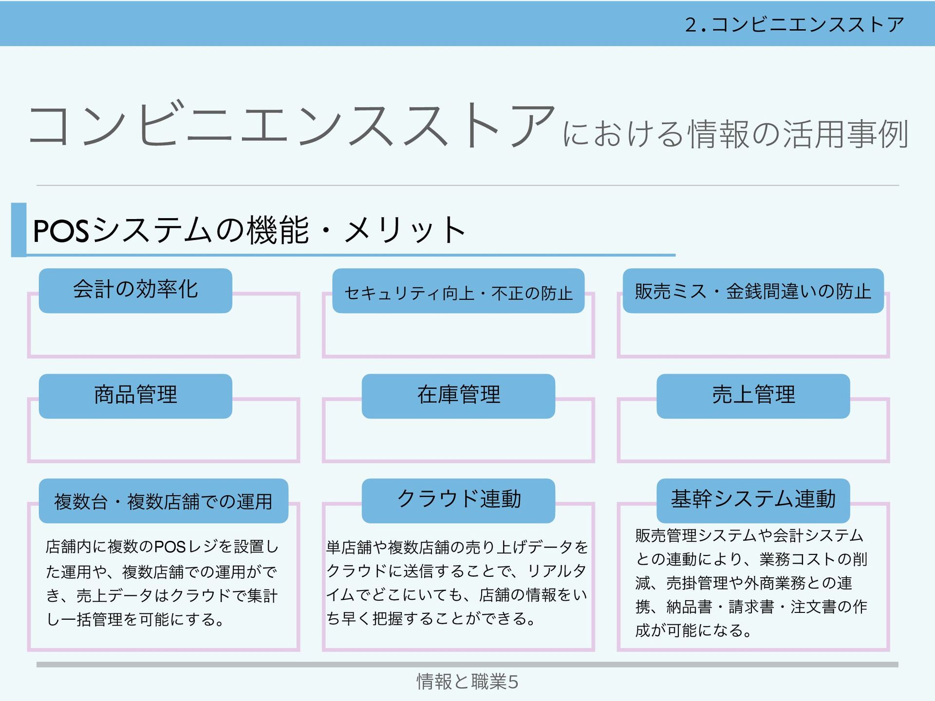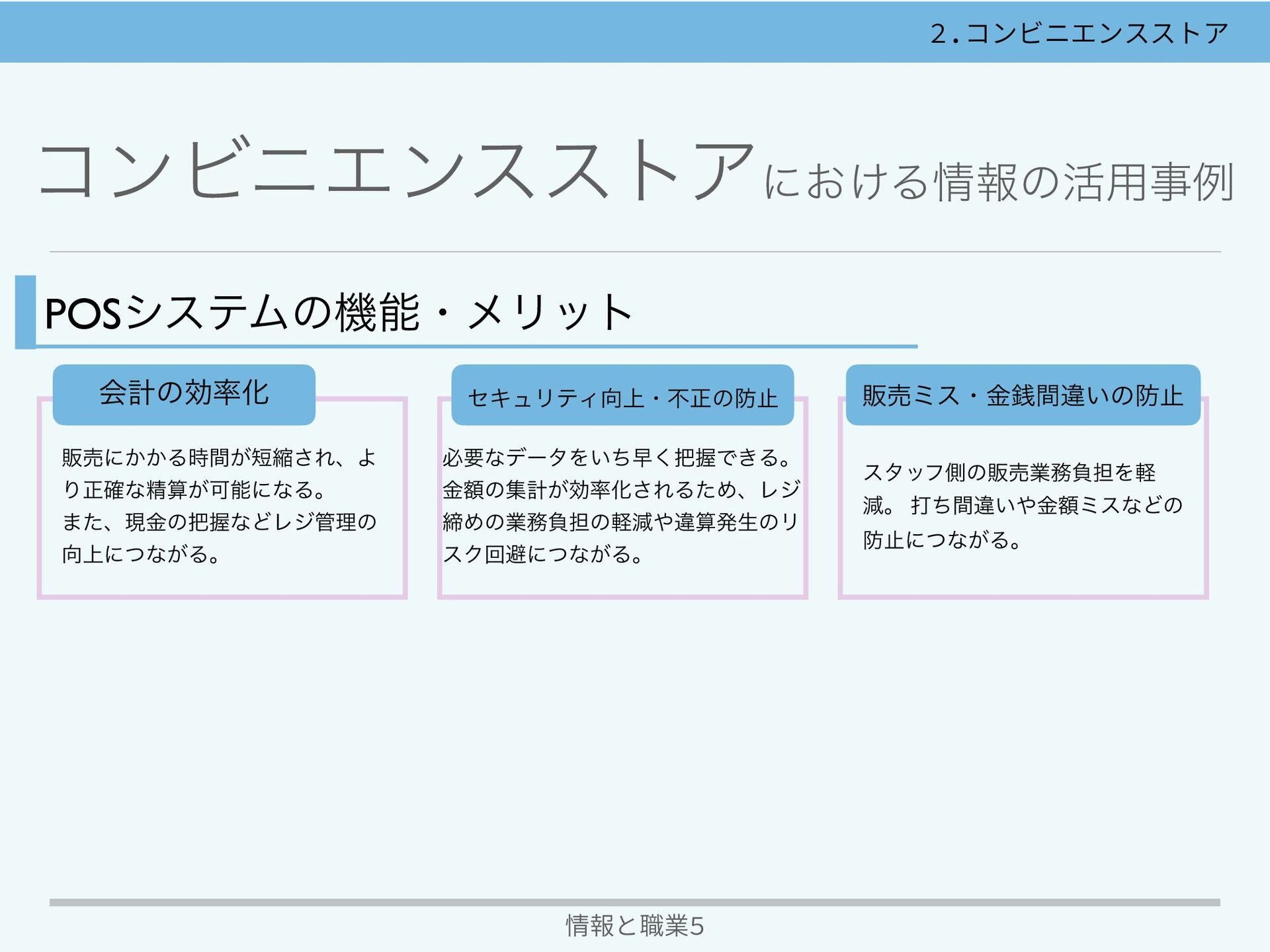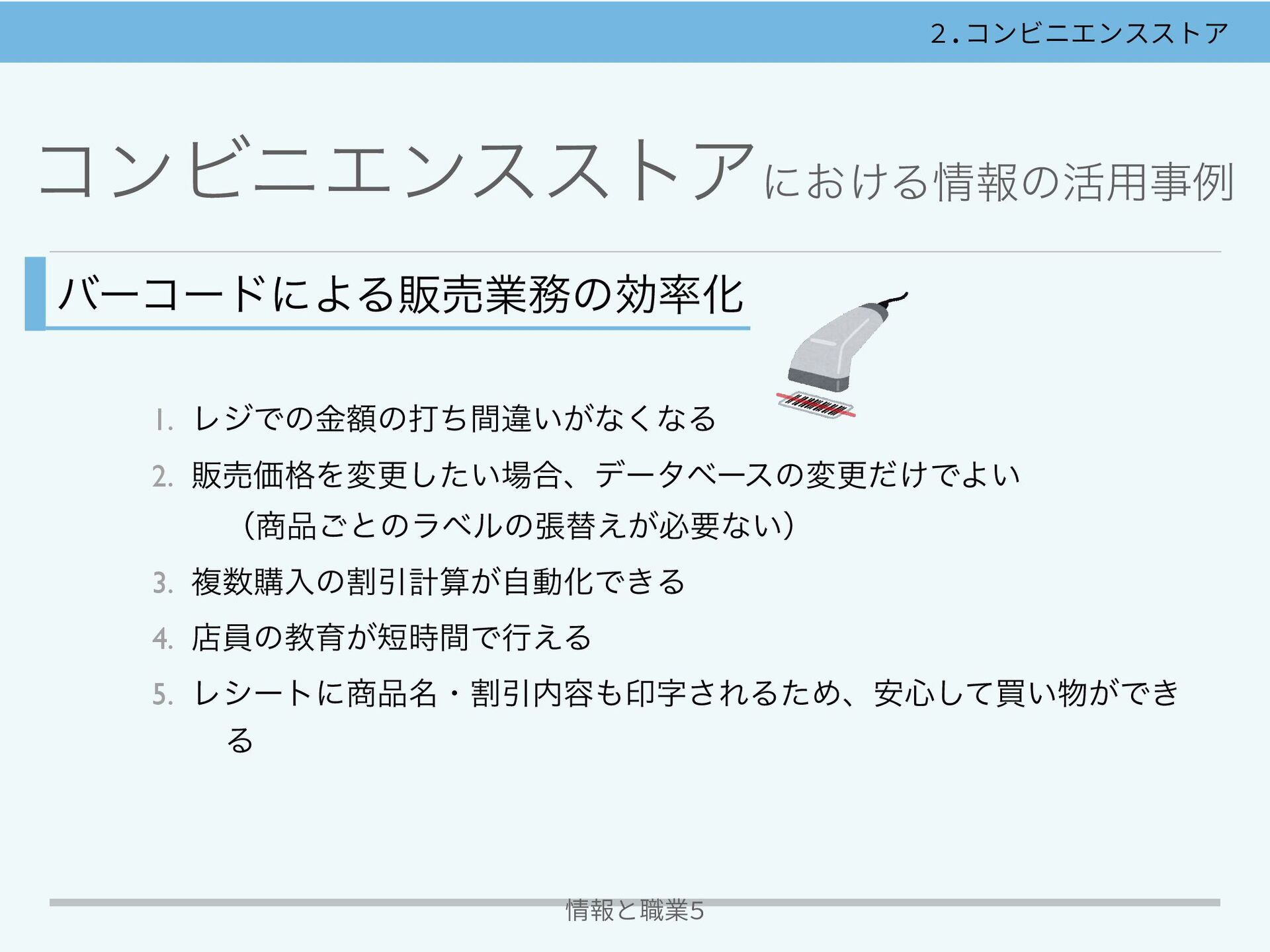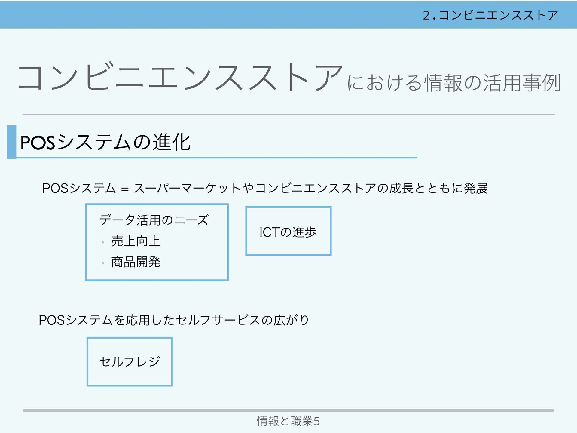 σʔληϯλʔ 情報と職業5 ίϯϏχΤϯεετΞʹ͓͚Δใͷ׆༻ࣄྫ 2.コンビニエンスストア ίϯϏχΤϯεετΞͷPOSγεςϜͷਐԽ • ίϯϏχͷܦӦվળ • ళฮͷࡏݿͷॖখ •