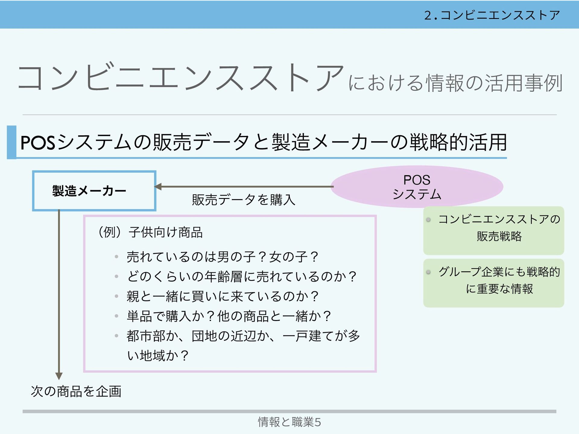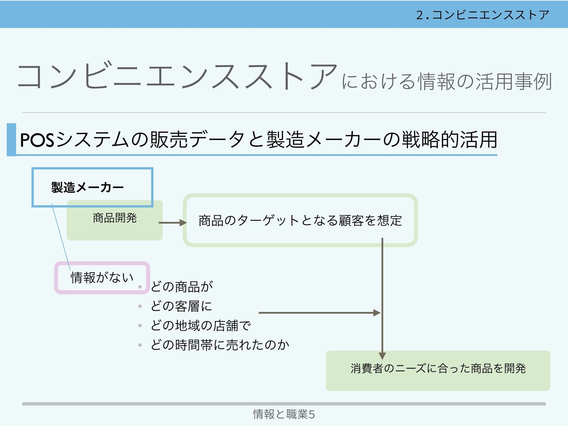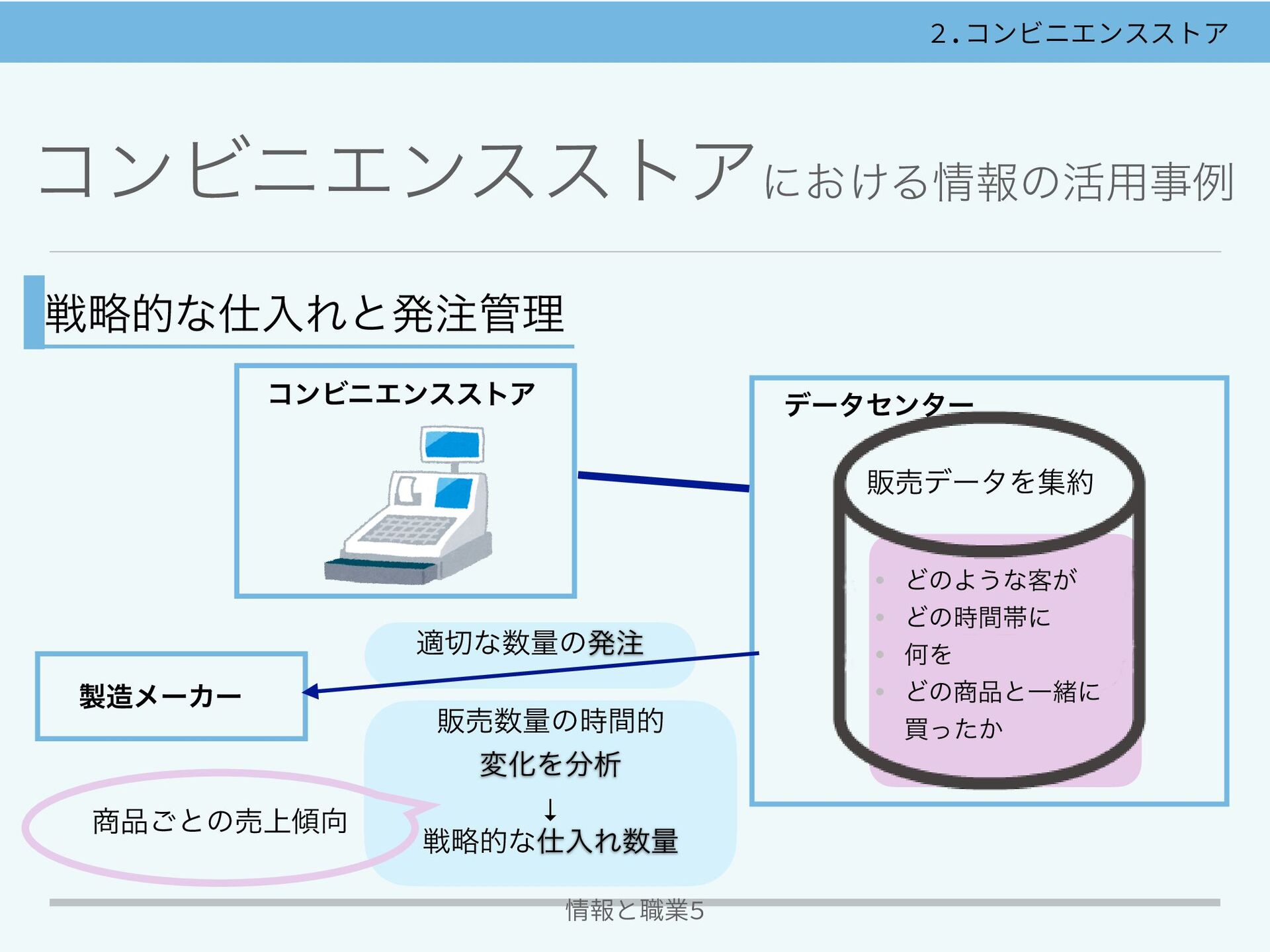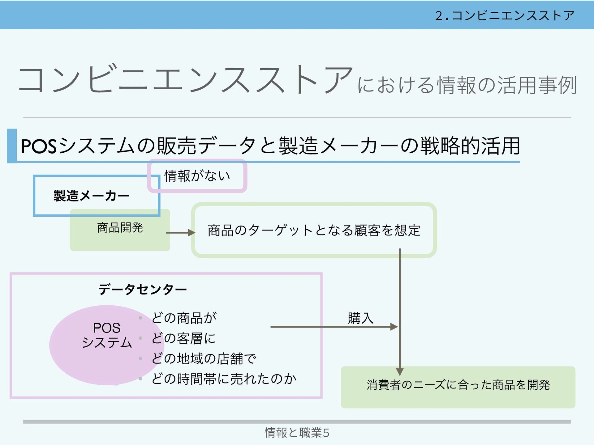 ใ͕ͳ͍ ։ൃ 情報と職業5 ίϯϏχΤϯεετΞʹ͓͚Δใͷ׆༻ࣄྫ 2.コンビニエンスストア POSγεςϜͷൢചσʔλͱϝʔΧʔͷઓུత׆༻ ϝʔΧʔ ͷλʔήοτͱͳΔސ٬Λఆ ফඅऀͷχʔζʹ߹ͬͨΛ։ൃ •