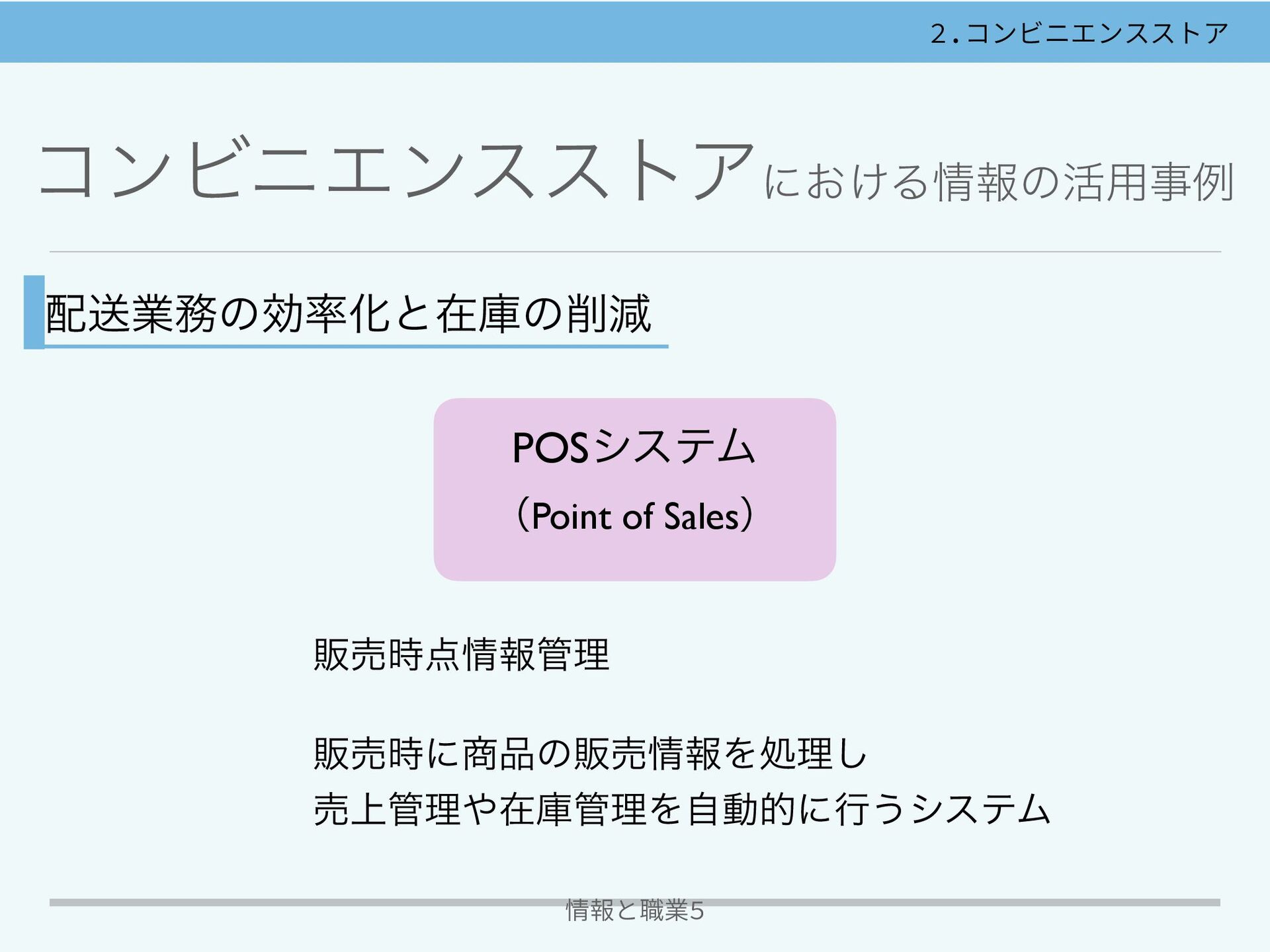 情報と職業5 ίϯϏχΤϯεετΞʹ͓͚Δใͷ׆༻ࣄྫ 2.コンビニエンスストア ૹۀͷޮԽͱࡏݿͷݮ POSγεςϜ ʢPoint of Salesʣ ൢച࣌ใཧ ൢച࣌ʹͷൢചใΛॲཧ͠