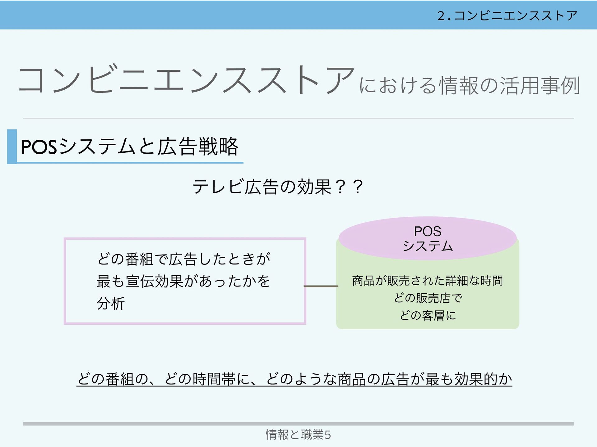 情報と職業5 ίϯϏχΤϯεετΞʹ͓͚Δใͷ׆༻ࣄྫ 2.コンビニエンスストア POSγεςϜͱࠂઓུ ςϨϏࠂͷޮՌʁʁ Ͳͷ൪Ͱࠂͨ͠ͱ͖͕ ࠷એޮՌ͕͔͋ͬͨΛ ੳ ͕ൢച͞Εͨৄࡉͳ࣌ؒ ͲͷൢചళͰ