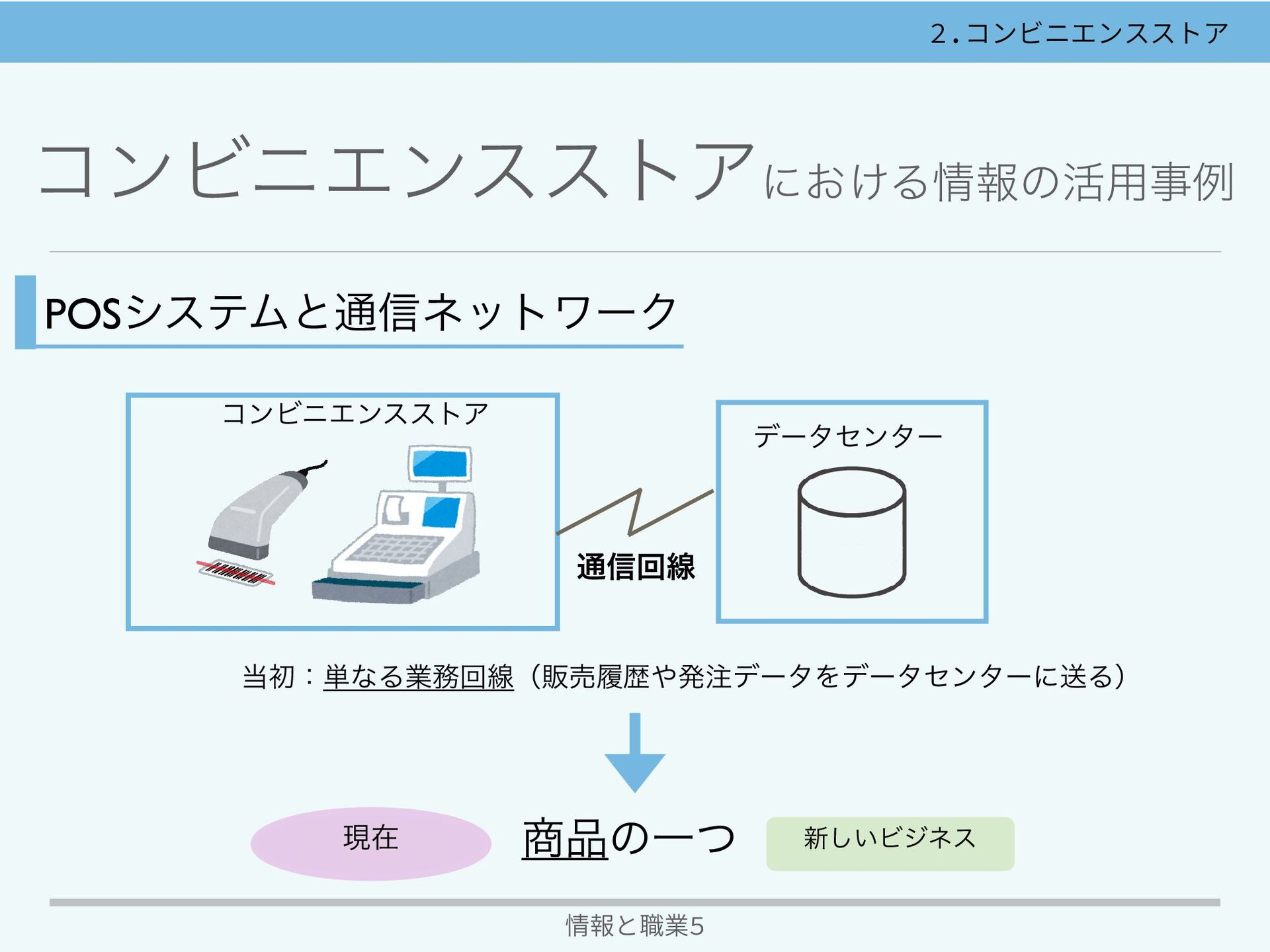 情報と職業5 ίϯϏχΤϯεετΞʹ͓͚Δใͷ׆༻ࣄྫ 2.コンビニエンスストア POSγεςϜͱ௨৴ωοτϫʔΫ ίϯϏχΤϯεετΞ σʔληϯλʔ ௨৴ճઢ ॳɿ୯ͳΔۀճઢʢൢചཤྺൃσʔλΛσʔληϯλʔʹૹΔʣ ͷҰͭ ৽͍͠Ϗδωε