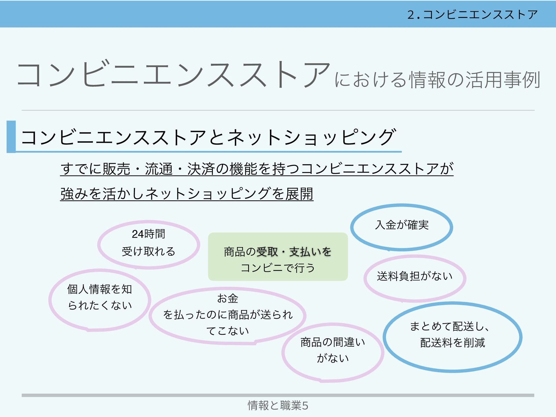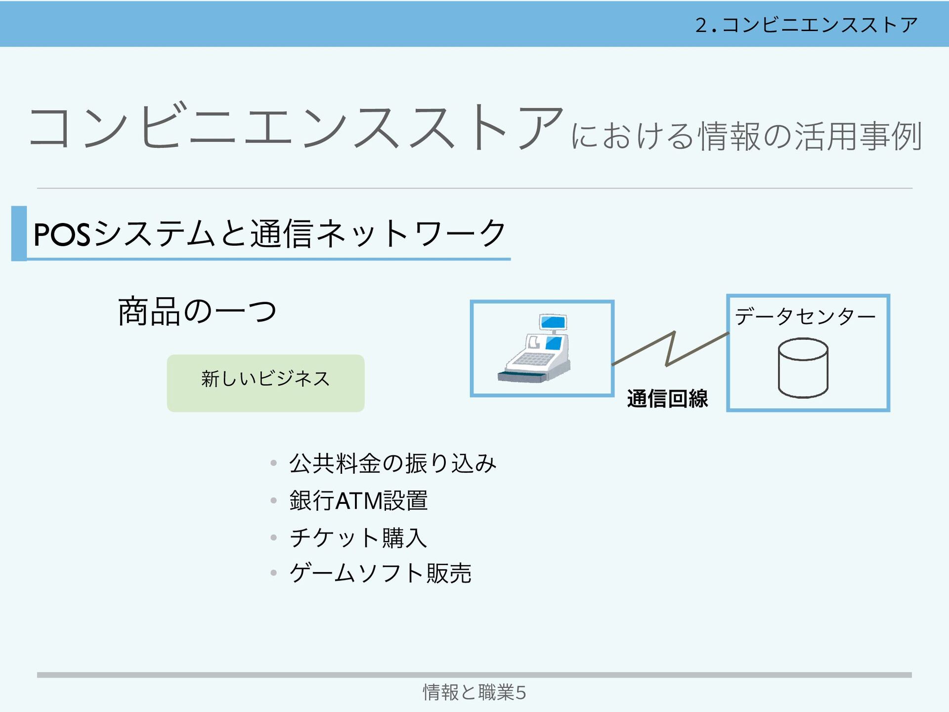 情報と職業5 ίϯϏχΤϯεετΞʹ͓͚Δใͷ׆༻ࣄྫ 2.コンビニエンスストア POSγεςϜͱ௨৴ωοτϫʔΫ σʔληϯλʔ ௨৴ճઢ ͷҰͭ ৽͍͠Ϗδωε • ެڞྉۚͷৼΓࠐΈ