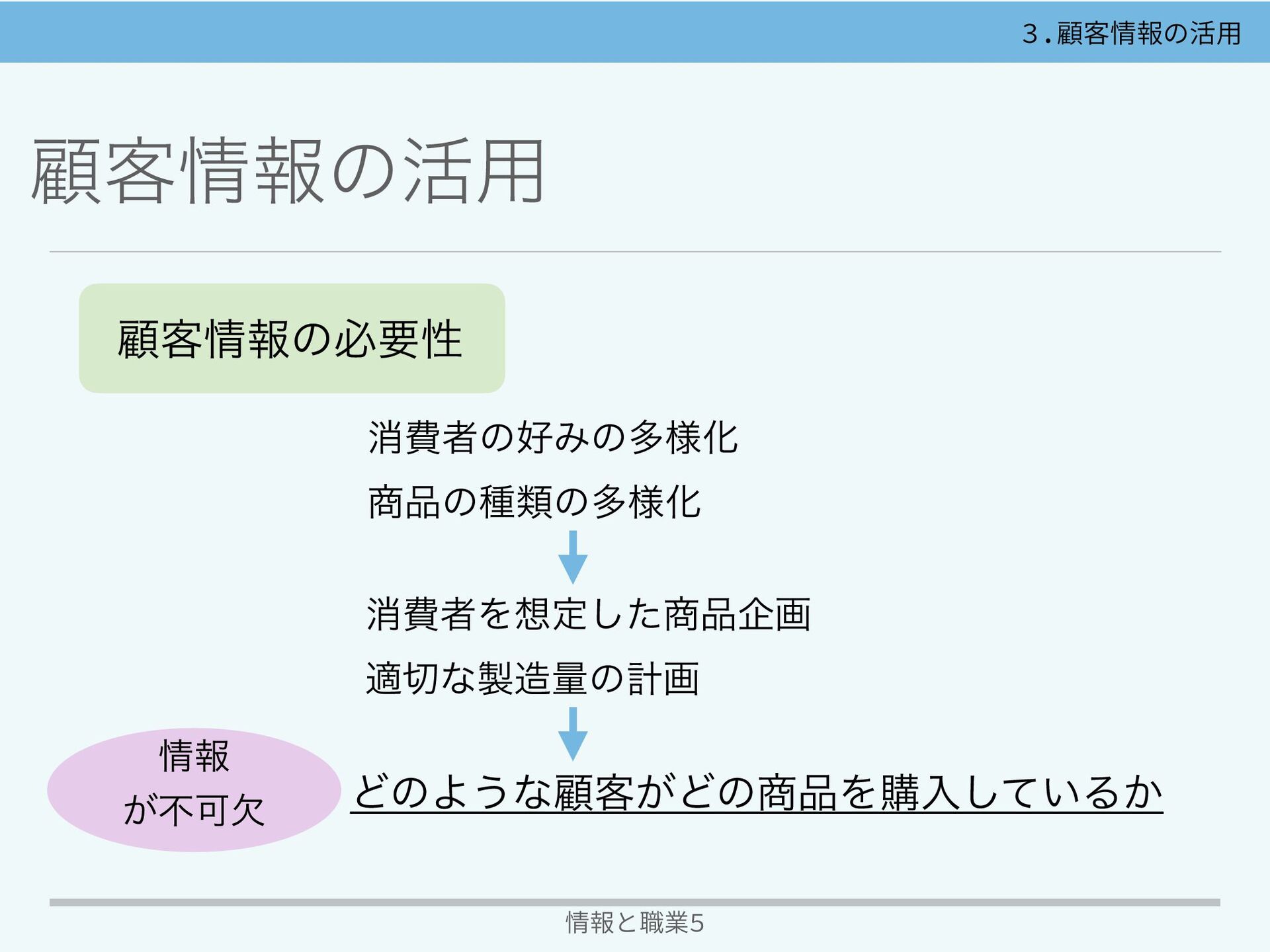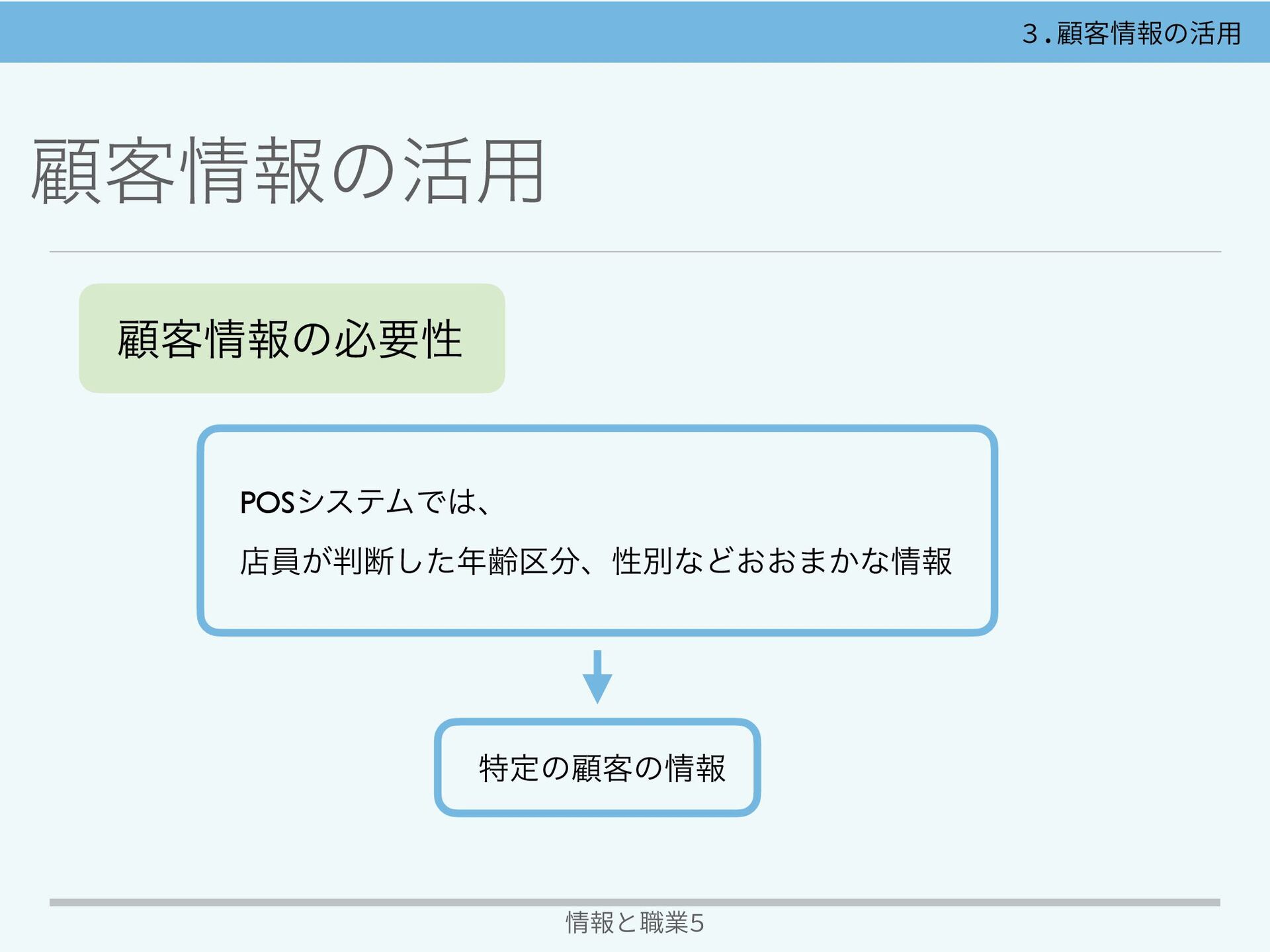 情報と職業5 ސ٬ใͷ׆༻ 3.顧客情報の活 用 ސ٬ใͷඞཁੑ POSγεςϜͰɺ ళһ͕அͨ͠ྸ۠ɺੑผͳͲ͓͓·͔ͳใ ಛఆͷސ٬ͷใ
