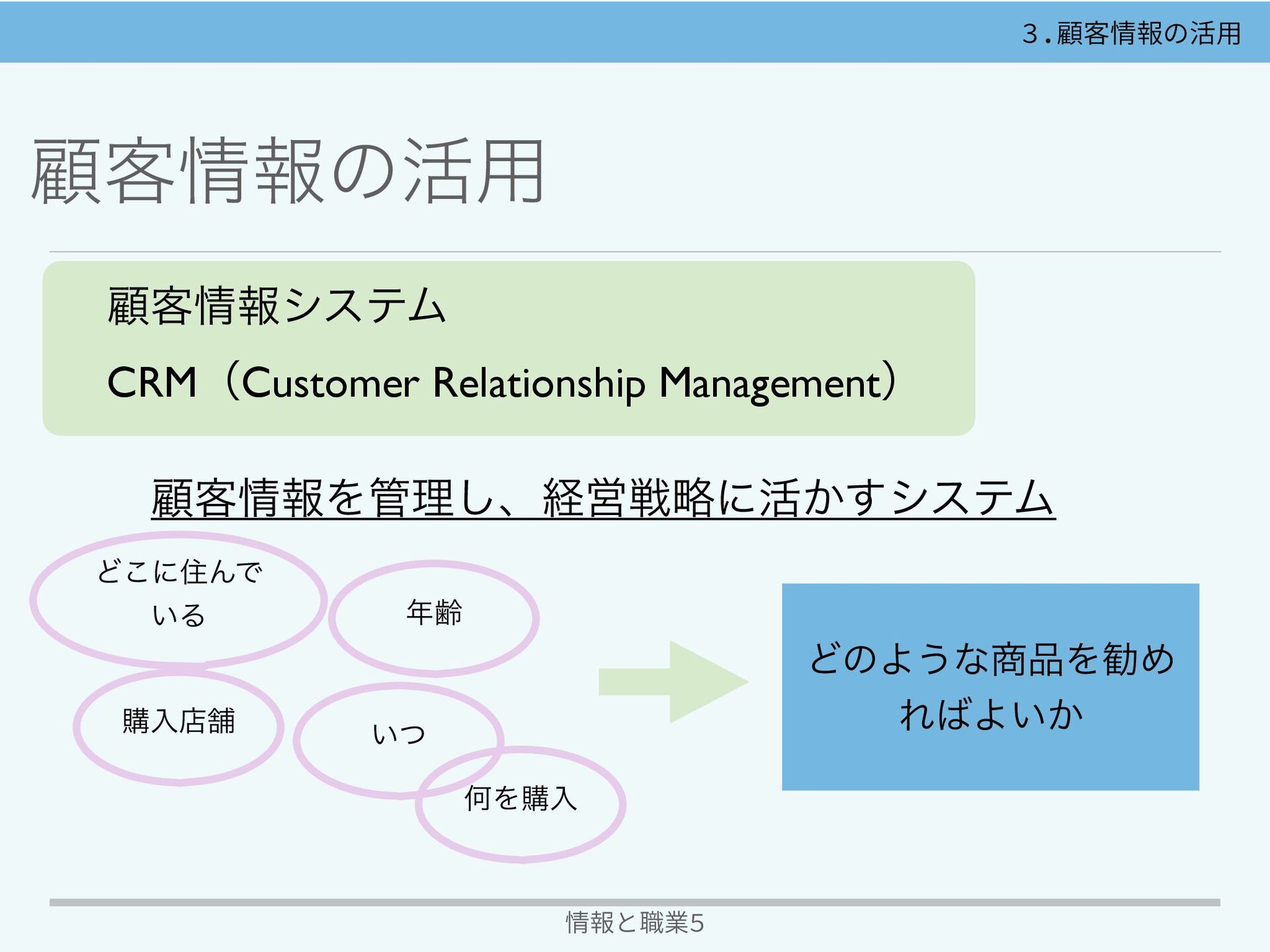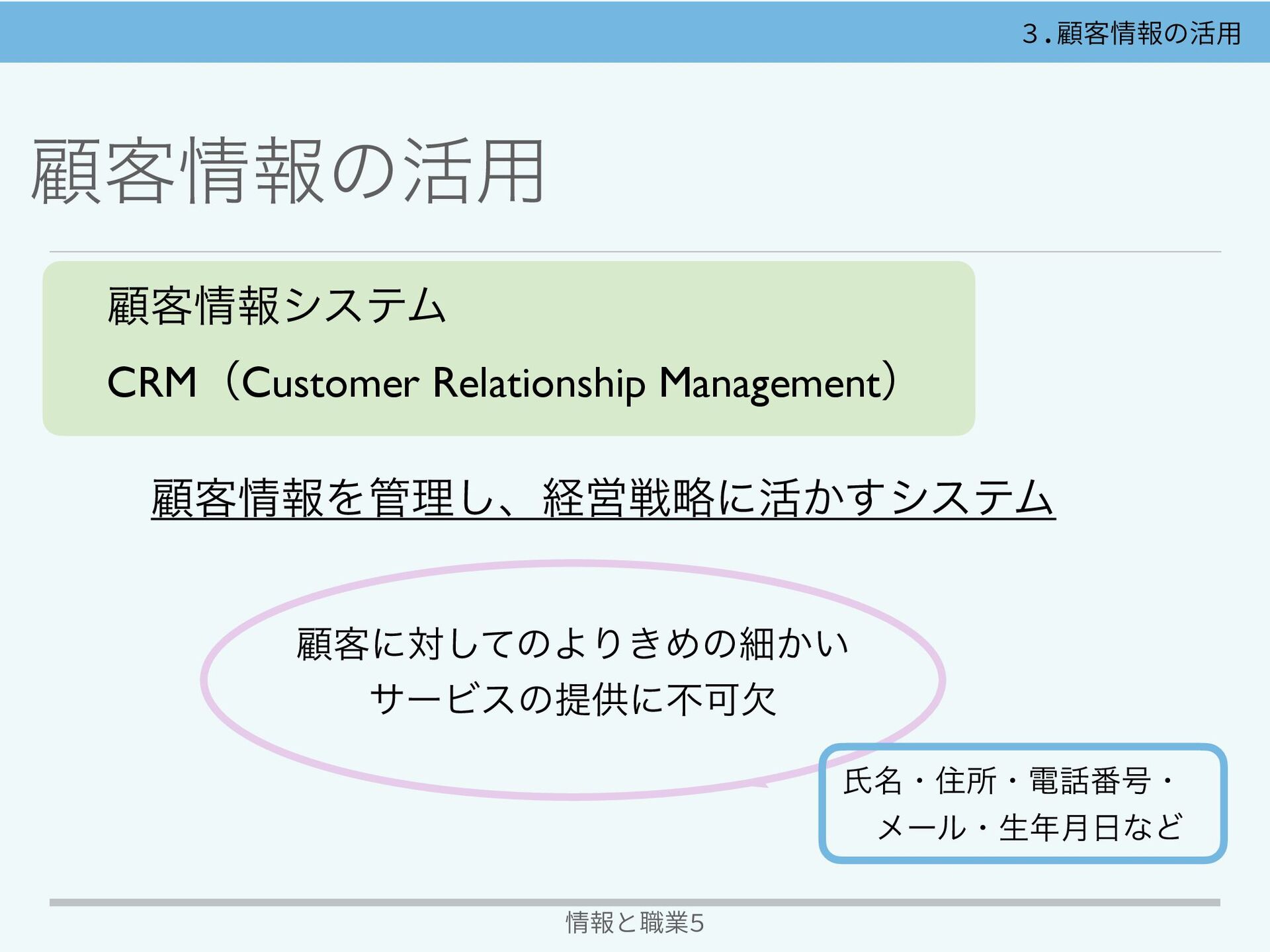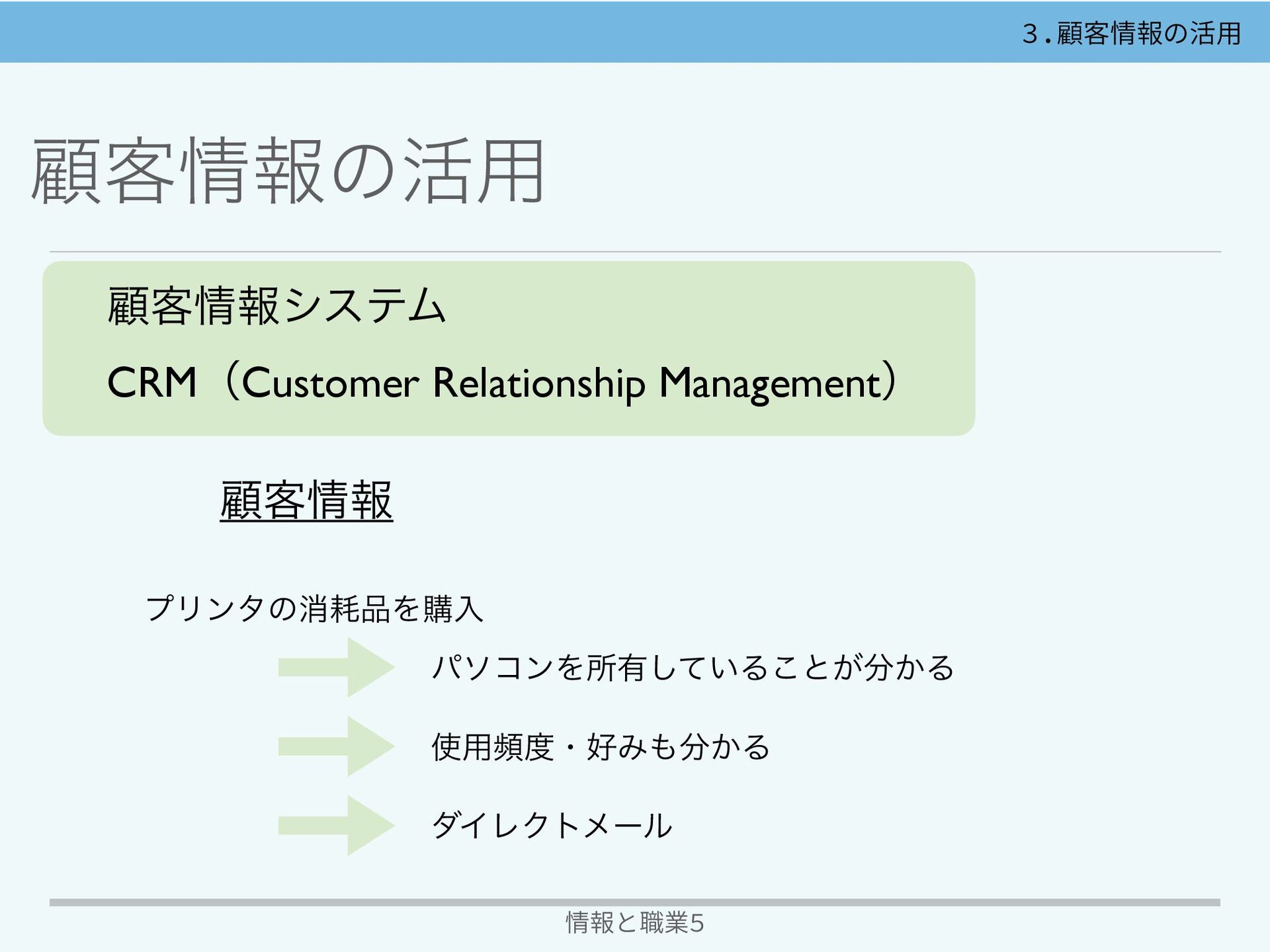 情報と職業5 ސ٬ใͷ׆༻ 3.顧客情報の活 用 ސ٬ใγεςϜ CRMʢCustomer Relationship Managementʣ ސ٬ใ ϓϦϯλͷফΛߪೖ