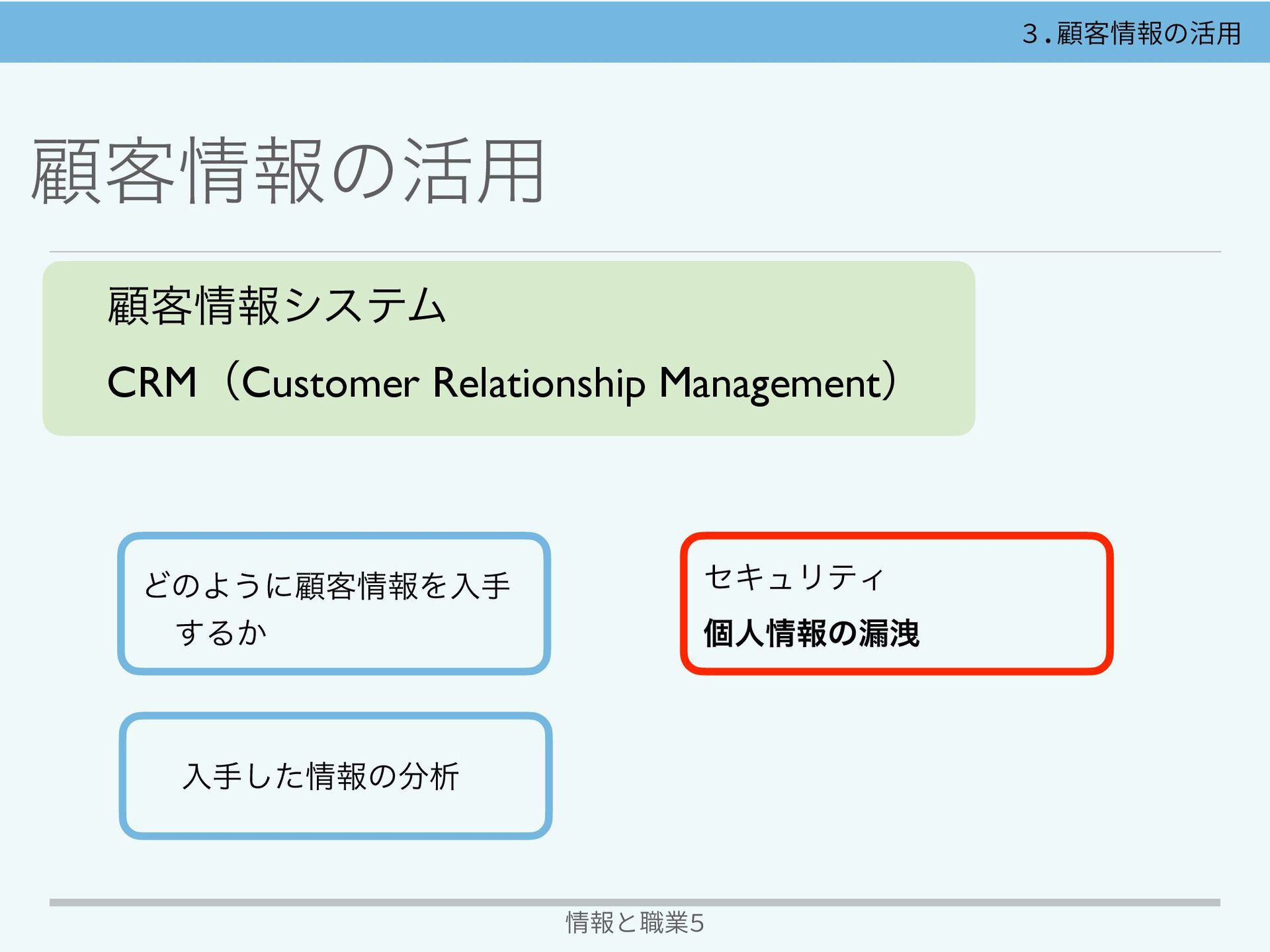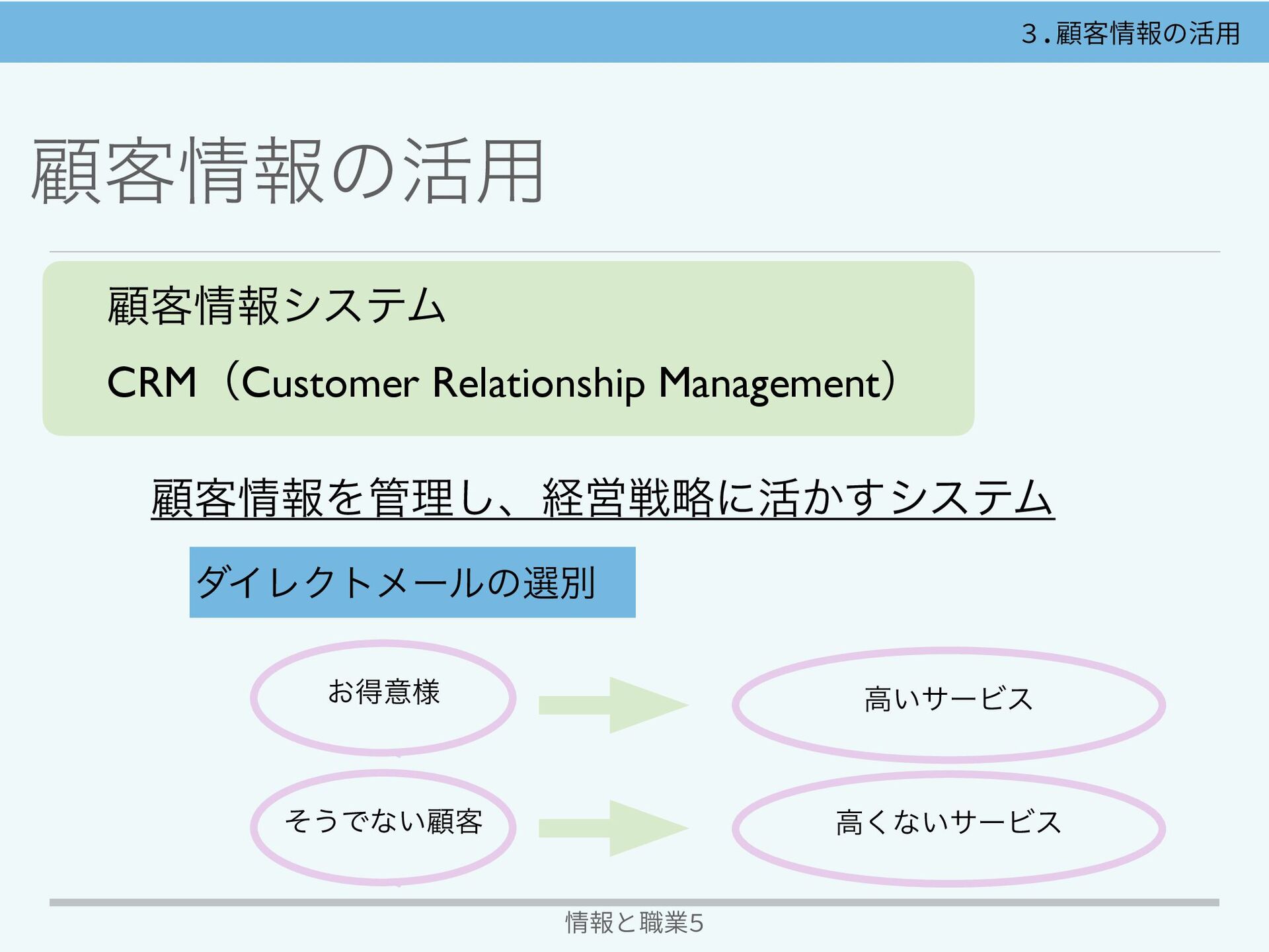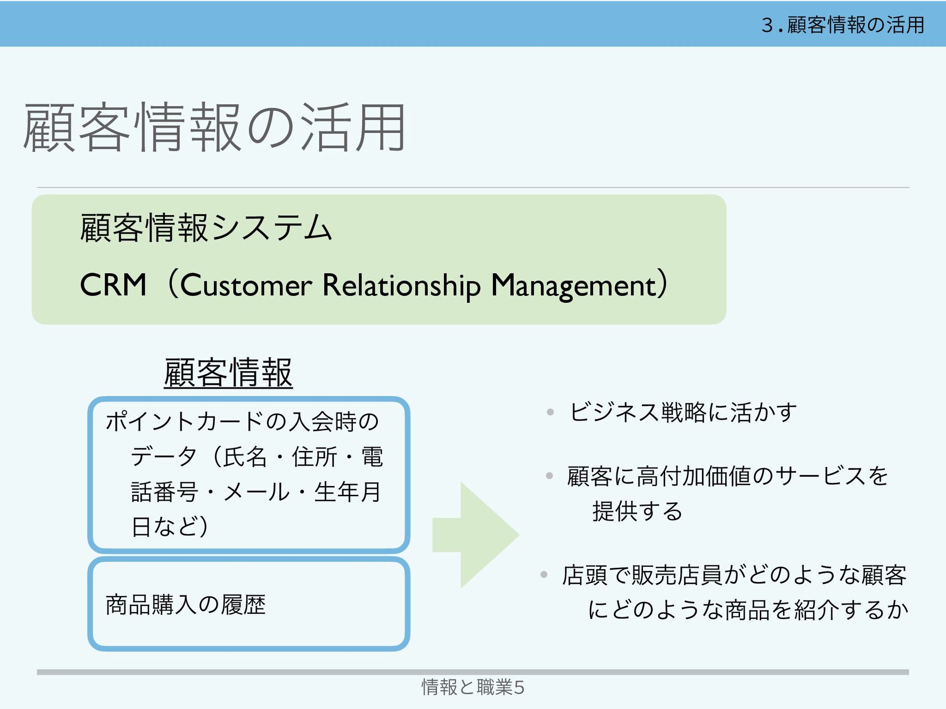 情報と職業5 ސ٬ใͷ׆༻ 3.顧客情報の活 用 ސ٬ใγεςϜ CRMʢCustomer Relationship Managementʣ ސ٬ใ ϓϦϯλͷফΛߪೖ