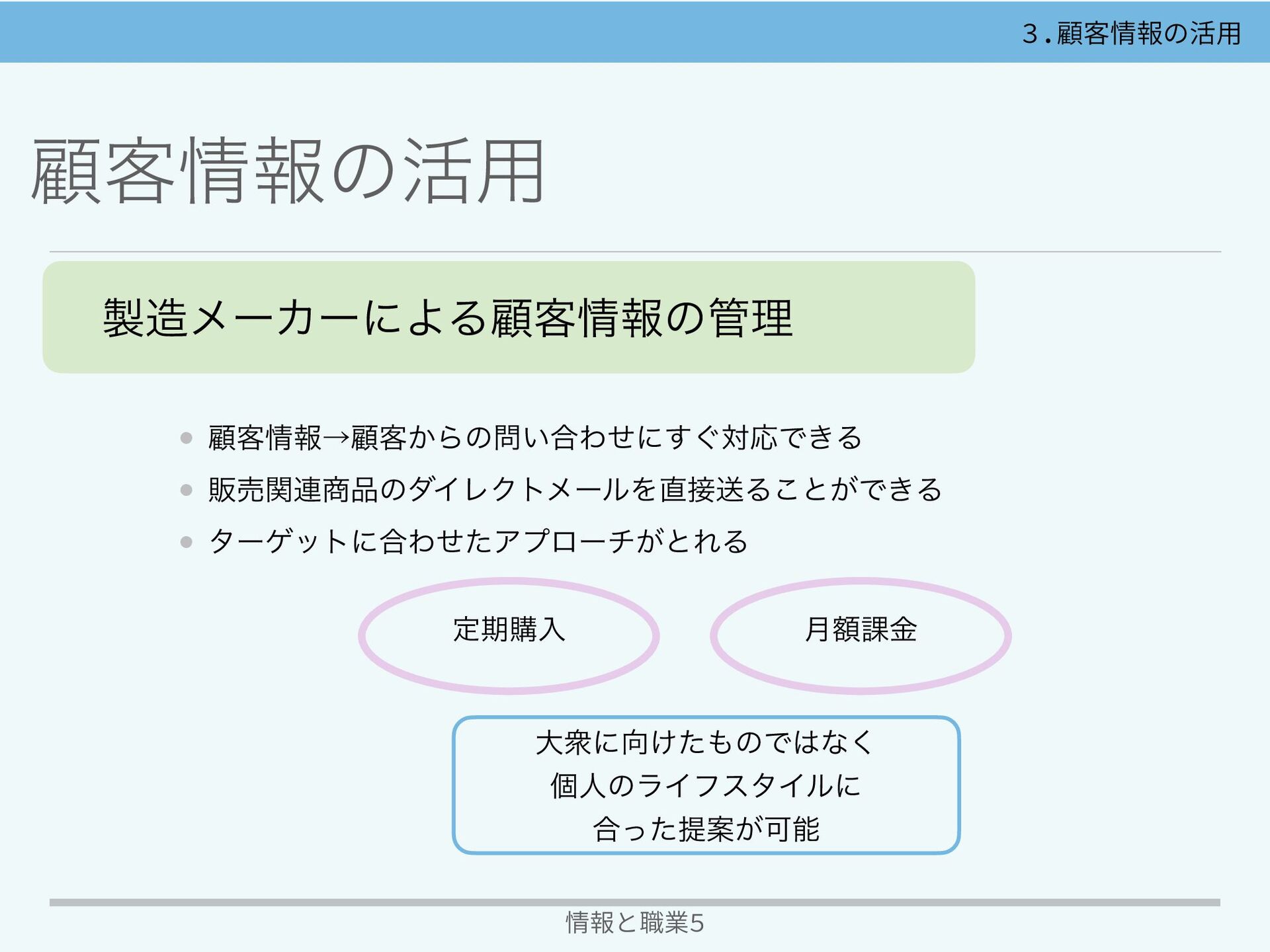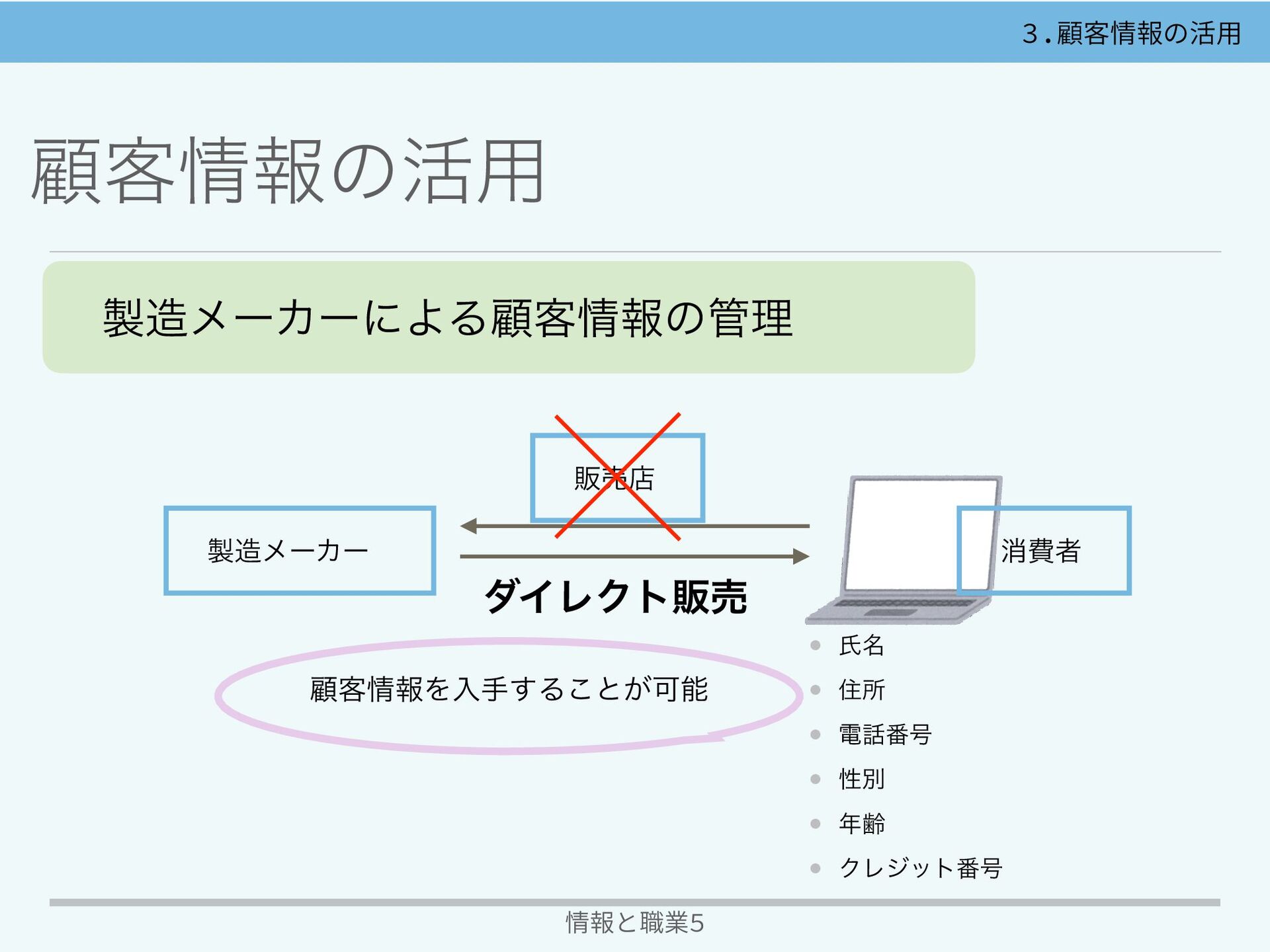 情報と職業5 ސ٬ใͷ׆༻ 3.顧客情報の活 用 ϝʔΧʔʹΑΔސ٬ใͷཧ ϝʔΧʔ μΠϨΫτൢച ൢചళ • ࢯ໊