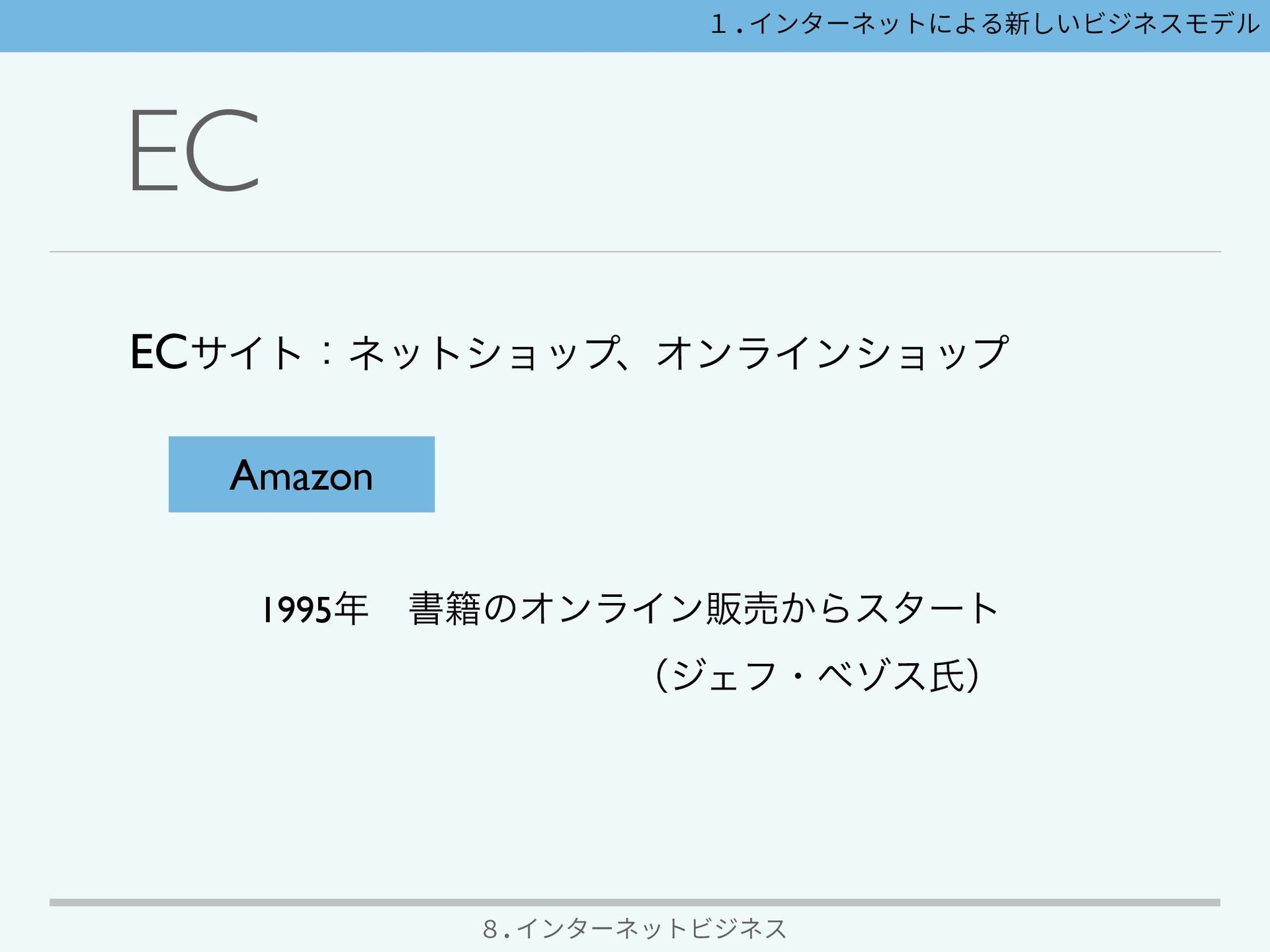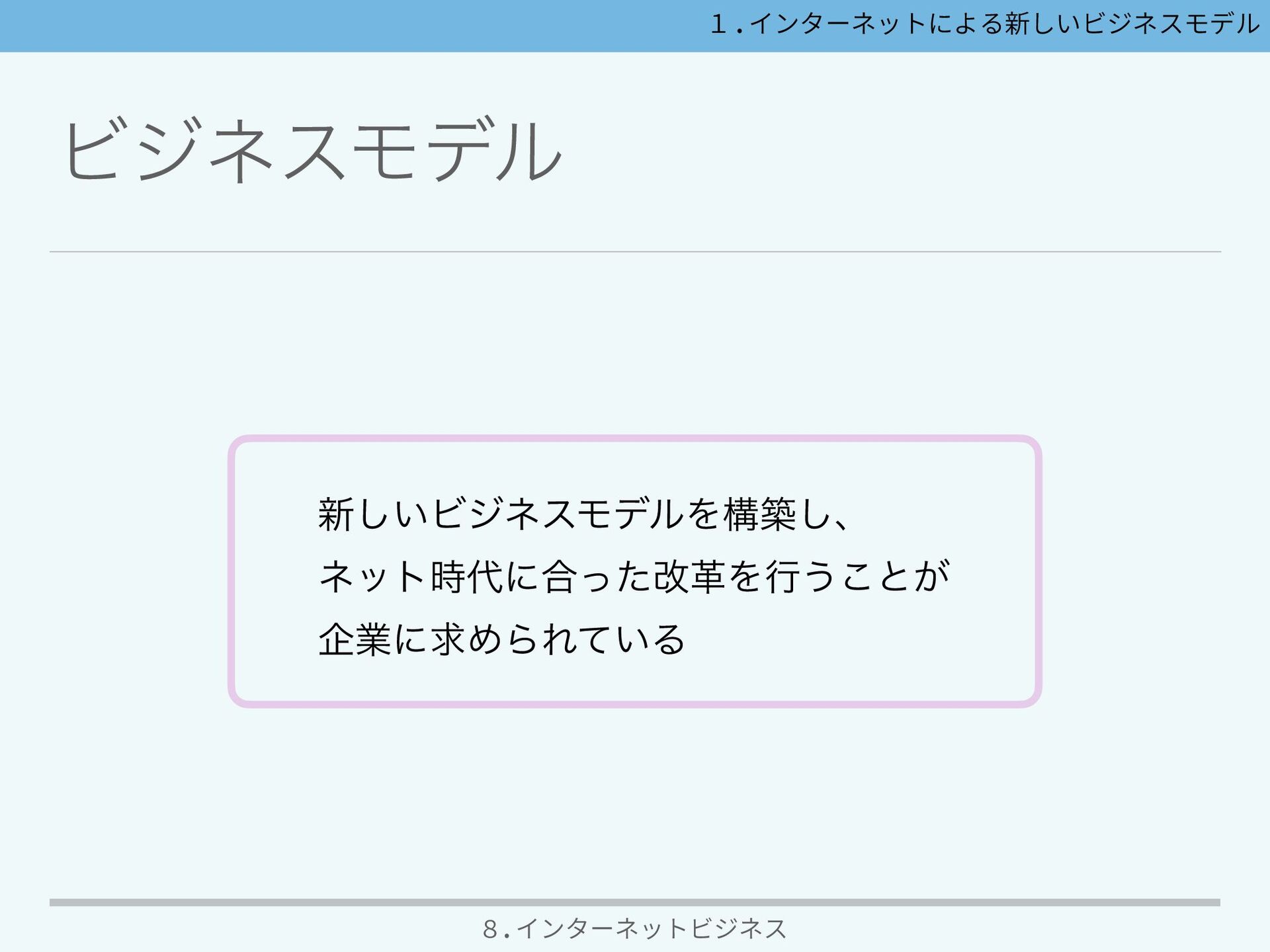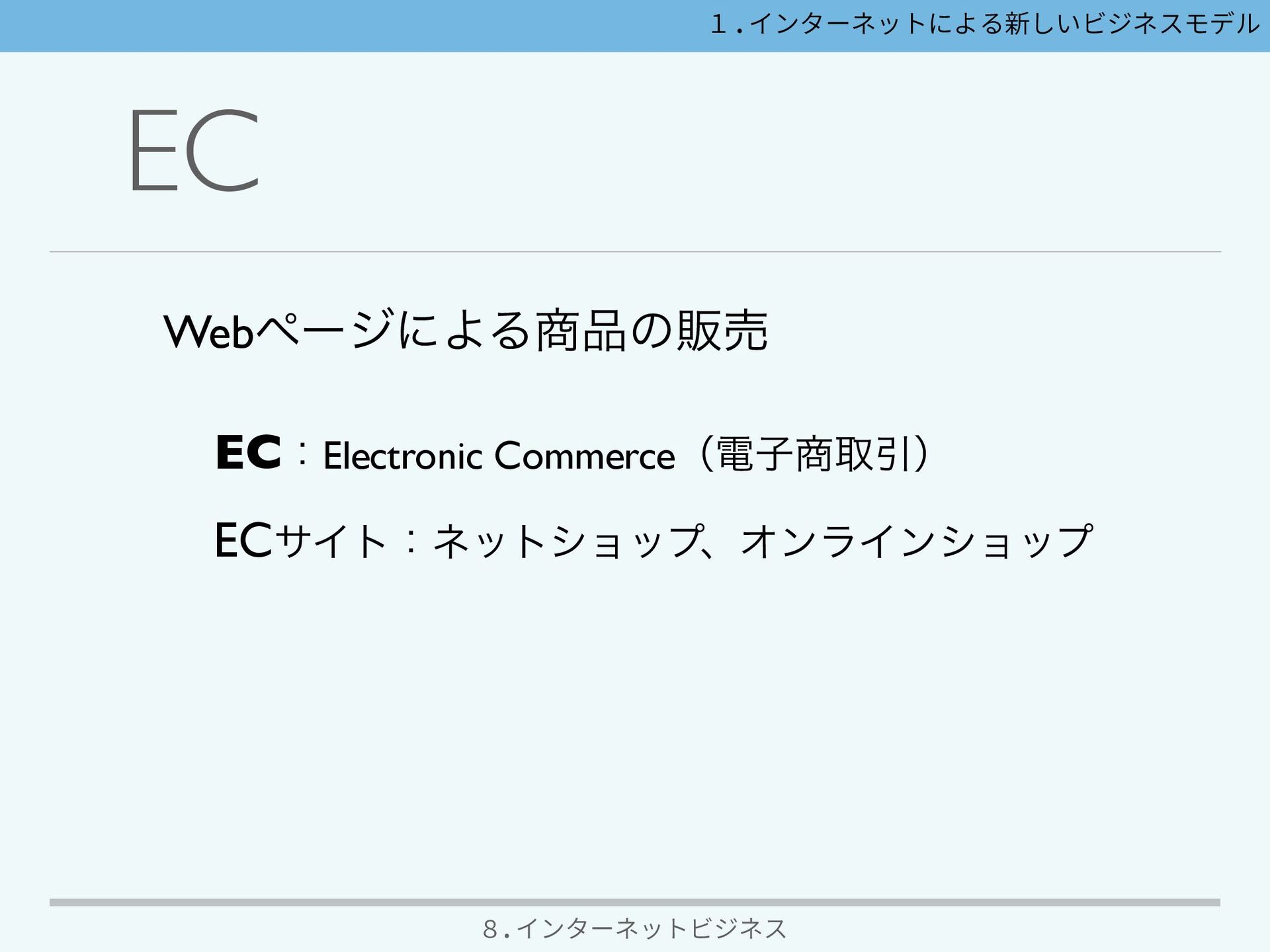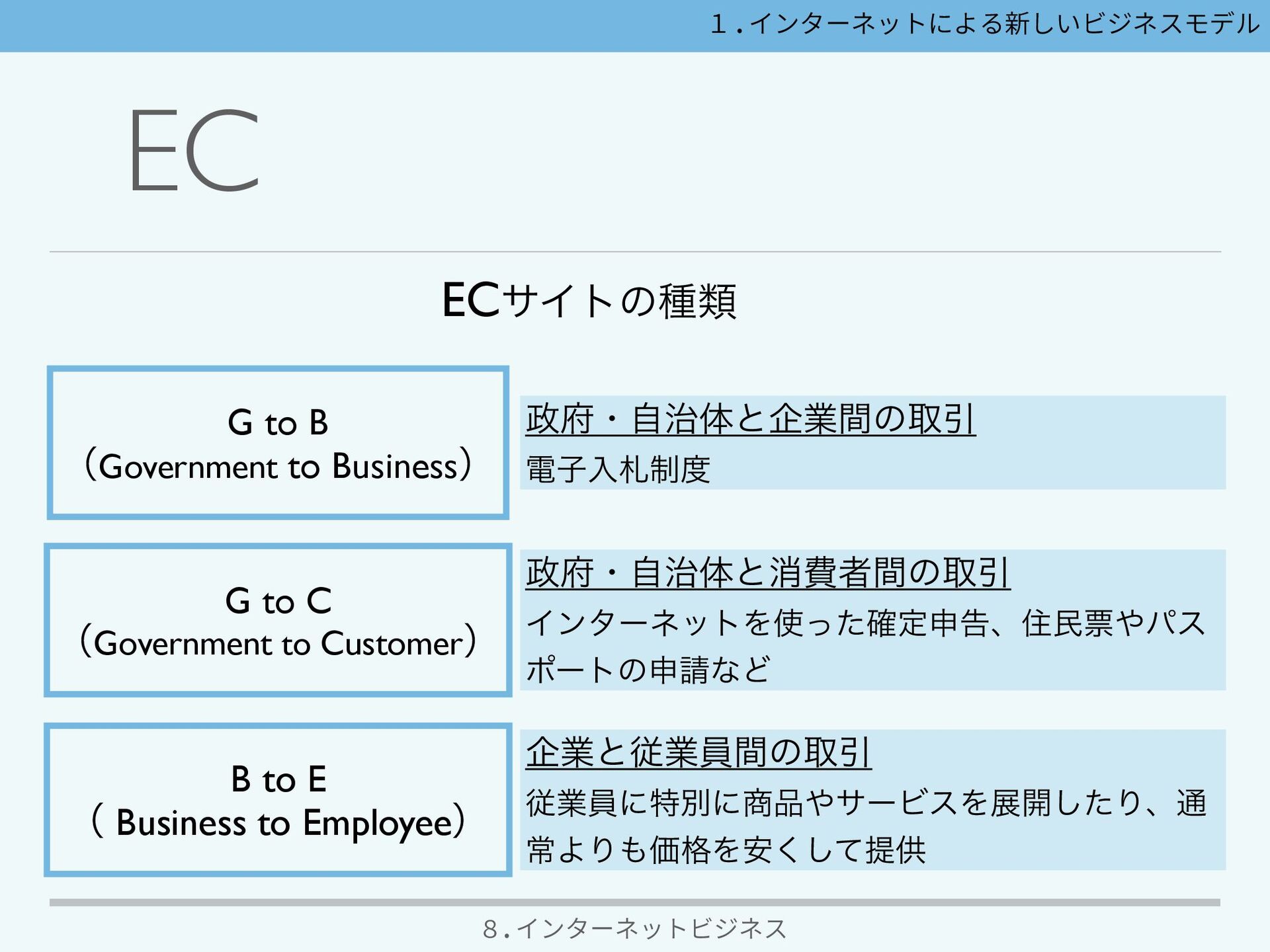 C ʢGovernment to Customerʣ ɾ࣏ࣗମͱফඅऀؒͷऔҾ ΠϯλʔωοτΛͬͨ֬ఆਃࠂɺॅຽථύε ϙʔτͷਃͳͲ B to E ʢ Business to Employeeʣ اۀͱैۀһؒͷऔҾ ैۀһʹಛผʹαʔϏεΛల։ͨ͠Γɺ௨ ৗΑΓՁ֨Λ҆ͯ͘͠ఏڙ EC 1.インターネットによる新しいビジネスモデル ECαΠτͷछྨ 8.インターネットビジネス