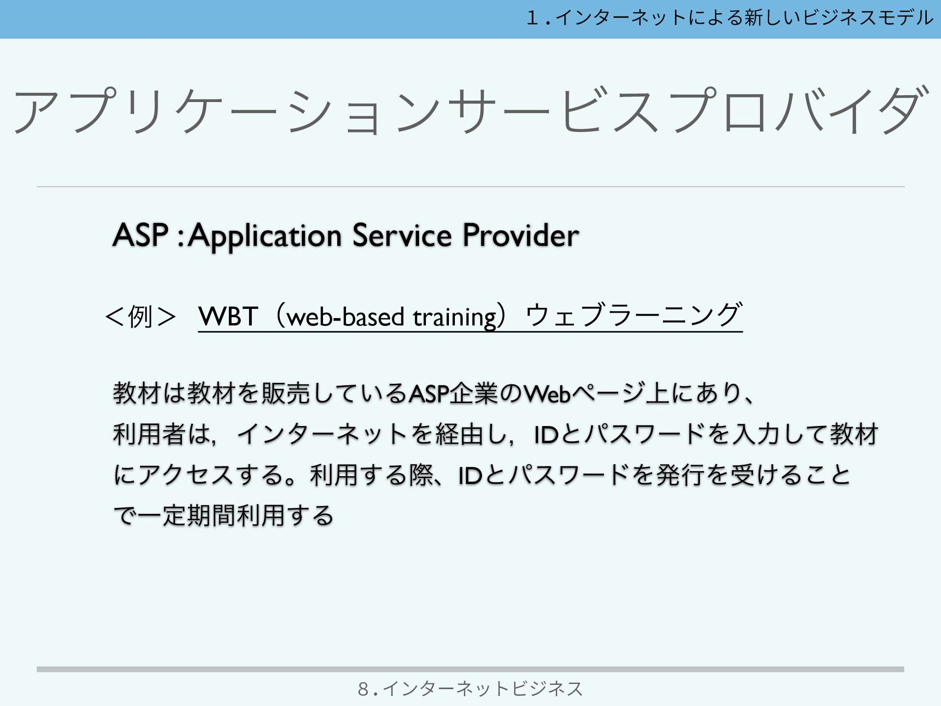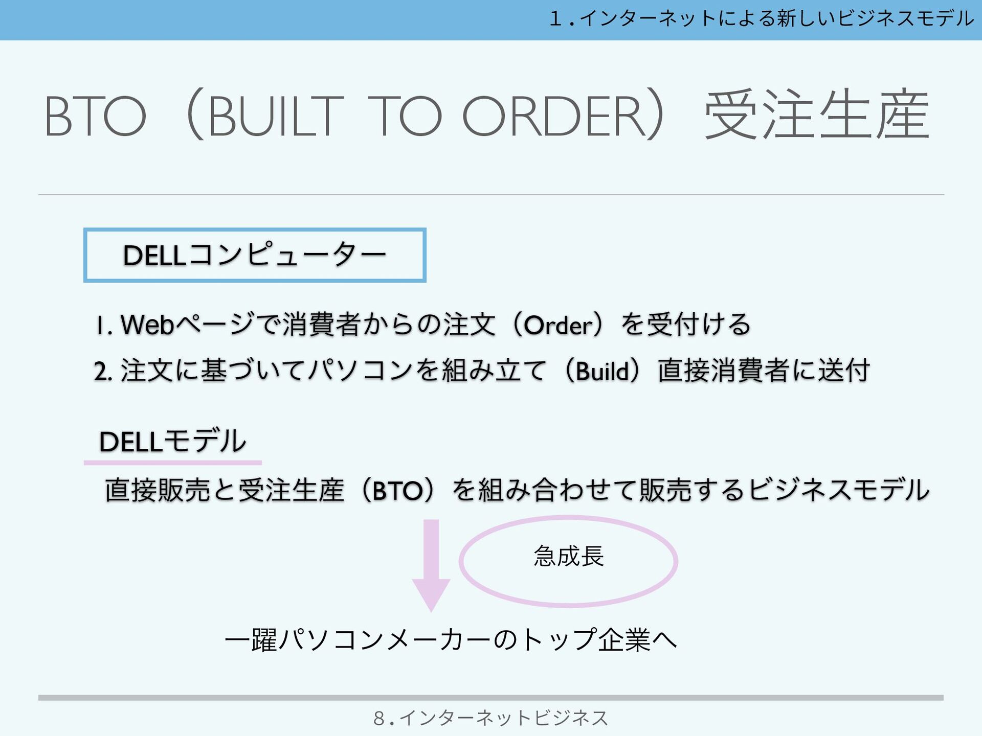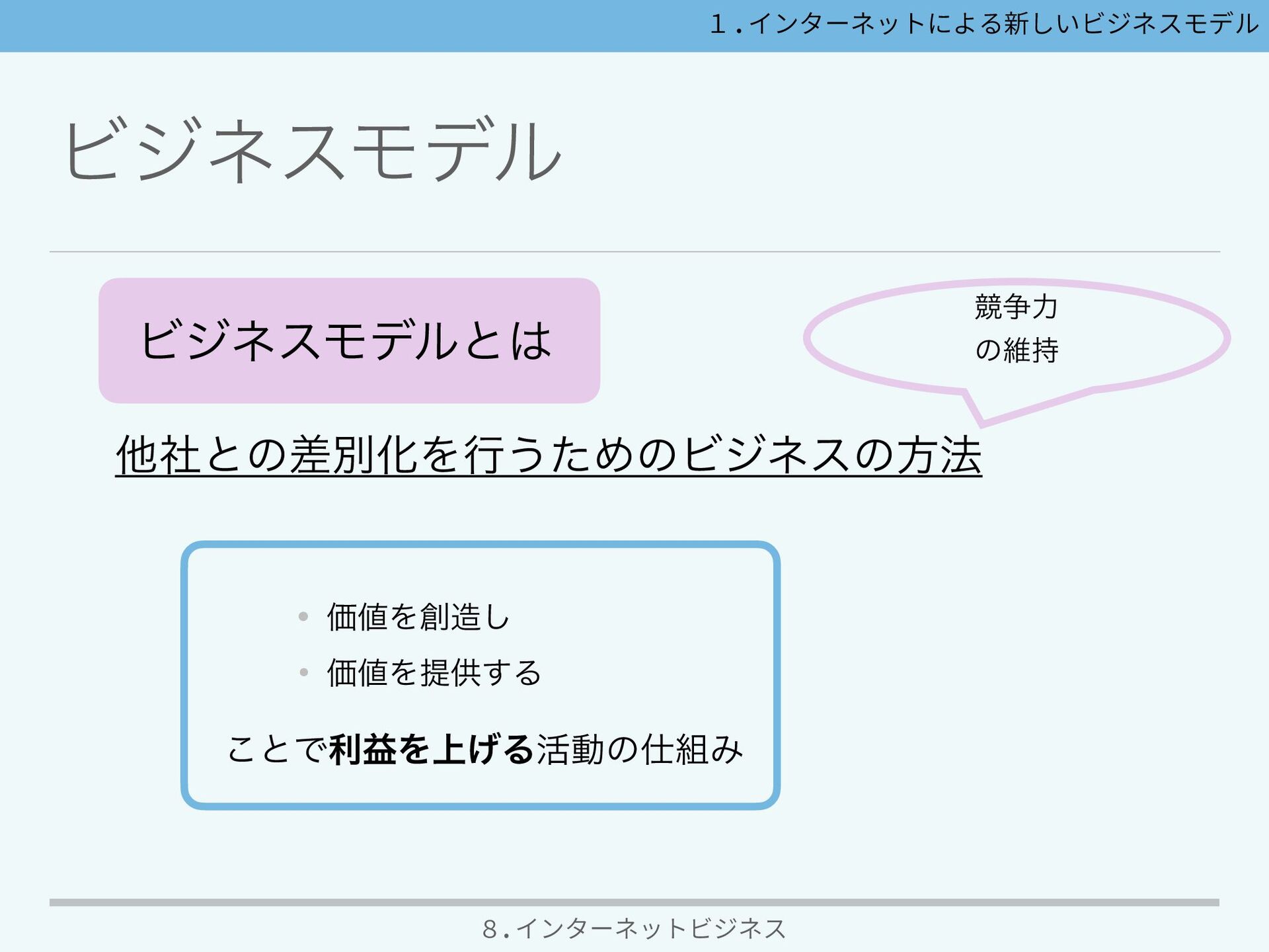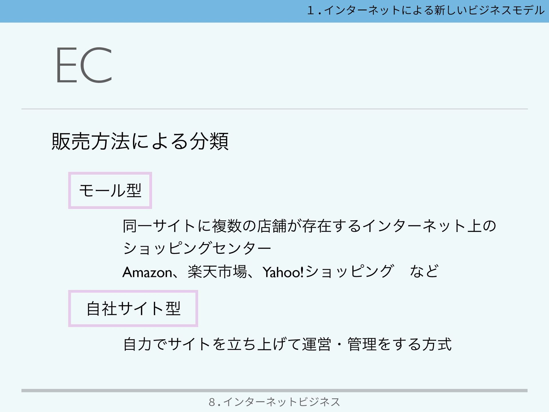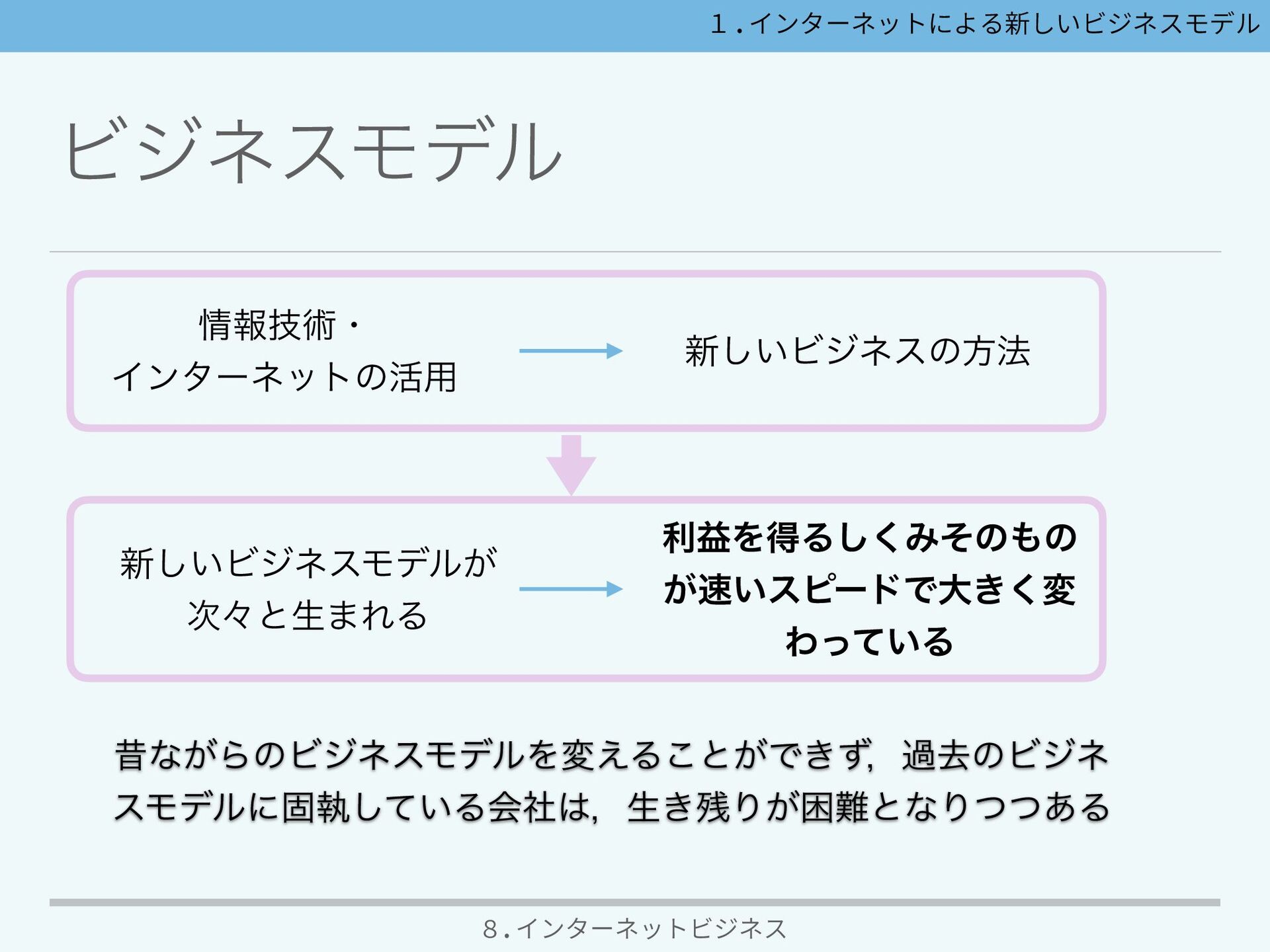 C ʢGovernment to Customerʣ ɾ࣏ࣗମͱফඅऀؒͷऔҾ ΠϯλʔωοτΛͬͨ֬ఆਃࠂɺॅຽථύε ϙʔτͷਃͳͲ B to E ʢ Business to Employeeʣ اۀͱैۀһؒͷऔҾ ैۀһʹಛผʹαʔϏεΛల։ͨ͠Γɺ௨ ৗΑΓՁ֨Λ҆ͯ͘͠ఏڙ EC 1.インターネットによる新しいビジネスモデル ECαΠτͷछྨ 8.インターネットビジネス