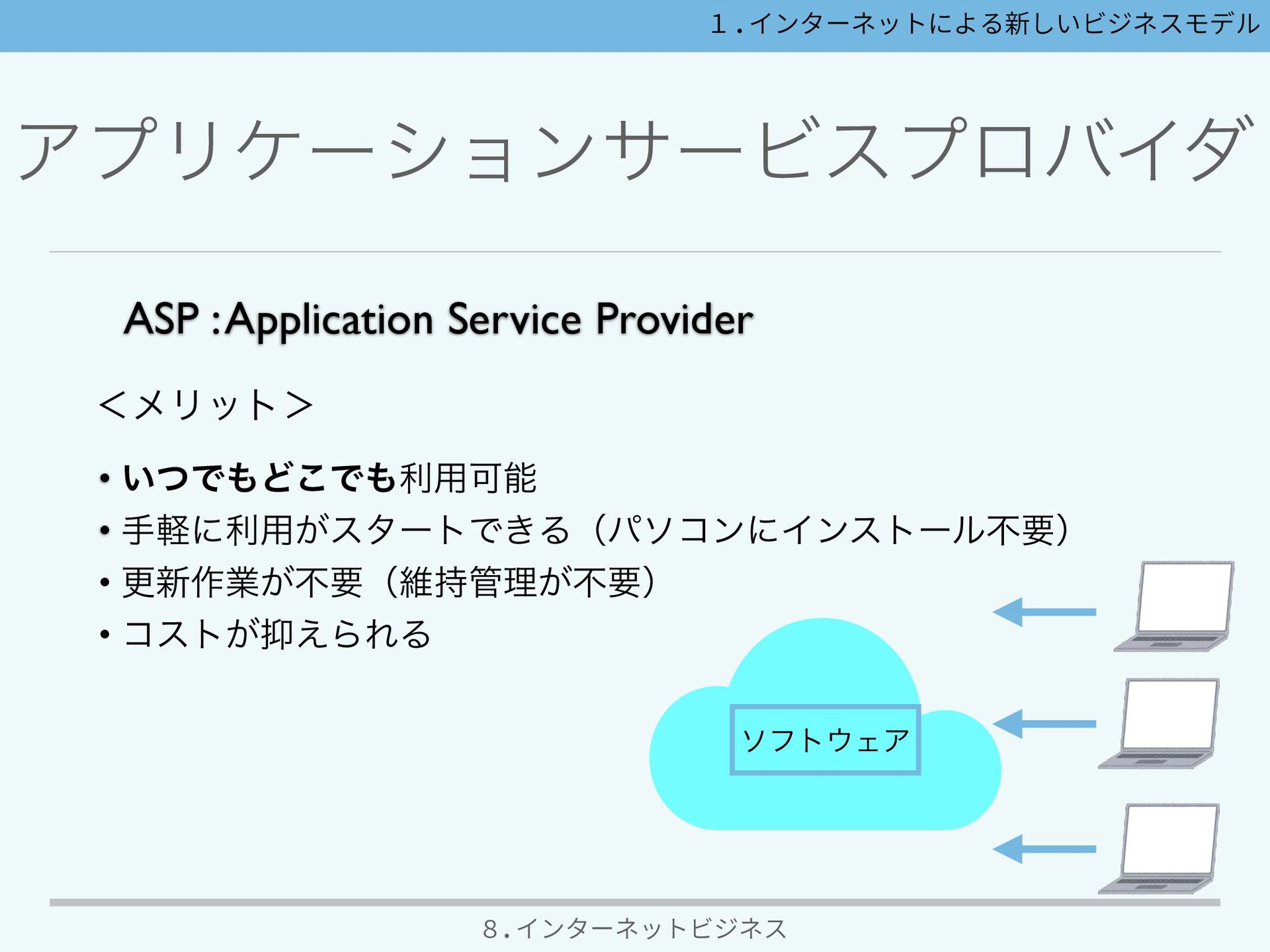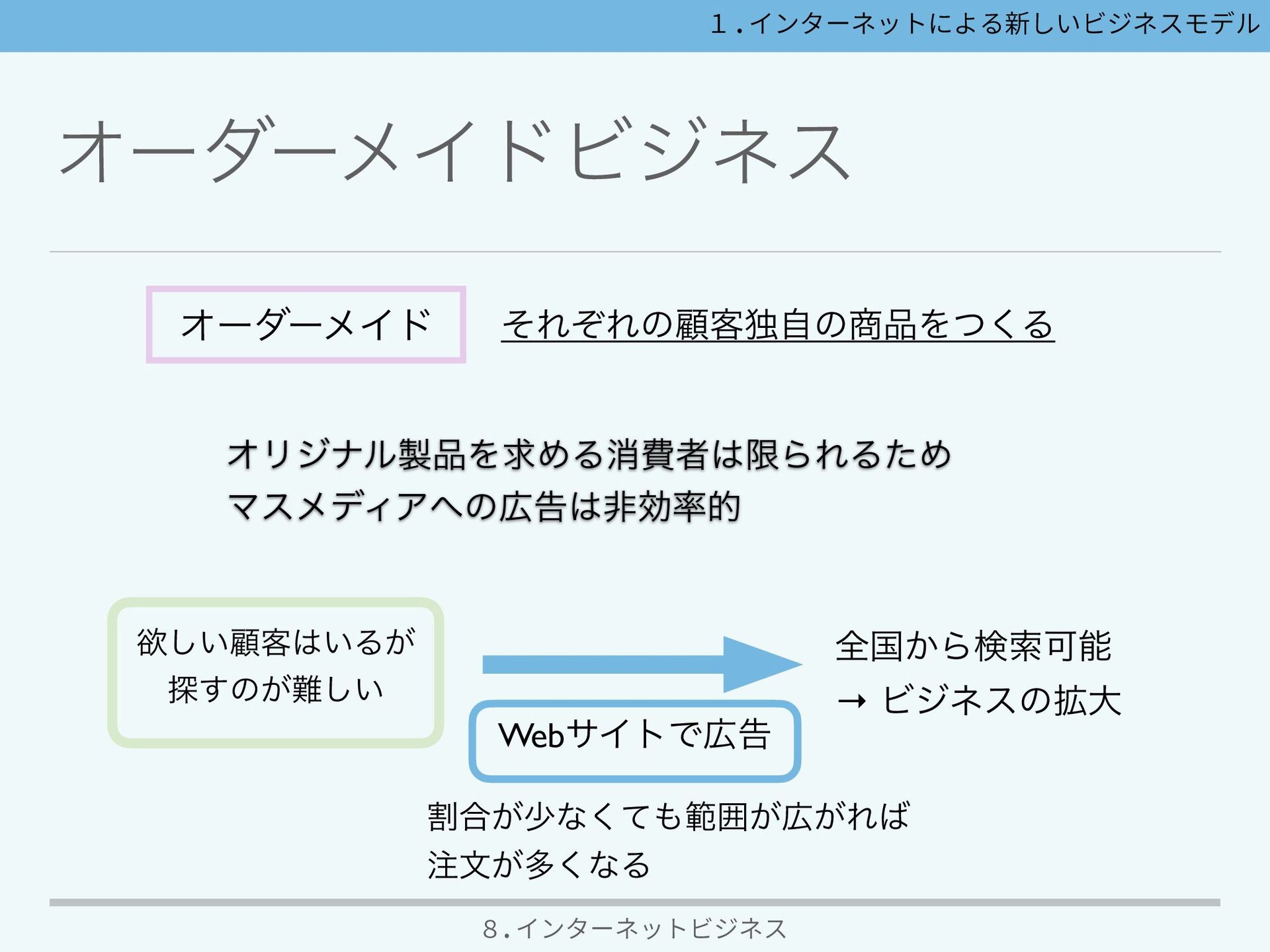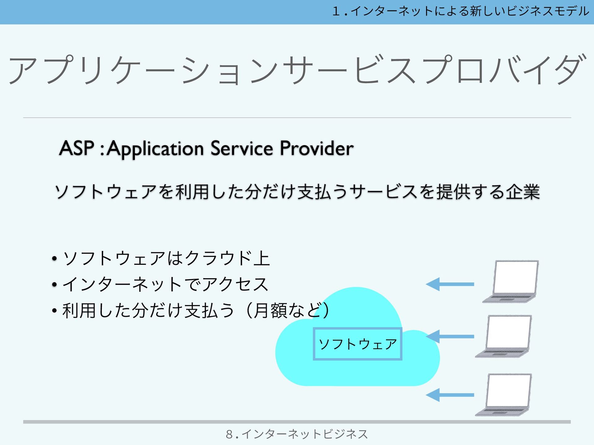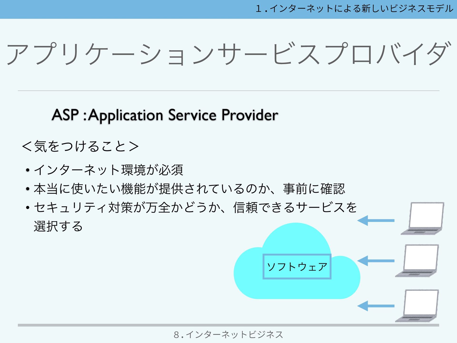 C ʢGovernment to Customerʣ ɾ࣏ࣗମͱফඅऀؒͷऔҾ ΠϯλʔωοτΛͬͨ֬ఆਃࠂɺॅຽථύε ϙʔτͷਃͳͲ B to E ʢ Business to Employeeʣ اۀͱैۀһؒͷऔҾ ैۀһʹಛผʹαʔϏεΛల։ͨ͠Γɺ௨ ৗΑΓՁ֨Λ҆ͯ͘͠ఏڙ EC 1.インターネットによる新しいビジネスモデル ECαΠτͷछྨ 8.インターネットビジネス