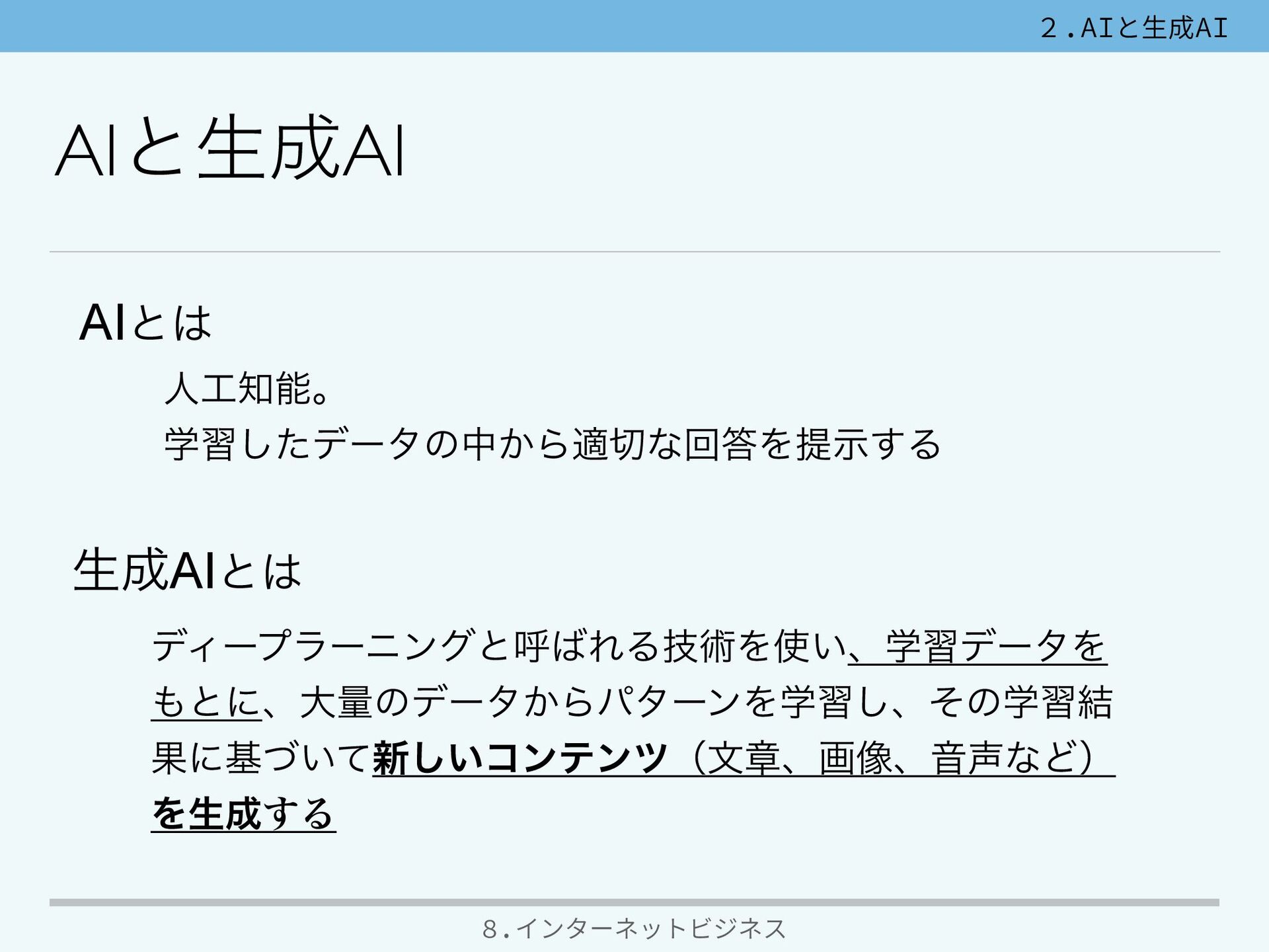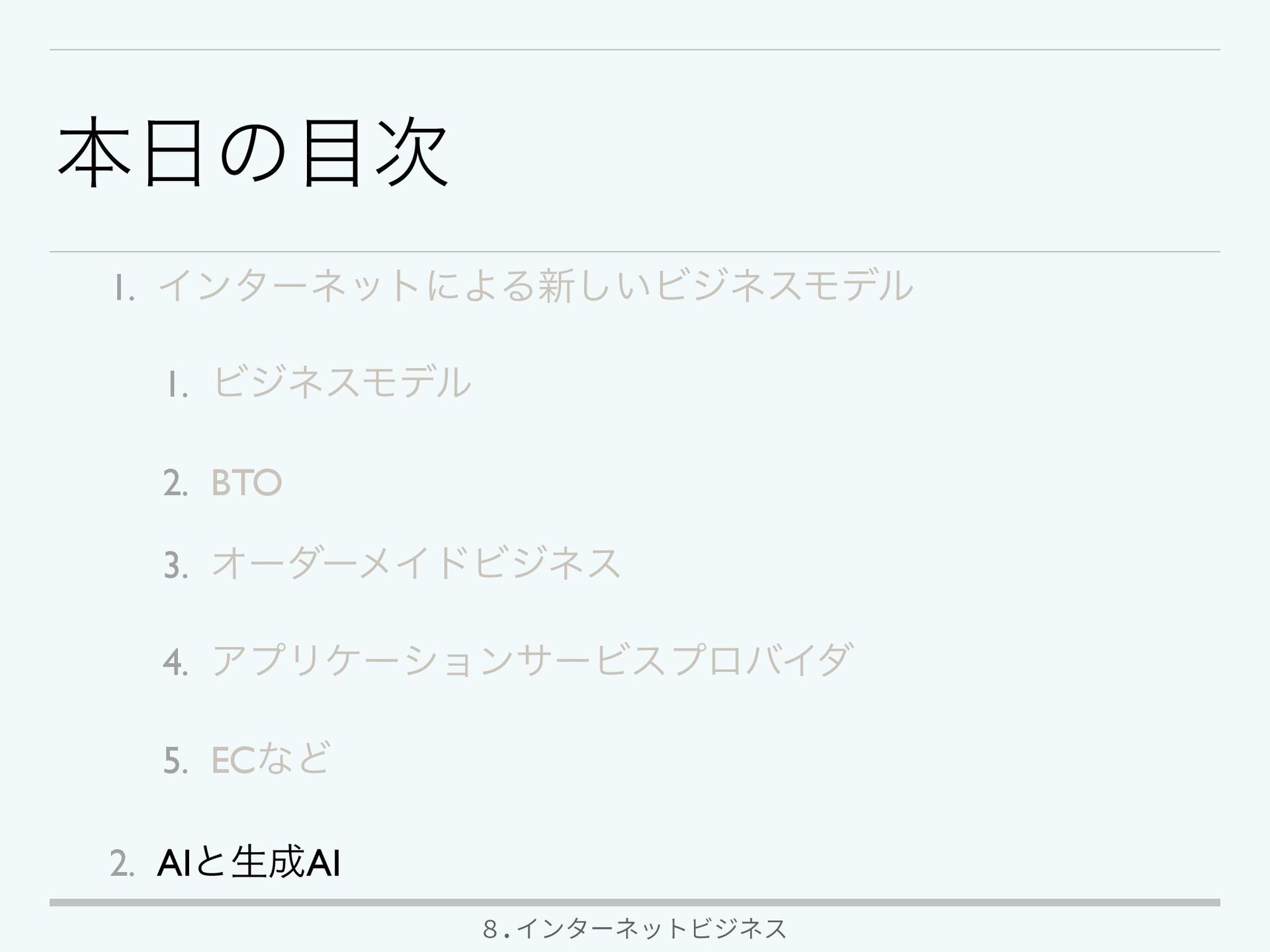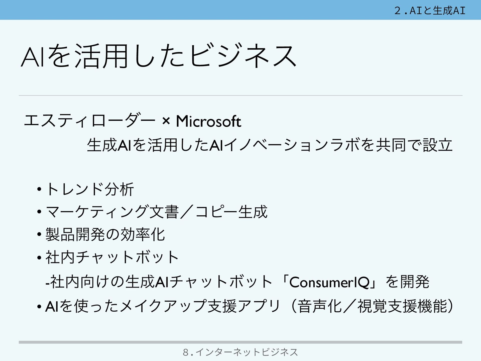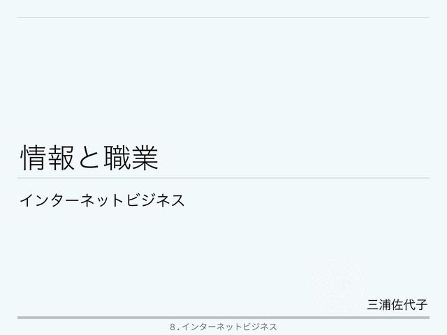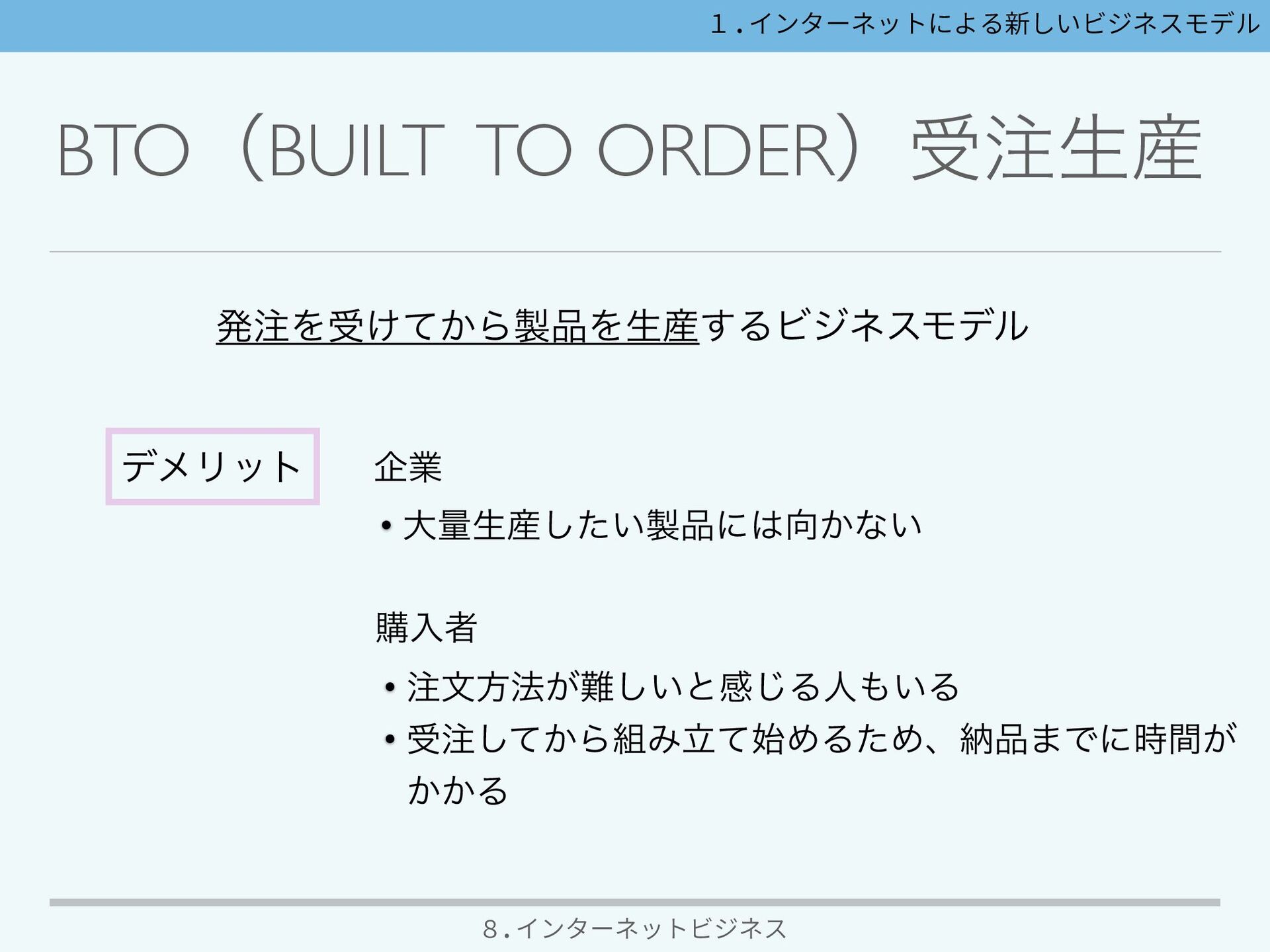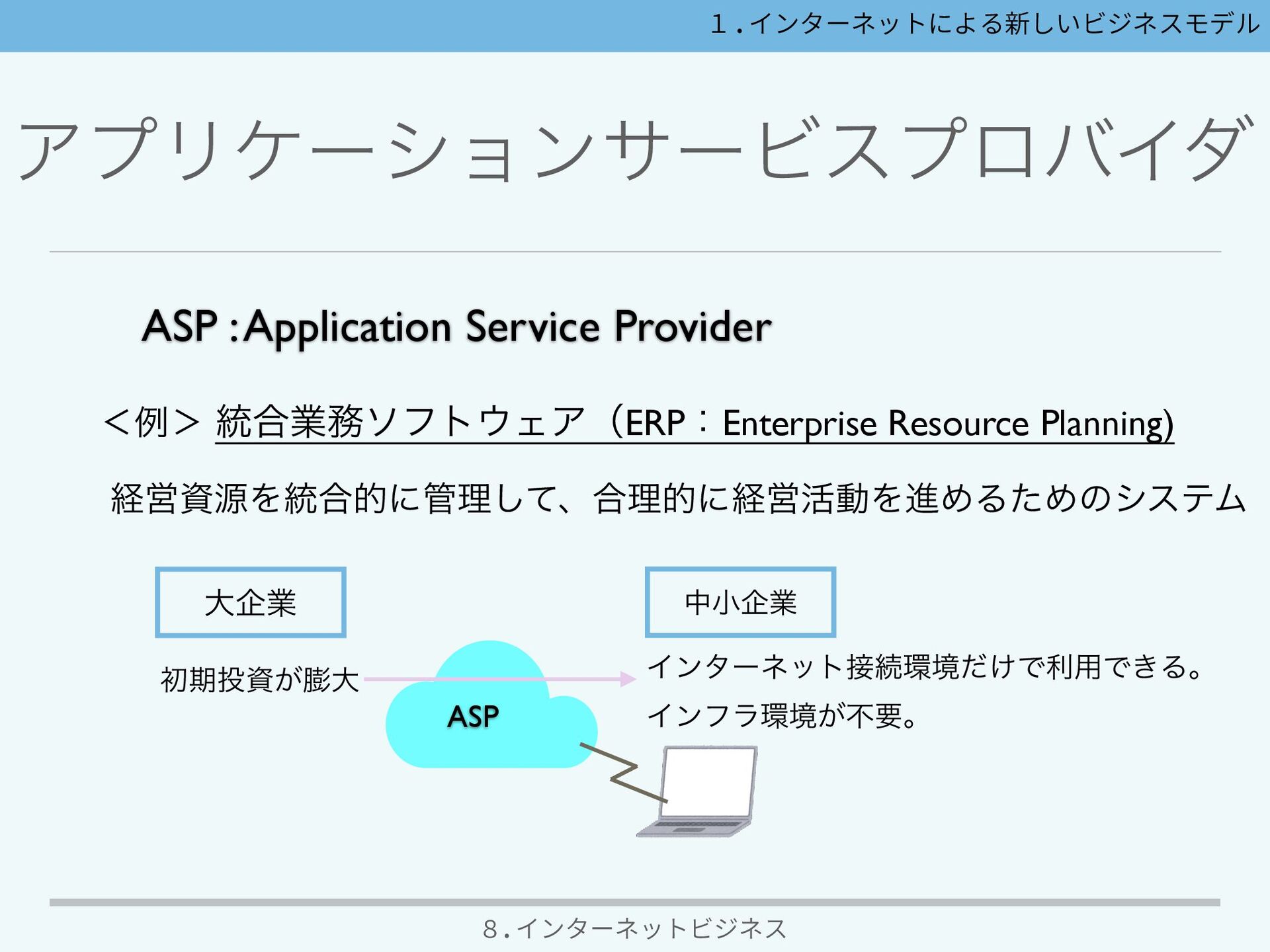 C ʢGovernment to Customerʣ ɾ࣏ࣗମͱফඅऀؒͷऔҾ ΠϯλʔωοτΛͬͨ֬ఆਃࠂɺॅຽථύε ϙʔτͷਃͳͲ B to E ʢ Business to Employeeʣ اۀͱैۀһؒͷऔҾ ैۀһʹಛผʹαʔϏεΛల։ͨ͠Γɺ௨ ৗΑΓՁ֨Λ҆ͯ͘͠ఏڙ EC 1.インターネットによる新しいビジネスモデル ECαΠτͷछྨ 8.インターネットビジネス