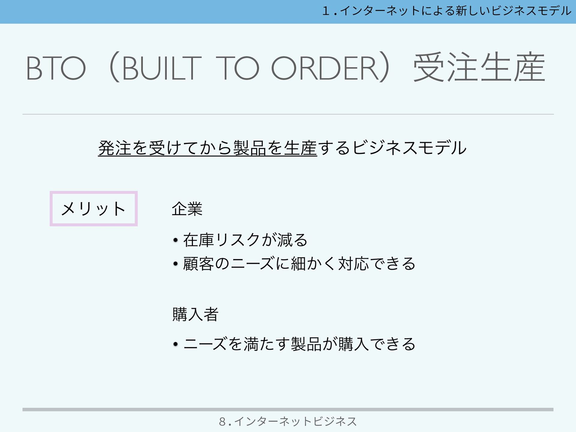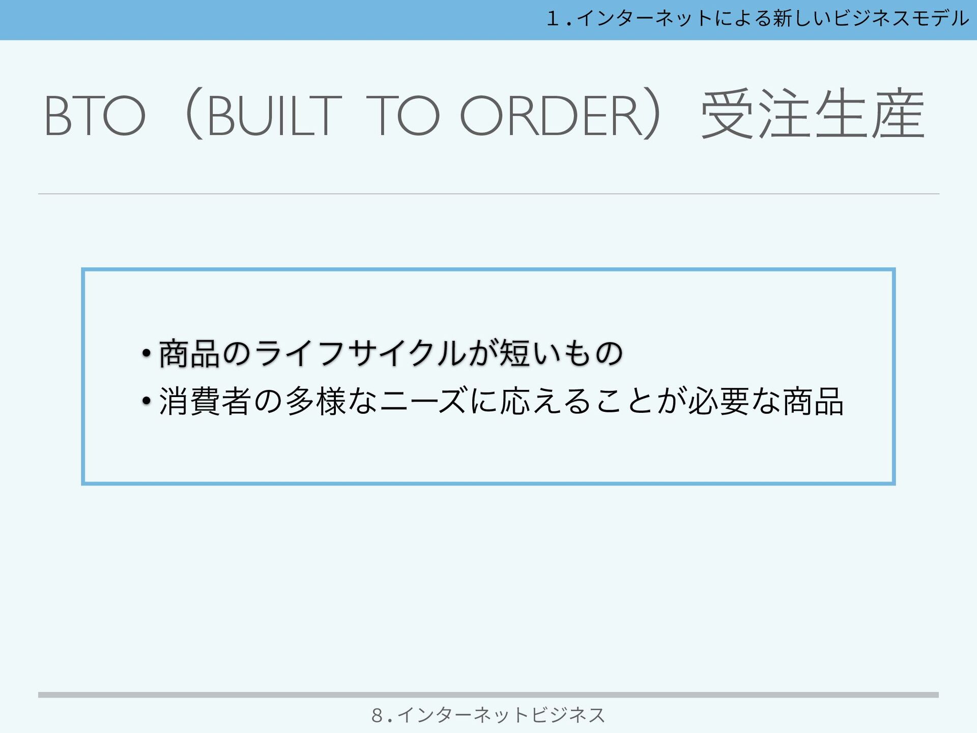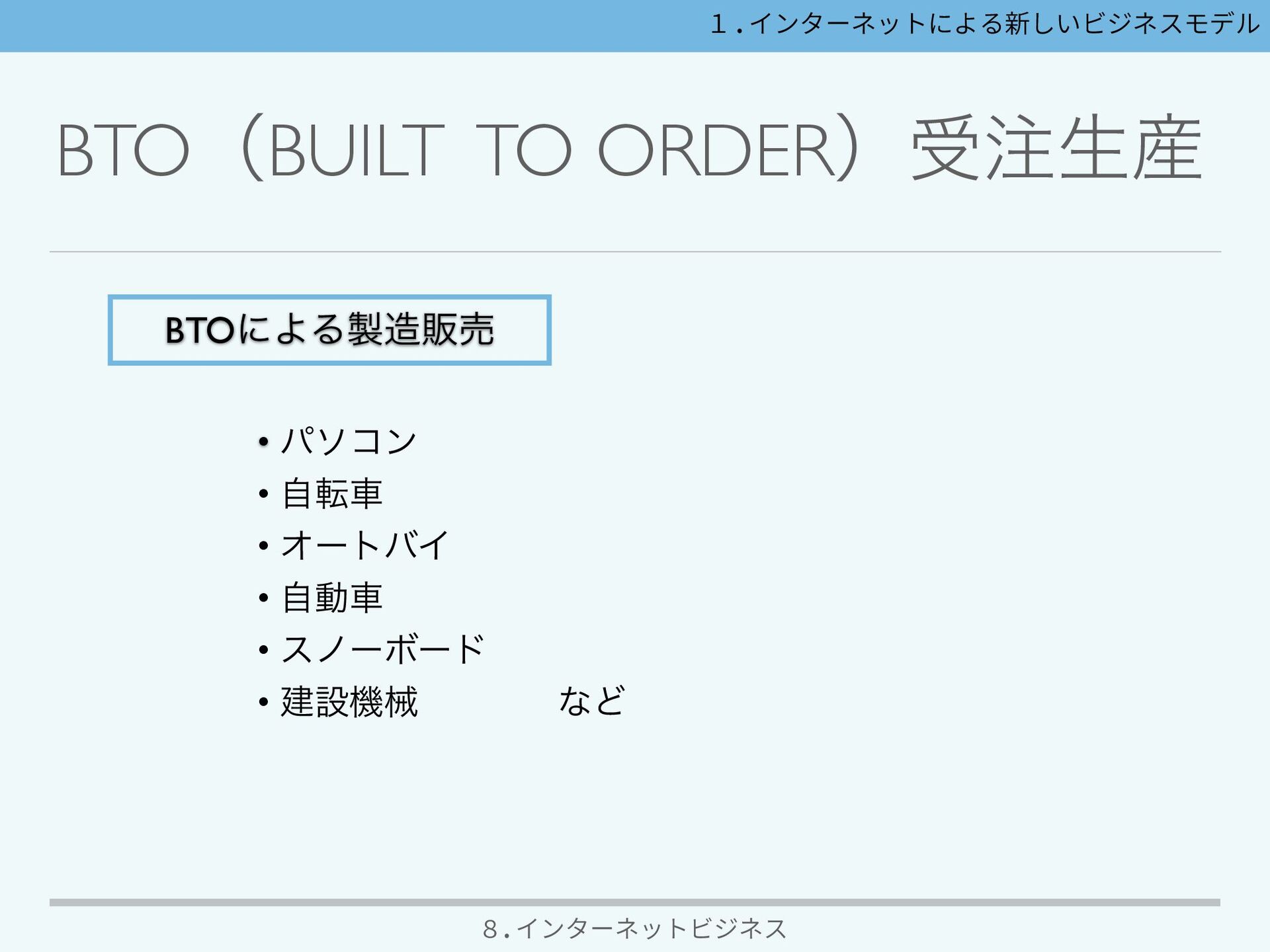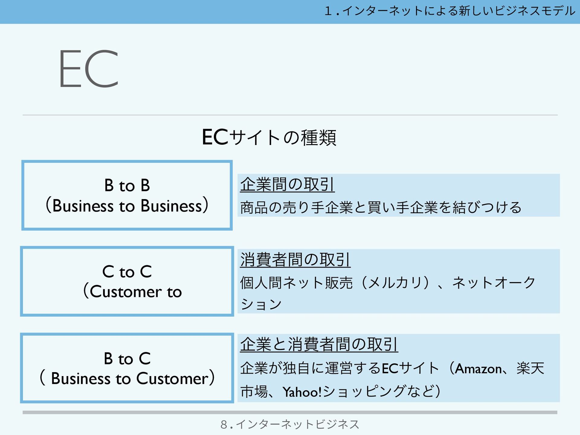 C to C ʢCustomer to ফඅऀؒͷऔҾ ݸਓؒωοτൢചʢϝϧΧϦʣɺωοτΦʔΫ γϣϯ B to C ʢ Business to Customerʣ اۀͱফඅऀؒͷऔҾ اۀ͕ಠࣗʹӡӦ͢ΔECαΠτʢAmazonɺָఱ ࢢɺYahoo!γϣοϐϯάͳͲʣ 1.インターネットによる新しいビジネスモデル 8.インターネットビジネス