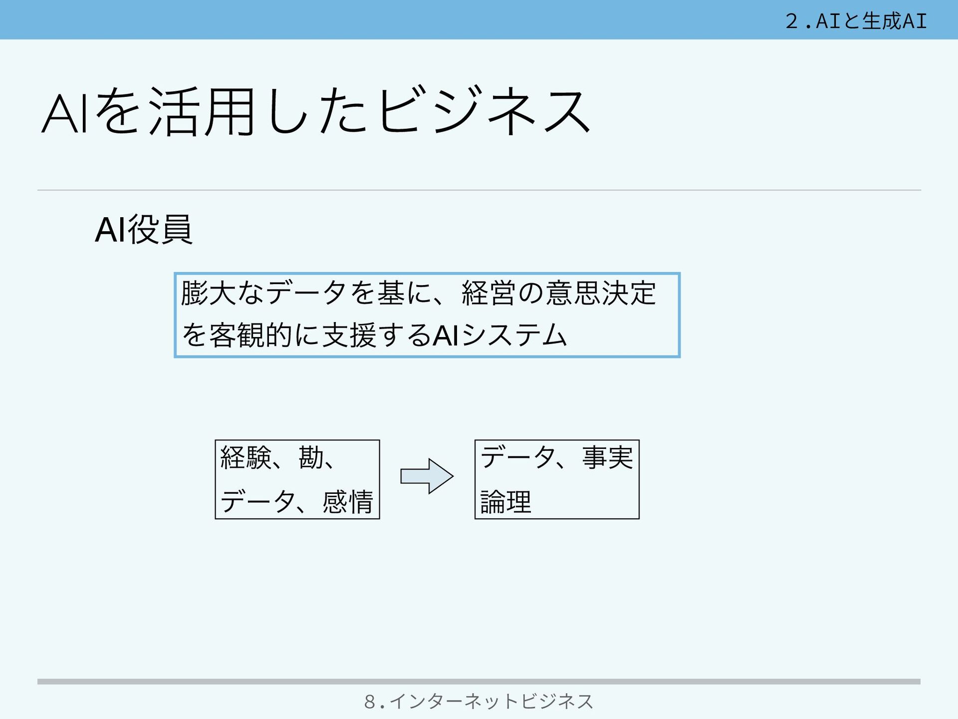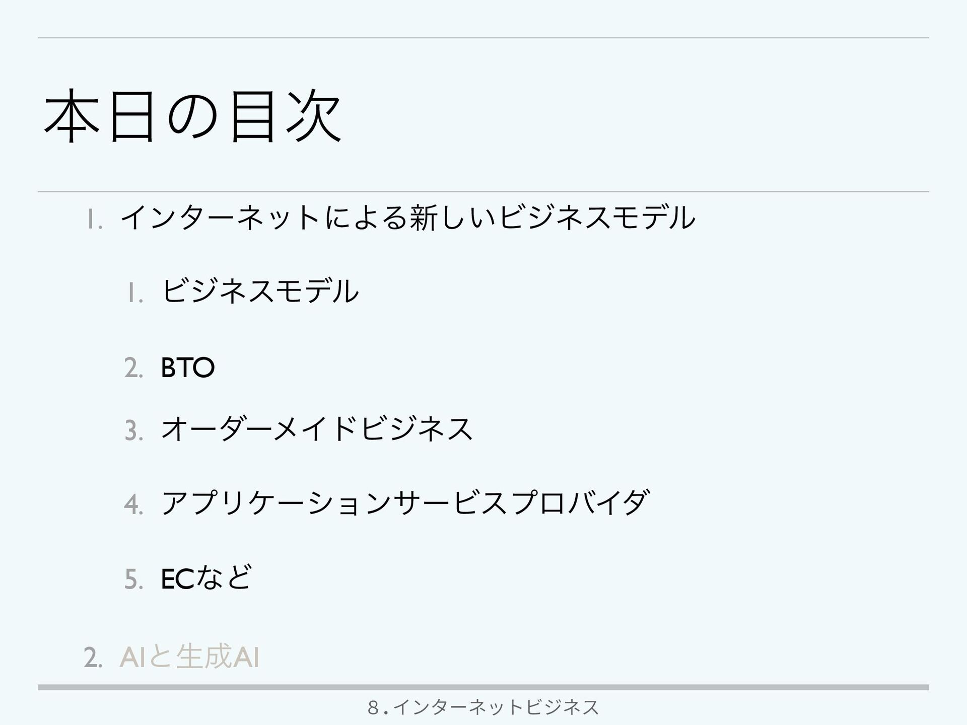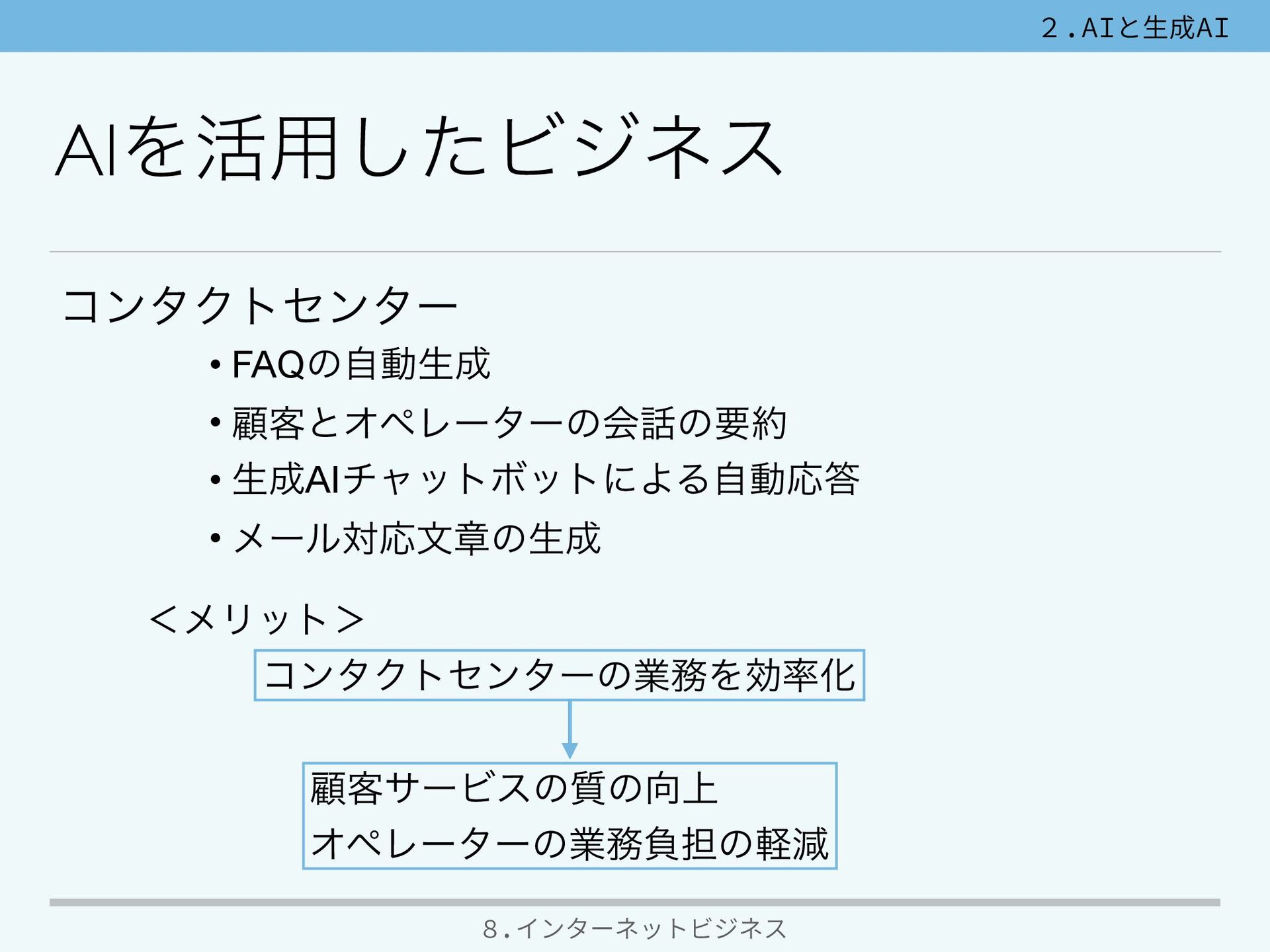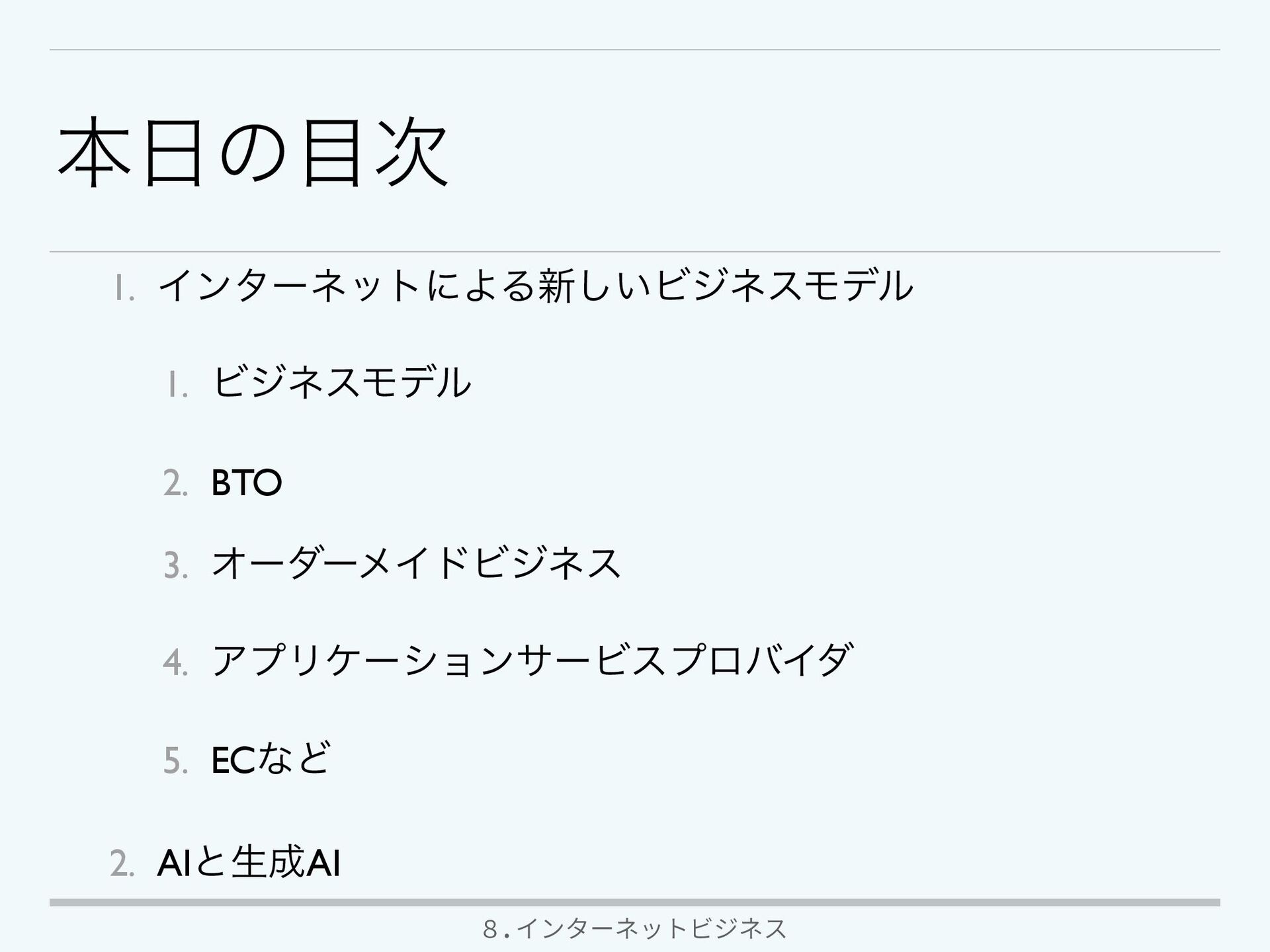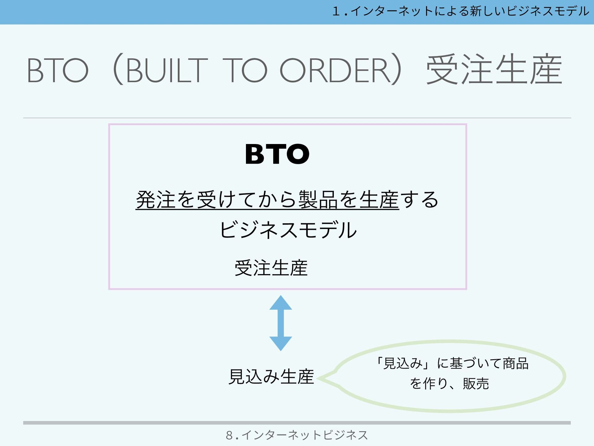 C to C ʢCustomer to ফඅऀؒͷऔҾ ݸਓؒωοτൢചʢϝϧΧϦʣɺωοτΦʔΫ γϣϯ B to C ʢ Business to Customerʣ اۀͱফඅऀؒͷऔҾ اۀ͕ಠࣗʹӡӦ͢ΔECαΠτʢAmazonɺָఱ ࢢɺYahoo!γϣοϐϯάͳͲʣ 1.インターネットによる新しいビジネスモデル 8.インターネットビジネス