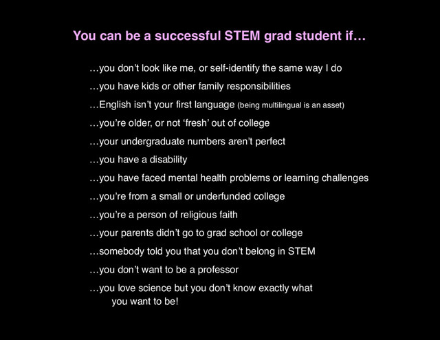 don’t look like me, or self-identify the same way I do …you have kids or other family responsibilities …English isn’t your first language (being multilingual is an asset) …you’re older, or not ‘fresh’ out of college …your undergraduate numbers aren’t perfect …you have a disability …you have faced mental health problems or learning challenges …you’re from a small or underfunded college …you’re a person of religious faith …your parents didn’t go to grad school or college …somebody told you that you don’t belong in STEM …you don’t want to be a professor …you love science but you don’t know exactly what you want to be!