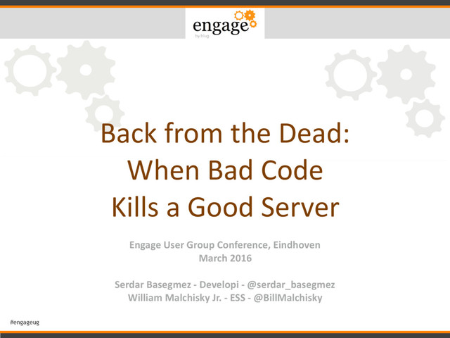 Good Server Engage User Group Conference, Eindhoven March 2016 Serdar Basegmez - Developi - @serdar_basegmez William Malchisky Jr. - ESS - @BillMalchisky