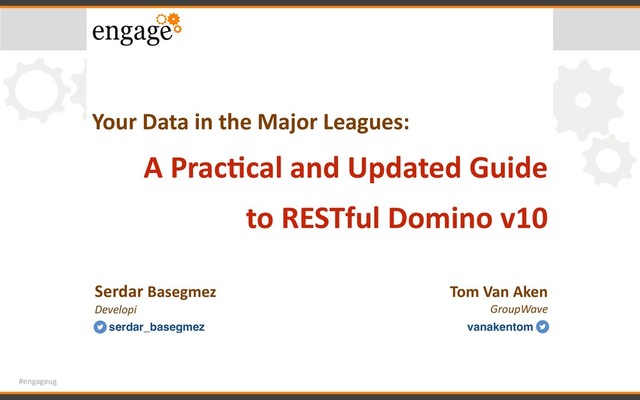 Things are moving fast with many new tools and toys in our hands. While Domino v10 creates a whole new world of possibilities, we still need to interact with other internal and external applications. One of the key technologies to do that is the RESTful services and we have an updated toolbox now. Regardless of your experience, come to this session to see what options are available to you, what pitfalls you may experience and how to break down the borders between your applications and others. We will present the basic concepts and best practices, allowing you to walk away with the techniques that you will need to take your applications to the next level. Last but not the least, we will show you practical examples on how you provide RESTful services for other applications and how you can use REST data to enrich your applications using the the new capabilities.