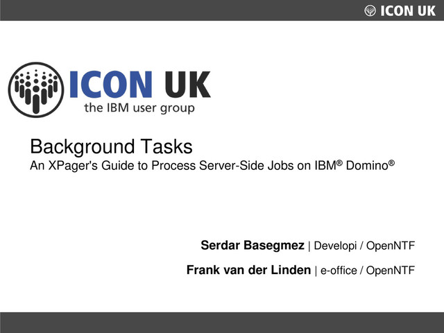 Java and in particular OSGi are now very important parts of the Notes/Domino app dev model. In this session, you will learn what techniques can be utilized to process background jobs for XPages applications. Whether you want to replace your existing agents with Domino OSGi Tasklet Services (DOTS) or use Eclipse Jobs to run time-consuming routines without interrupting the use of your application - we will show you real life examples of why and how. You should also consider attending this session to hear about some suprises you don't want to miss...