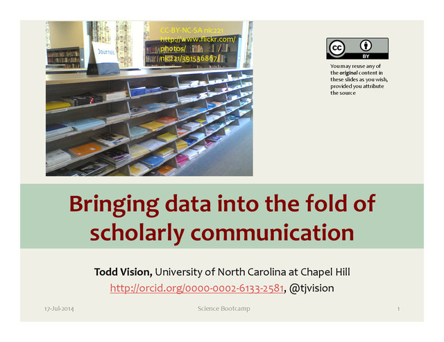 Todd Vision, University of North Carolina at Chapel Hill http://orcid.org/0000-‐0002-‐6133-‐2581, @tjvision 17-‐Jul-‐2014 You may reuse any of the original content in these slides as you wish, provided you attribute the source Science Bootcamp 1 CC-‐BY-‐NC-‐SA nic221 http://www.flickr.com/ photos/ nic221/391536867/