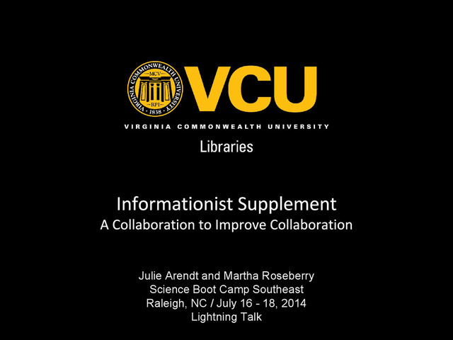 National Institutes of Health R01-AG041823 Data Curation Profiles Toolkit • http://datacurationprofiles.org/ Images • Soong, K. (2012). How Cetaceans communicate. http://kristensoong.deviantart.com/art/How-Cetaceans- communicate-328773417 • Nevins Memorial Historic Collection. (circa 1900), http://commons.wikimedia.org/wiki/File: Nevins_Library_First_Librarians.jpg • Christman, E. (2013). VCU HAVOC at the 2013 Monument Avenue 10k. https://flic.kr/p/eba8dS • Hancock, J. D. (2010). Data vs. Spock (70/365). https://flic.kr/p/7K6TWX • Zotero logo. Used by permission: https://www.zotero.org/support/brand • Parameswaran, H., Majumdar, A., & Suki, B. (2011). Linking microscopic spatial patterns of tissue destruction in emphysema to macroscopic decline in stiffness using a 3D computational model. [Figure 1] PLoS Computational Biology, 7(4). http://www.ploscompbiol.org/article/info%3Adoi%2F10.1371%2Fjournal.pcbi.1001125 • msevilla00 (2011). Z Globe. http://openclipart.org/image/300px/svg_to_png/122317/Z-ico.png • Ekkel, M. (2010). Whale Shark Diving. https://flic.kr/p/8jtUAH