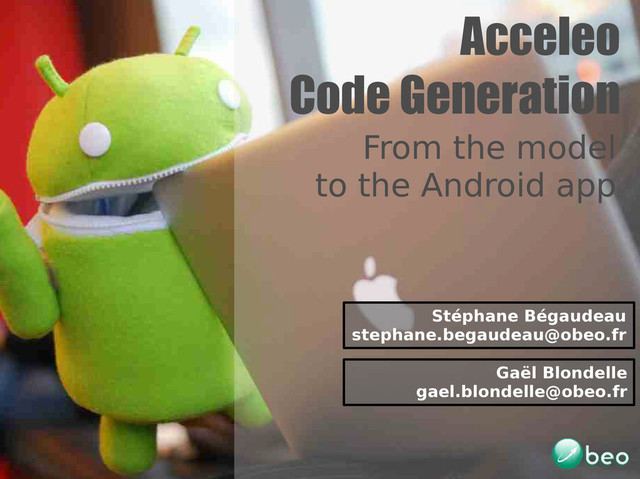 Acceleo code generation, from the model to an Android application. Thanks to the use of Eclipse modeling, you will see how we can use a domain specific model to generate an Android application.