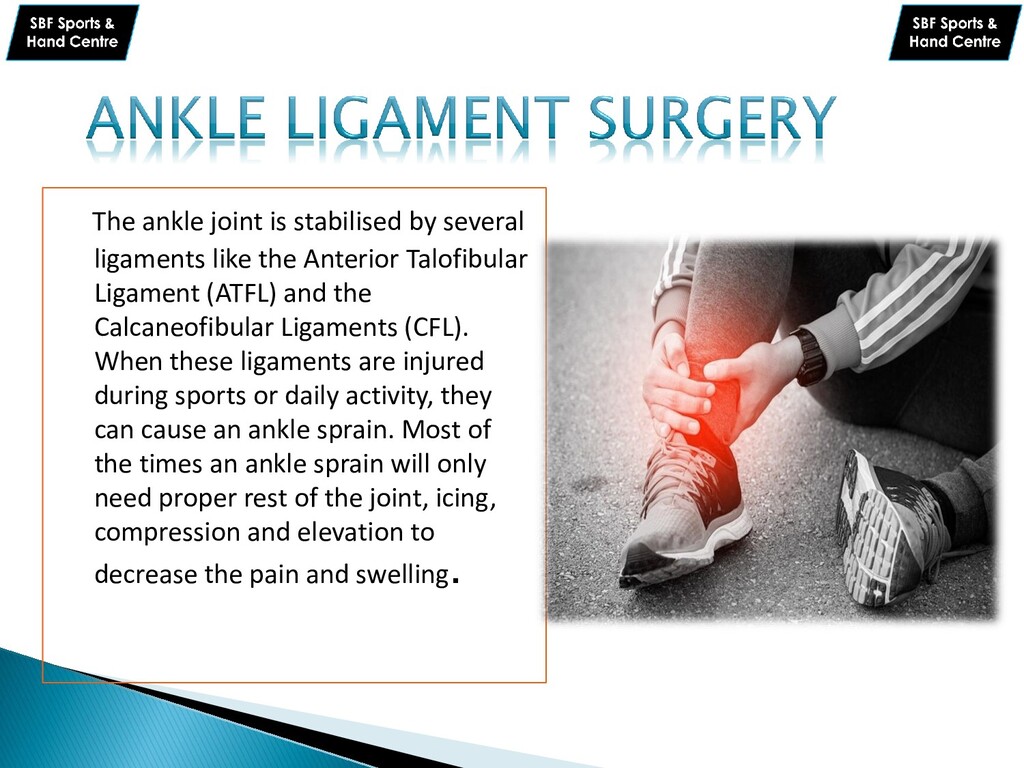Anterior Talofibular Ligament (ATFL) and the Calcaneofibular Ligaments (CFL). When these ligaments are injured during sports or daily activity, they can cause an ankle sprain. Most of the times an ankle sprain will only need proper rest of the joint, icing, compression and elevation to decrease the pain and swelling.