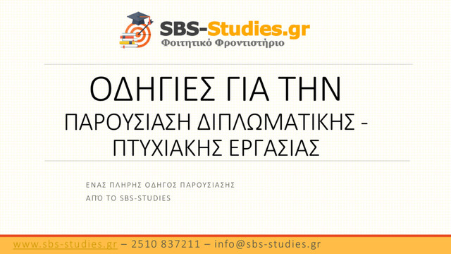 εισαγωγή, την παρουσίαση του προβλήματος και το θεωρητικό υπόβαθρο, δηλαδή υλικό που προϋπήρχε της διπλωματικής εργασίας και δε δημιουργήθηκε από το φοιτητή. Οι υπόλοιπες 10 διαφάνειες, αφορούν την εργασία του φοιτητή, δηλαδή το έργο που έχει κάνει. Ενδεικτικά, αλγόριθμος, κύκλωμα, προσομοίωση, πειράματα, μετρήσεις, συμπεράσματα, φωτογραφίες κυκλώματος, μελλοντικές επεκτάσεις. Τα συμπεράσματα να μην είναι απλές λέξεις ή φράσεις, αλλά να περιέχουν ρήματα ή επιρρήματα ή επίθετα. Π.χ. δε θα υπάρχει μια φράση “κατανάλωση ενέργειας”, αλλά “χαμηλή κατανάλωση ενέργειας” ή “βελτιστοποίηση κατανάλωσης ενέργειας”. Μετά τις παραπάνω διαφάνειες, μπορεί να τοποθετηθεί κάποια βιβλιογραφία (αναλόγως με το αν έχει ζητηθεί) καθώς και μια διαφάνεια με ευχαριστίες (ομοίως, αν υπάρχει λόγος). Στις ευχαριστίες, τοποθετούνται άτομα ή ομάδες που άμεσα ή έμμεσα βοήθησαν, συμπαραστάθηκαν και έδωσαν δύναμη για να ολοκληρωθεί η διπλωματική. www.sbs-studies.gr – 2510 837211 –