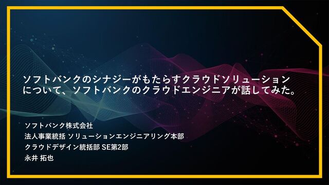 ソフトバンクのシナジーがもたらすクラウドソリューションについて、クラウドエンジニアが話してみた。 発表者 永井 拓也(ソフトバンク株式会社)