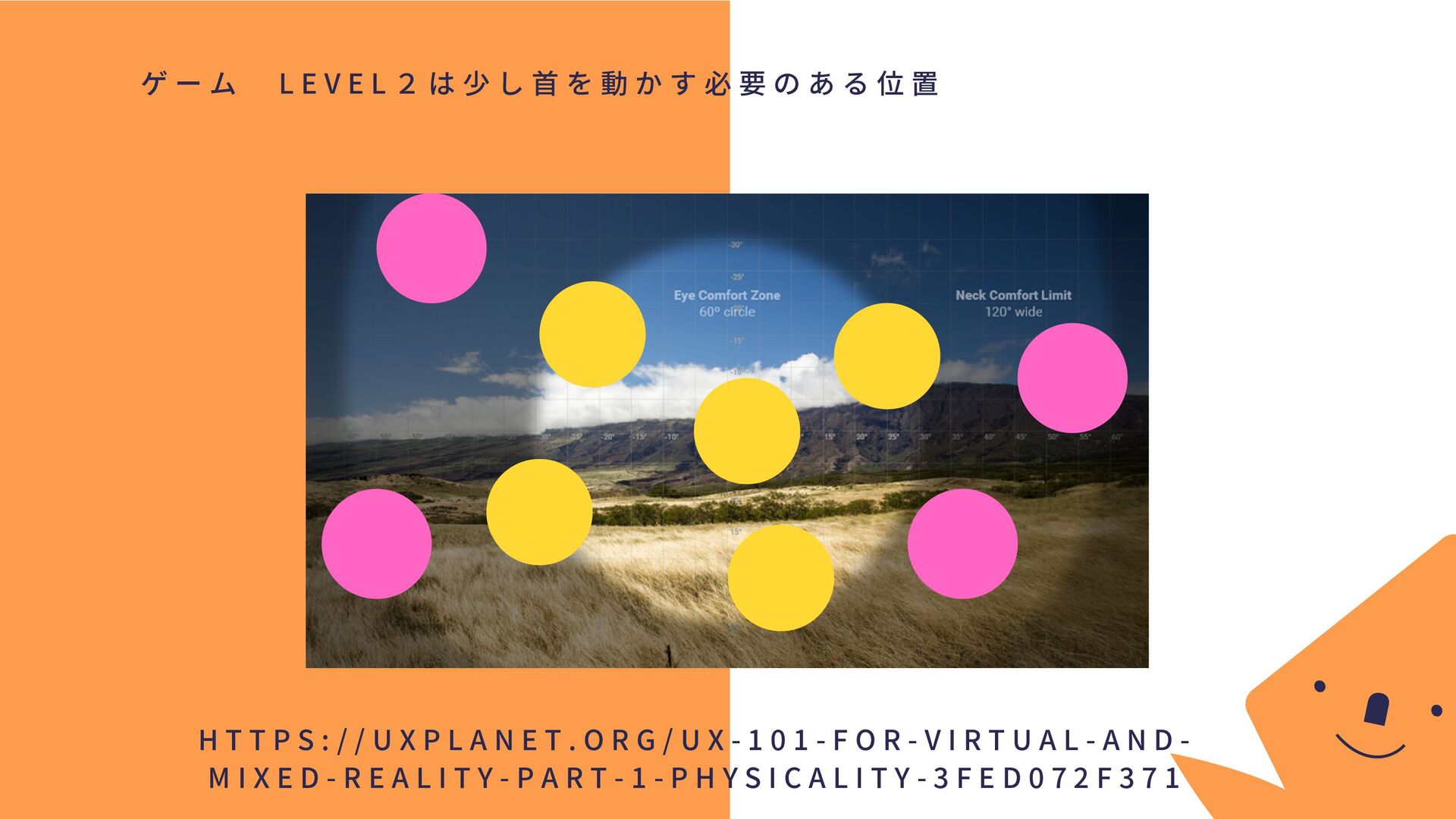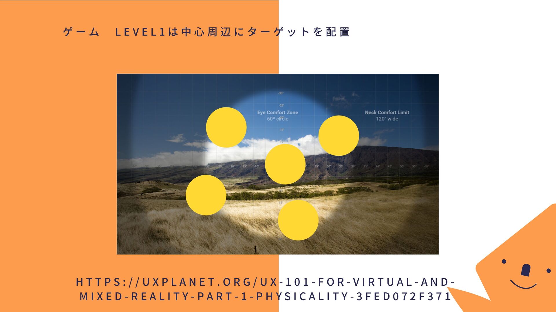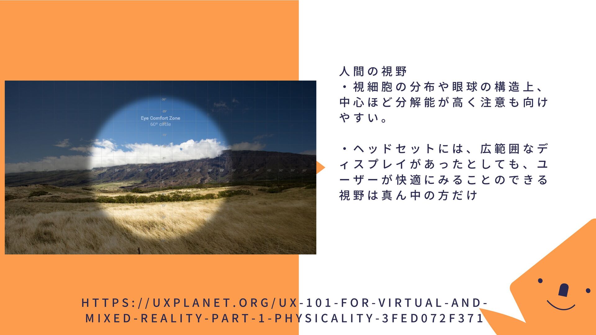 分 布 や 眼 球 の 構 造 上 、 中 心 ほ ど 分 解 能 が 高 く 注 意 も 向 け や す い 。 ・ ヘ ッ ド セ ッ ト に は 、 広 範 囲 な デ ィ ス プ レ イ が あ っ た と し て も 、 ユ ー ザ ー が 快 適 に み る こ と の で き る 視 野 は 真 ん 中 の 方 だ け H T T P S : / / U X P L A N E T . O R G / U X - 1 0 1 - F O R - V I R T U A L - A N D - M I X E D - R E A L I T Y - P A R T - 1 - P H Y S I C A L I T Y - 3 F E D 0 7 2 F 3 7 1