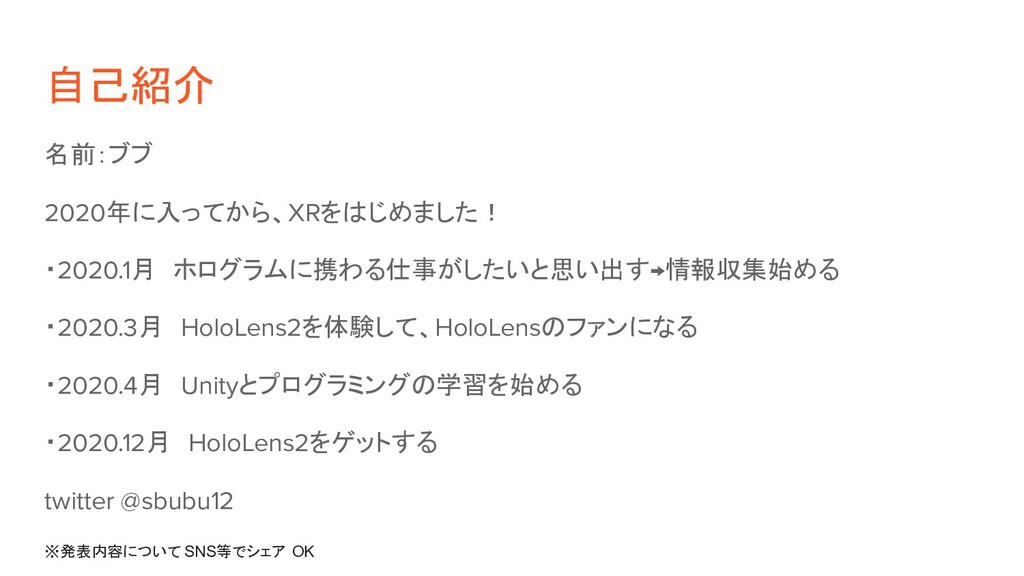 自己紹介 名前:ブブ 2020年に入ってから、XRをはじめました! ・2020.1月 ホログラムに携わる仕事がしたいと思い出す→情報収集始める ・2020.3月 HoloLens2を体験して、HoloLensのファンになる ・2020.4月 Unityとプログラミングの学習を始める ・2020.12月 HoloLens2をゲットする twitter @sbubu12 ※発表内容について
