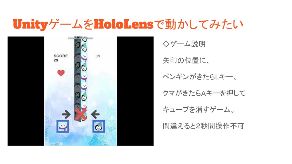 UnityゲームをHoloLensで動かしてみたい ◇ゲーム説明 矢印の位置に、 ペンギンがきたらLキー、 クマがきたらAキーを押して キューブを消すゲーム。 間違えると2秒間操作不可