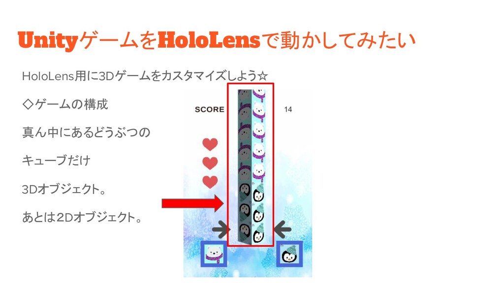 UnityゲームをHoloLensで動かしてみたい HoloLens用に3Dゲームをカスタマイズしよう☆ ◇ゲームの構成 真ん中にあるどうぶつの キューブだけ 3Dオブジェクト。 あとは2Dオブジェクト。