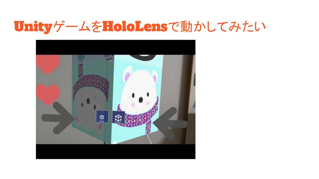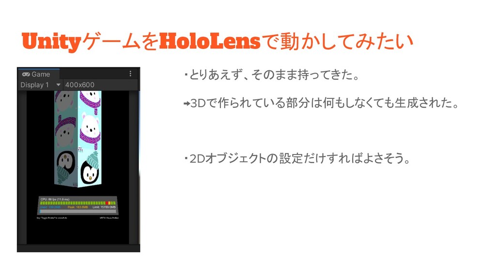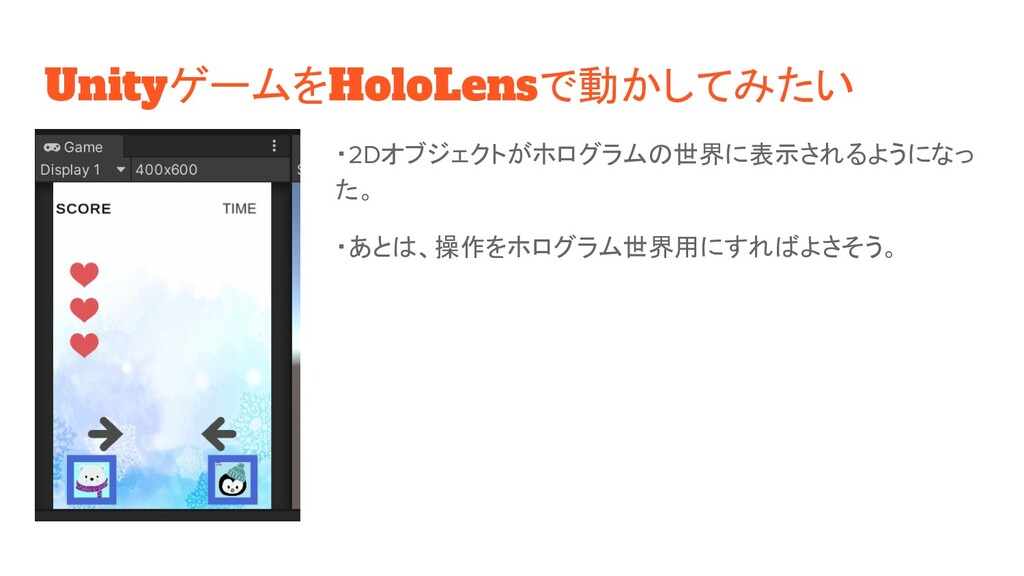 UnityゲームをHoloLensで動かしてみたい ・2Dオブジェクトがホログラムの世界に表示されるようになっ た。 ・あとは、操作をホログラム世界用にすればよさそう。