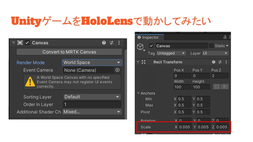 UnityゲームをHoloLensで動かしてみたい ・とりあえず、そのまま持ってきた。 →3Dで作られている部分は何もしなくても生成された。 ・2Dオブジェクトの設定だけすればよさそう。