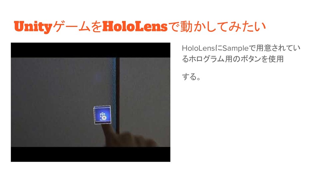 UnityゲームをHoloLensで動かしてみたい HoloLensにSampleで用意されてい るホログラム用のボタンを使用 する。