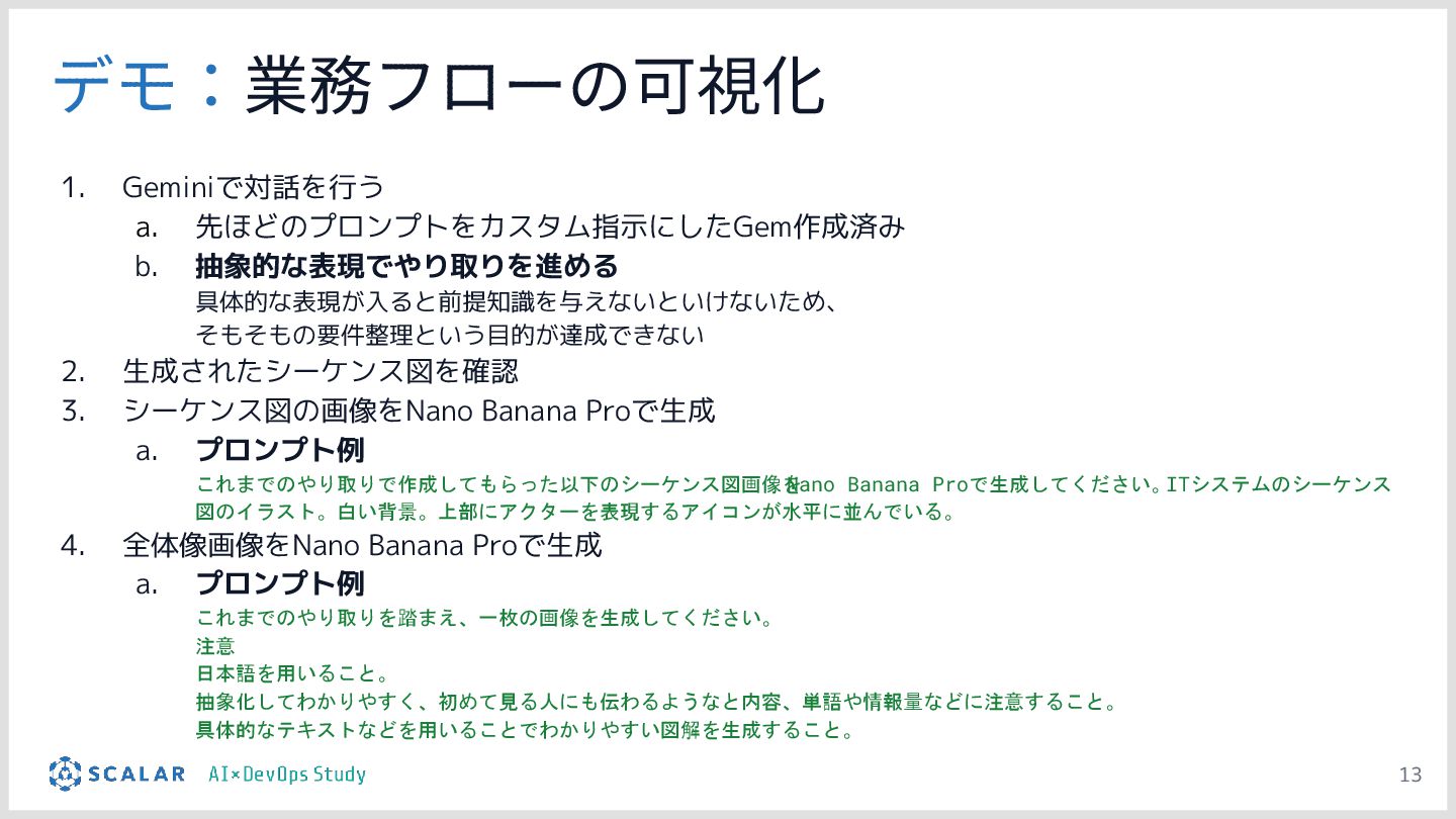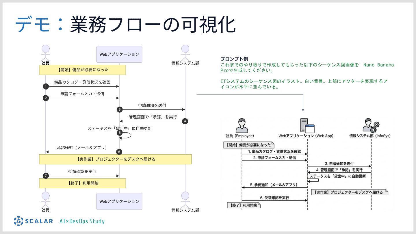 可視化プロセス: 対話からシーケンス図を生成し、さらに画像生成AI(Nano Banana Pro)を用いて直感的なイラスト化を行うことで、エンジニア以外にも伝わる合意形成を実現
