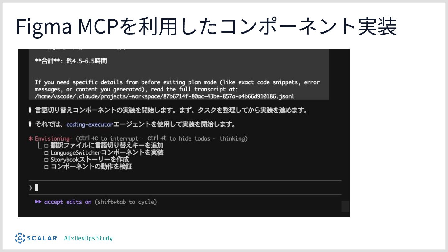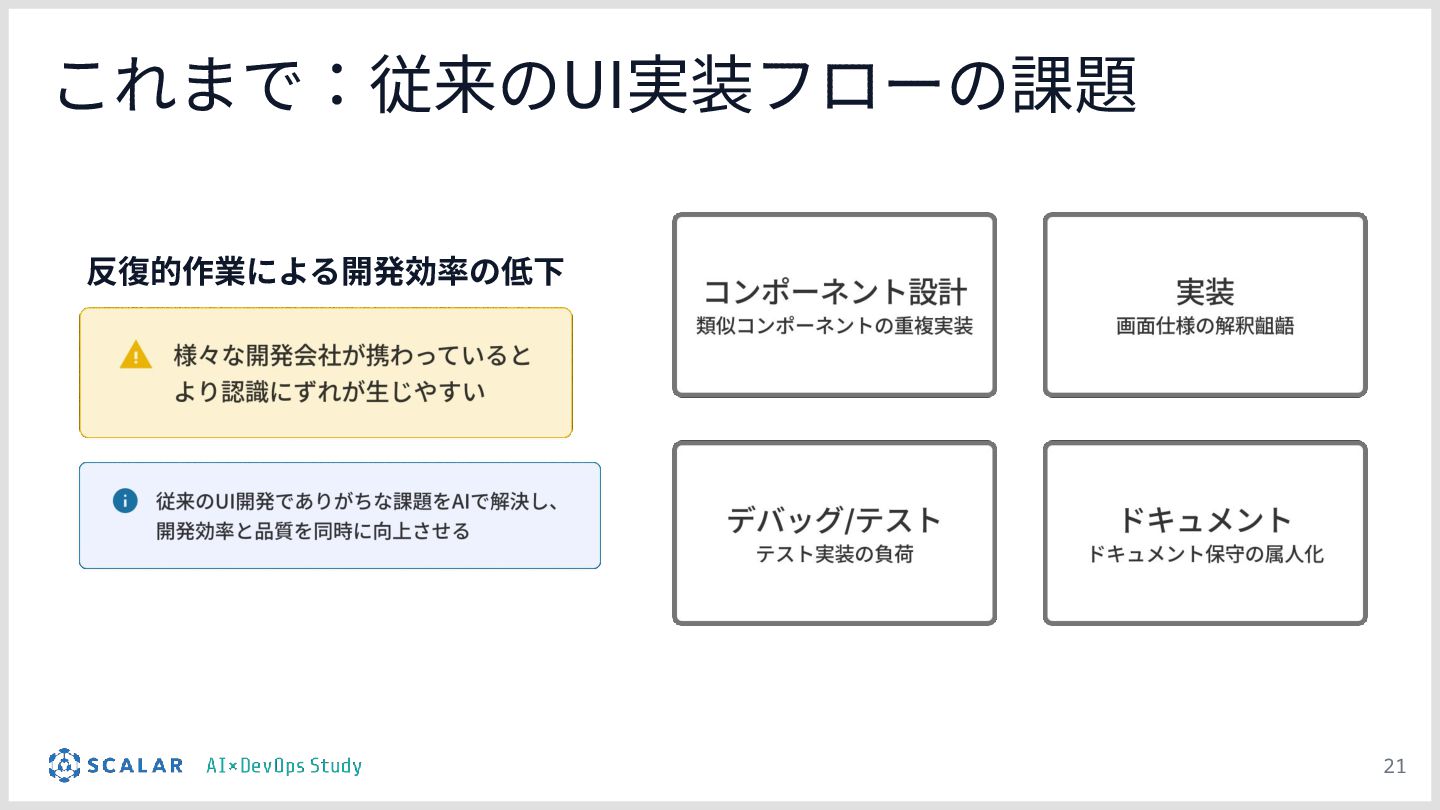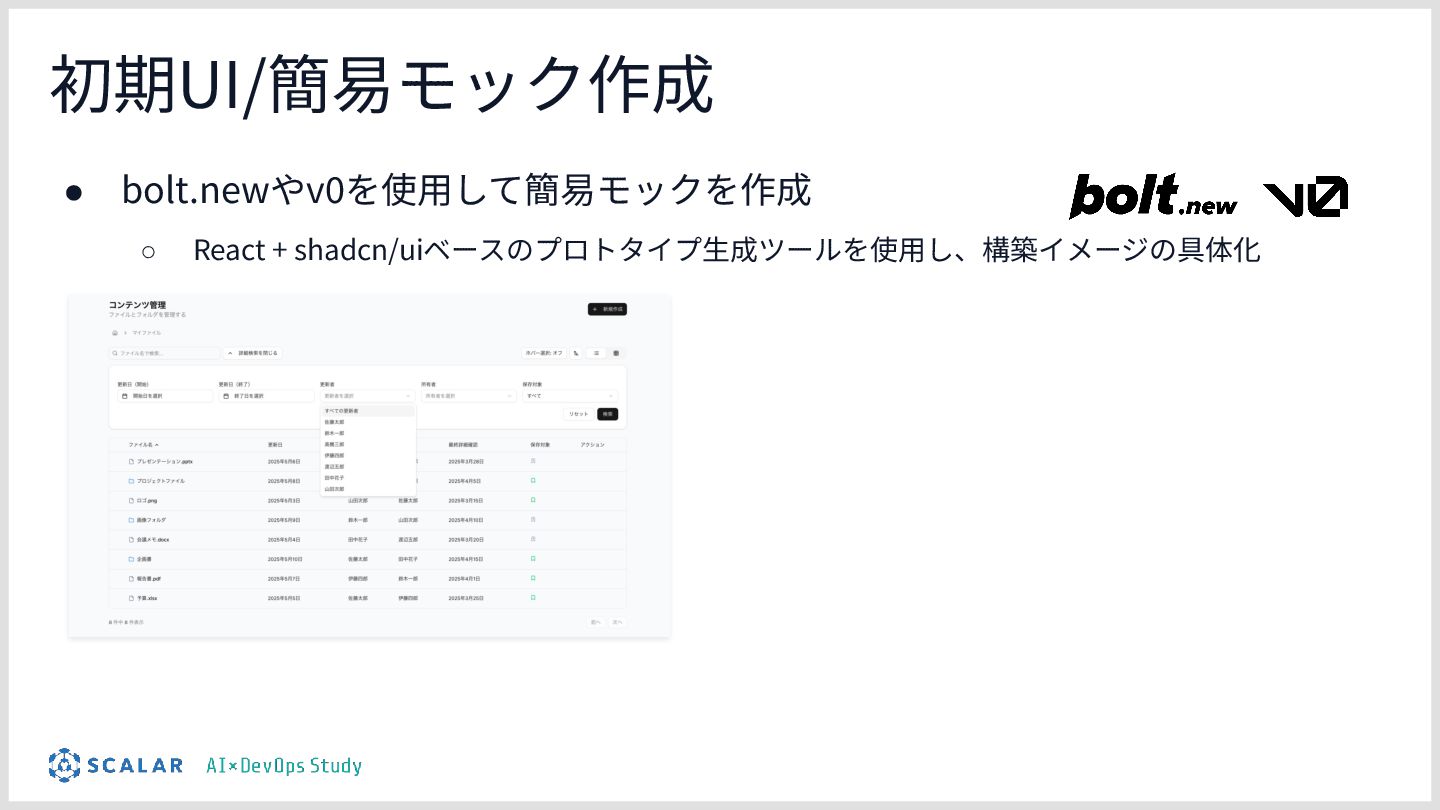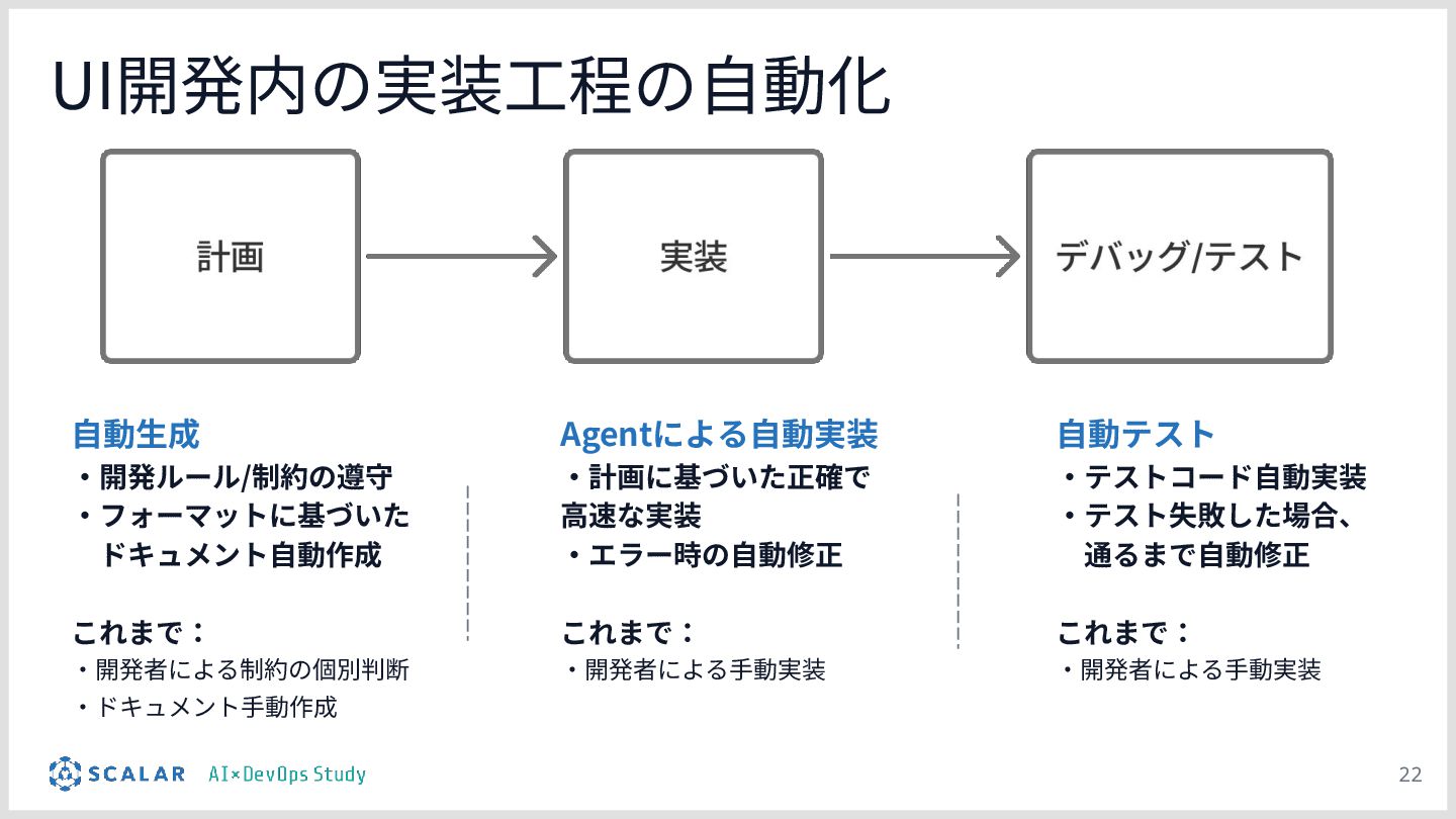 開発フローの変革: 要件定義からUI設計、実装、テストに至るまで、AIエージェントを組み込んだ新しい開発フローの全体像を共有