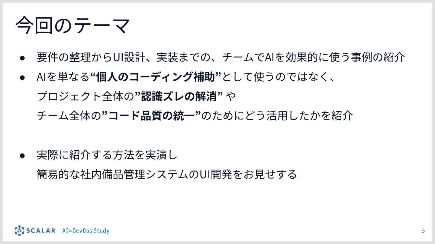 株式会社ScalarではAIを使ったチーム開発を進めており、参画しているメンバーや協力会社の方から、具体的なAI駆動開発を実施する方法、その中で生まれたマイクロサービスアーキテクチャを使用したAI駆動開発の事例や実際に使えるエージェントについてお話頂き、参加者の皆様と知識の共有や交換を目的としています。