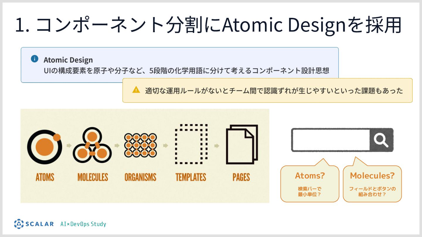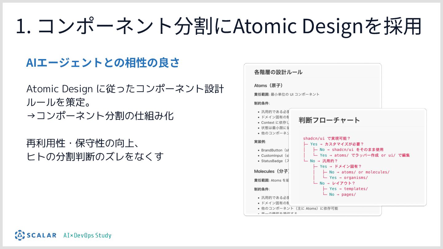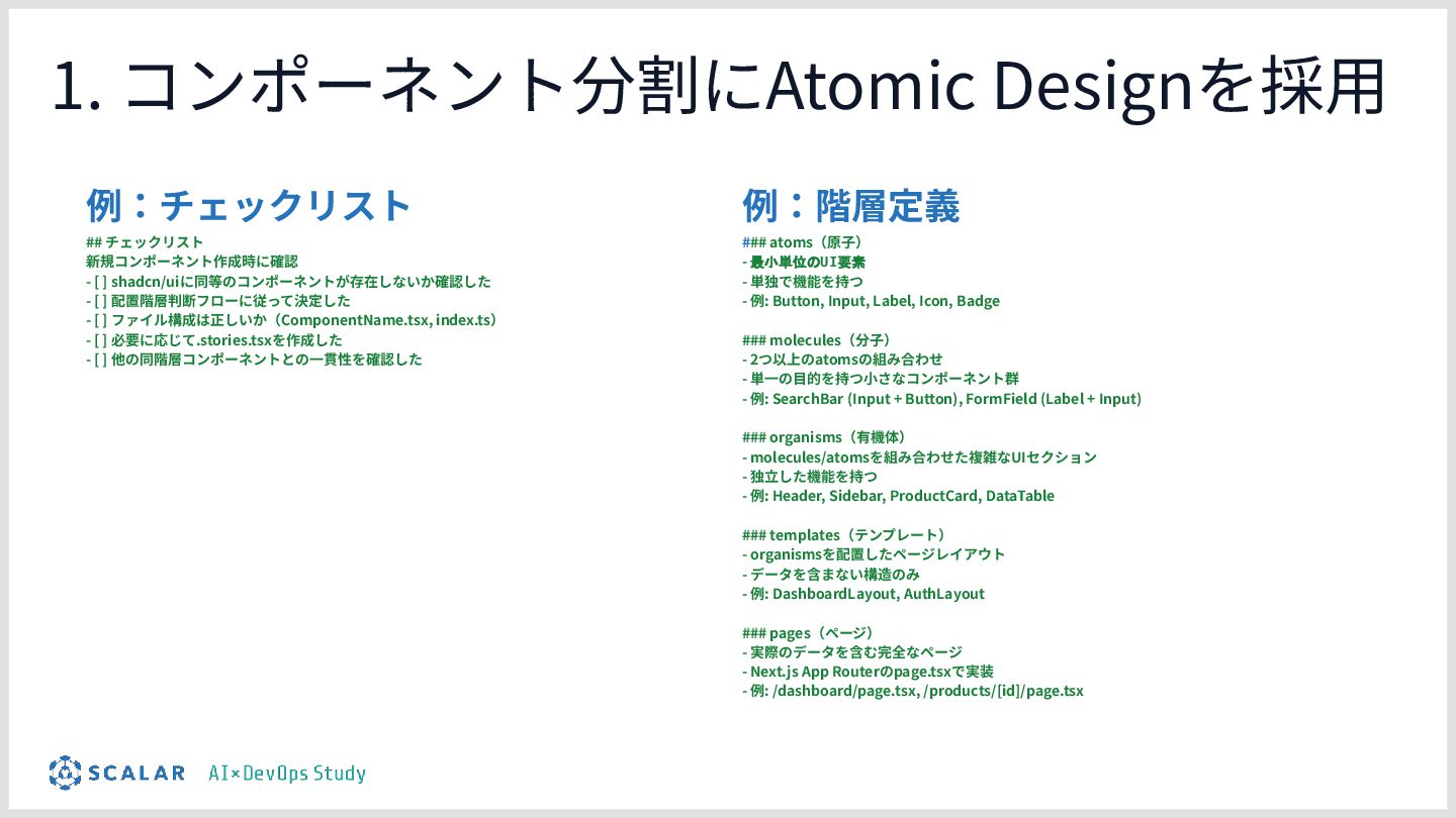 Atomic Designの採用: AIエージェントとの相性を考慮し、コンポーネント設計にAtomic Designを採用して分割判断のズレを排除