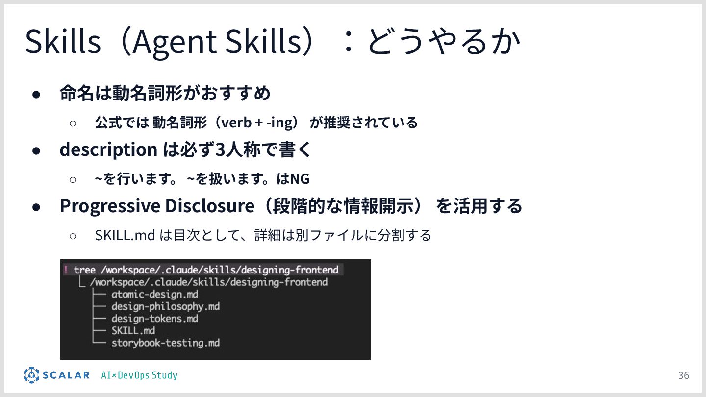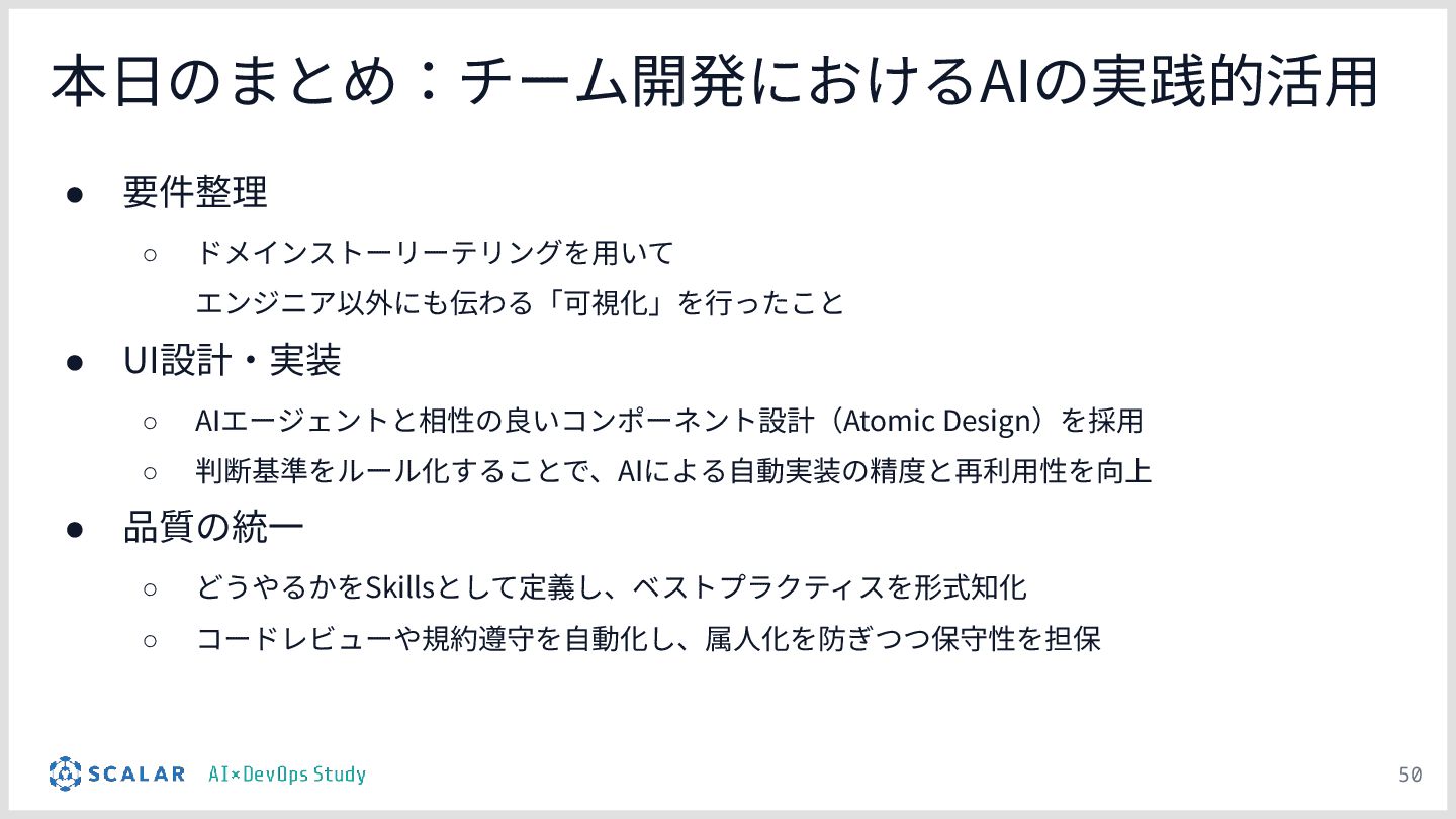ベストプラクティスの資産化: 開発の「どうやるか(How)」をMarkdown形式のSkillsとして定義し、AIに参照させることで、属人化を防ぎつつ保守性の高いコードベースを維持